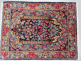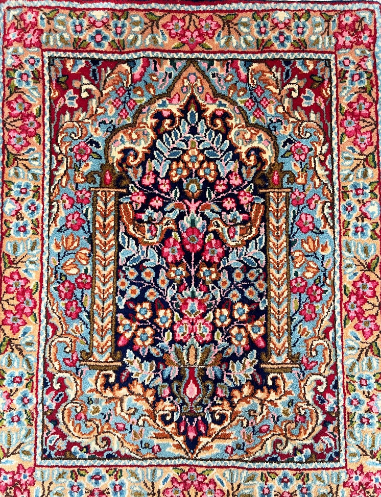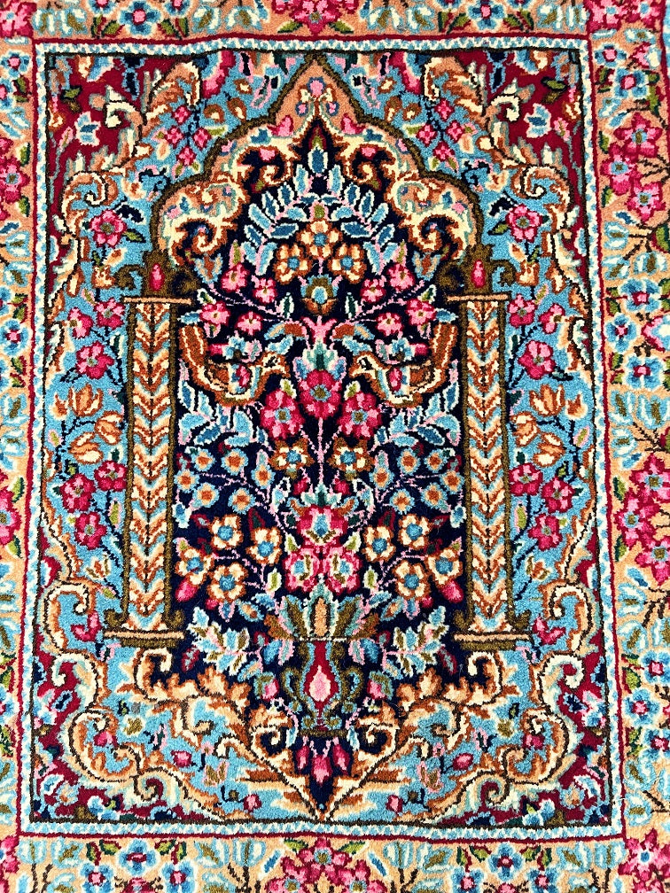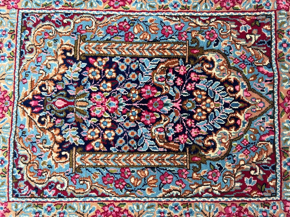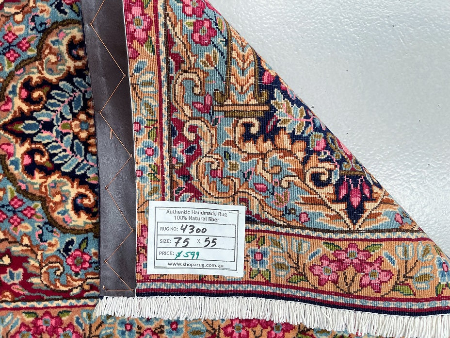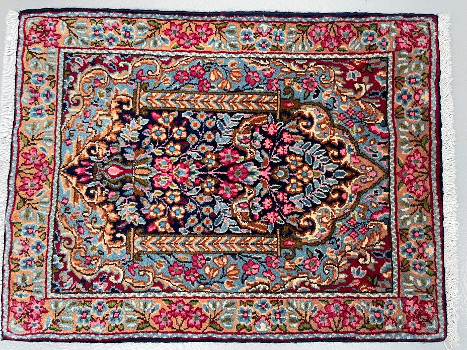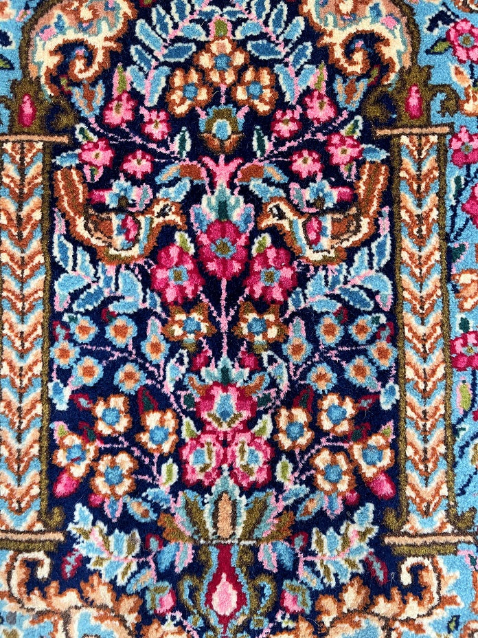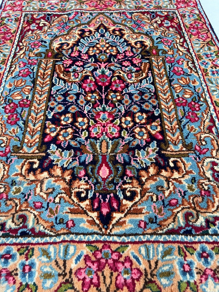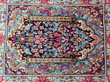 Fine Authentic Handmade Persian Kerman Rug. Above All We Do Have This Rug In A Matching Pair. It also Has A Pure Lamb’s Wool Pile on Cotton Base. Indigo Blue, Beige, green, Pink And Red Tone Dyed Using Traditional Methods.