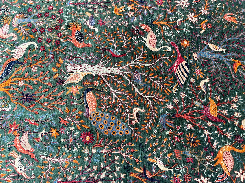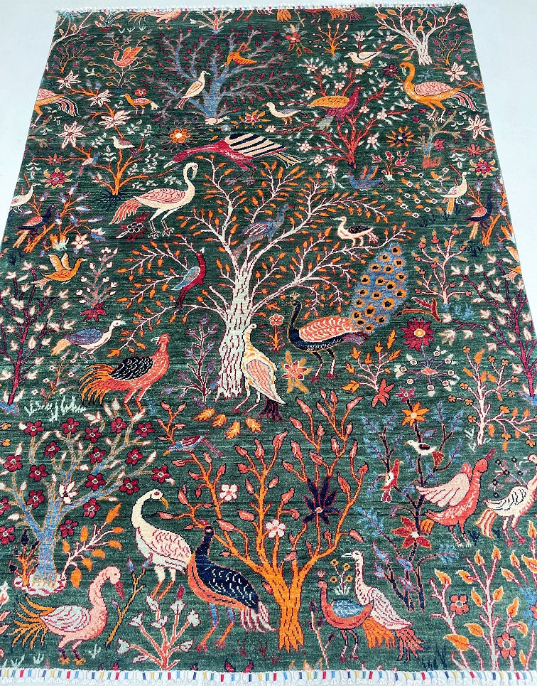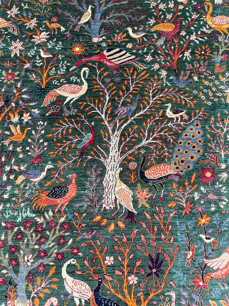 This Exquisite Hand Knotted Afghan Chobi Rug Features The Timeless Garden Of Paradise Design, Beautifully Woven On A Rich Forest Green Field. A Magnificent Central Tree Of Life Rises Through The Composition, Surrounded By An Enchanting Array Of Birds, Peacocks, Floral, And Delicate Foliage – Symbolizing Nature, Harmony, And Abundance.