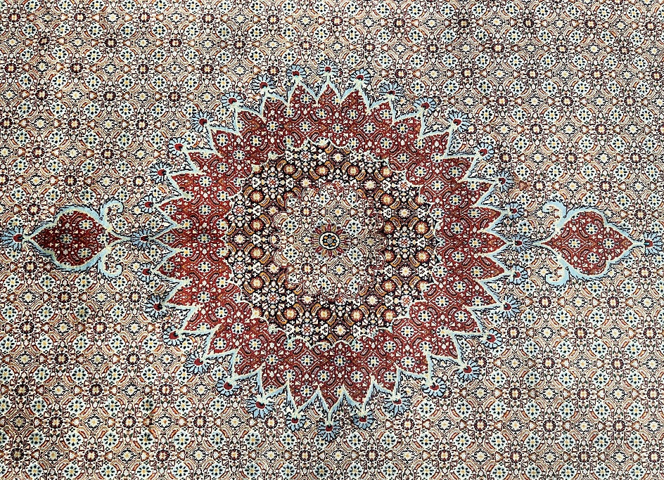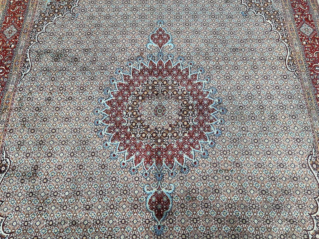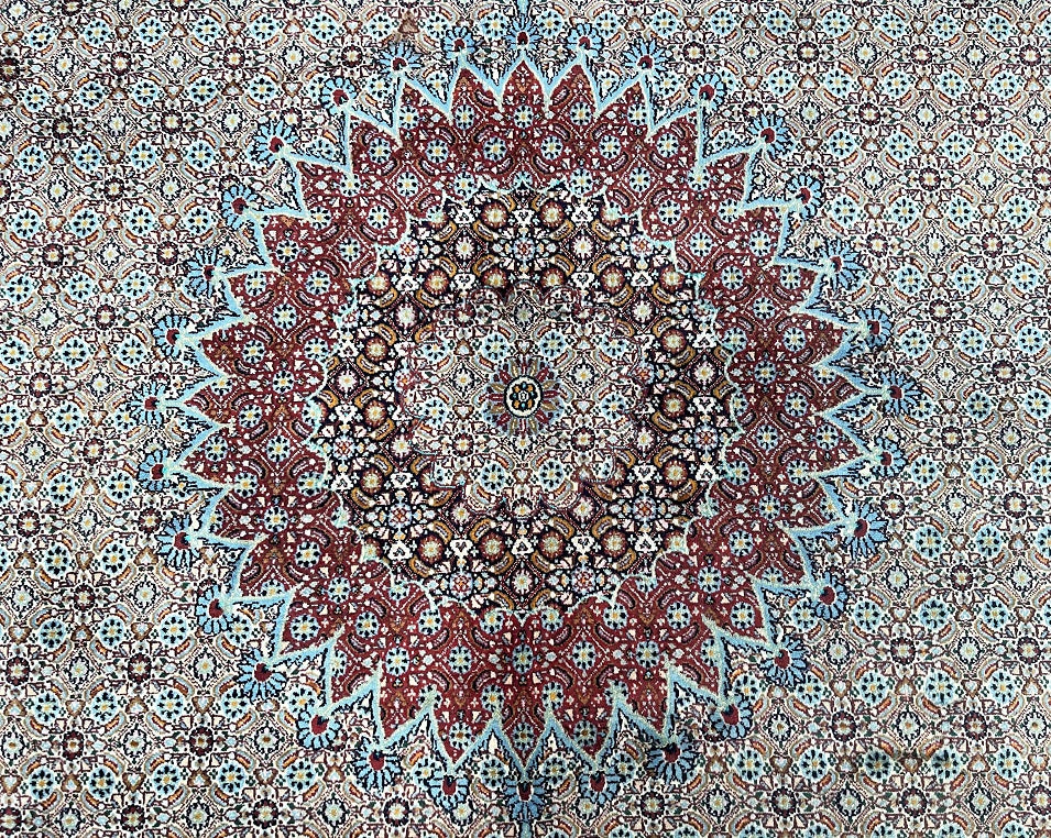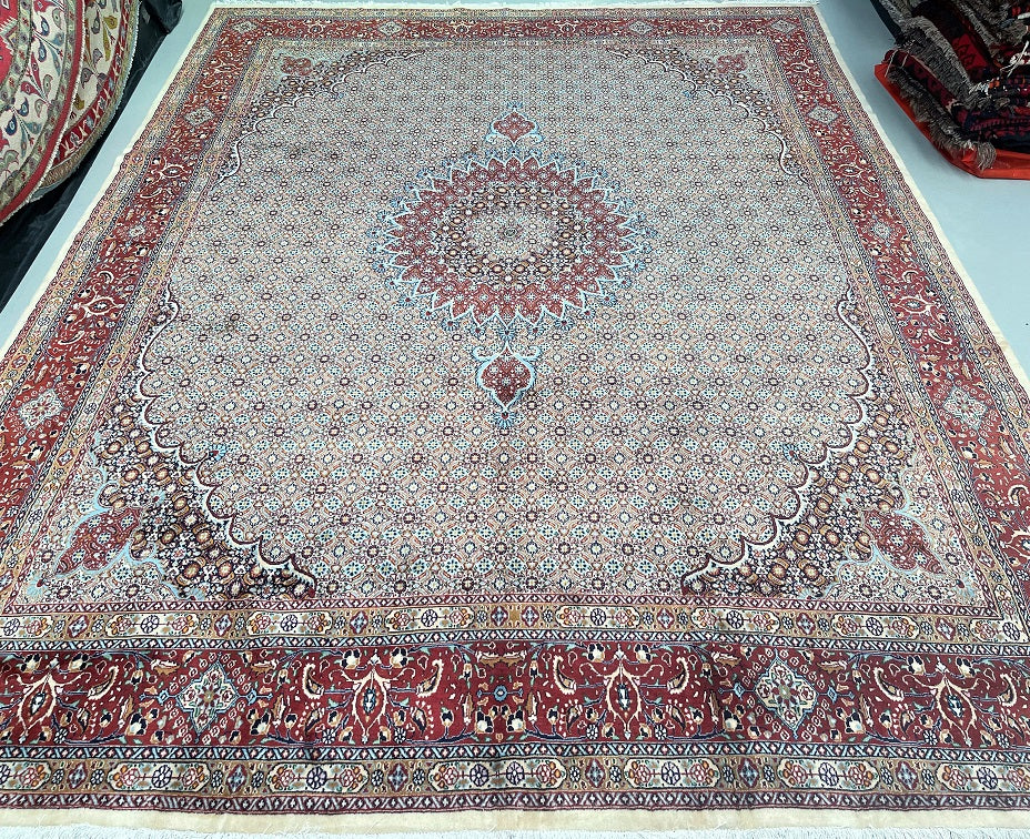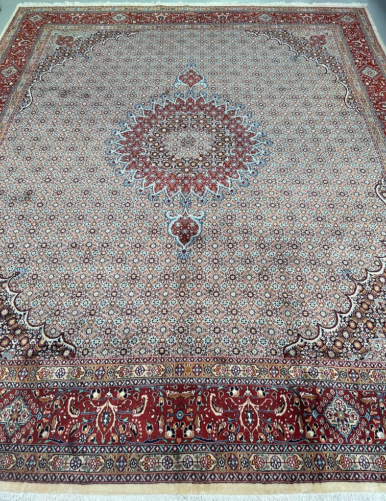 Fine Quality Large Room Size Handmade Persian Birjand Mood Rug. Above All It Has A Lamb’s Wool And Silk inlaid Pile On Cotton Base. Beige, Blue, Orange, Green, Pink And Terracotta/Red Tones Dyed Using Traditional Methods. Pin Point Quality Rug That Would Add Instant Style to Any Room.