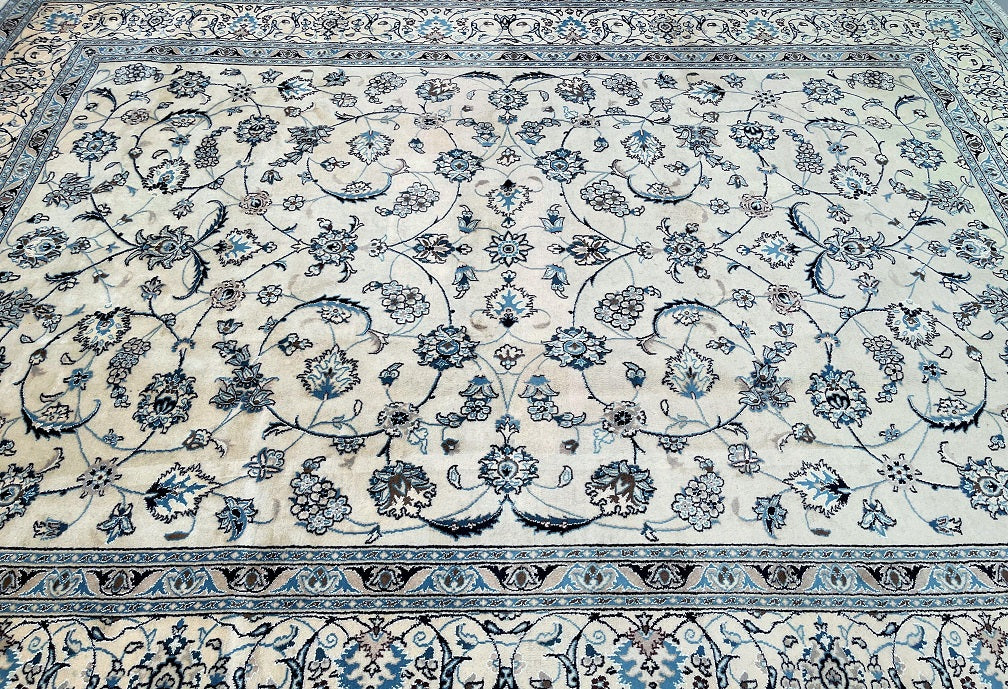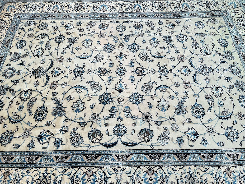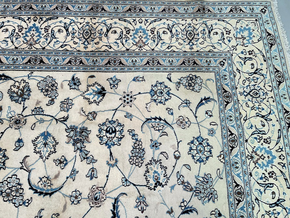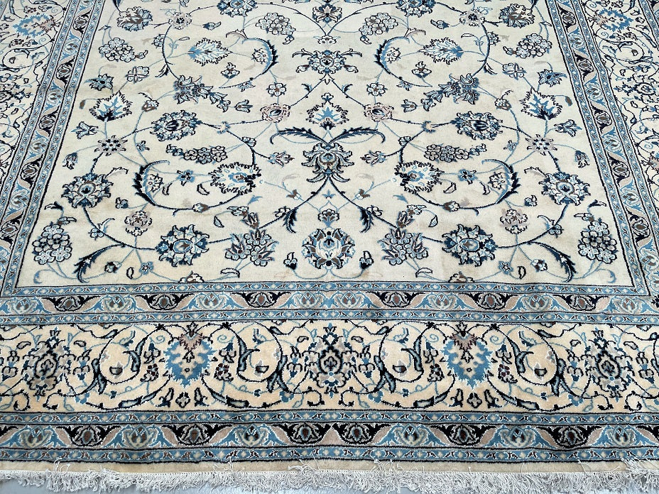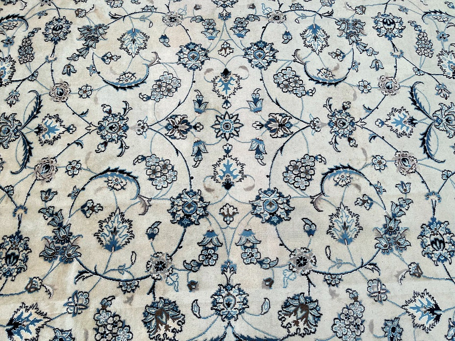 Large Room Size Vintage Persian Nain Carpet Woven Circa 1980’s. Above All It Is Hard To Get Handmade Vintage Nain Rugs In 4x3m Size. It Also Has A Wool Pile on Cotton Base. Cream, Beige, Light Blue, Black/Indigo Blue And Brown Tone Dyed Using Traditional Methods.