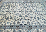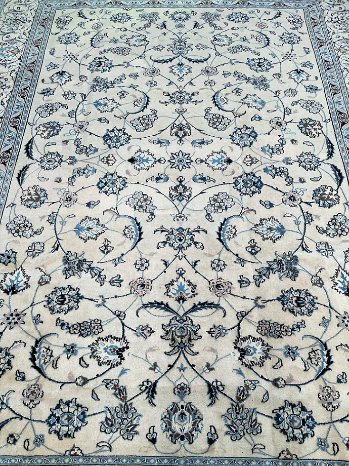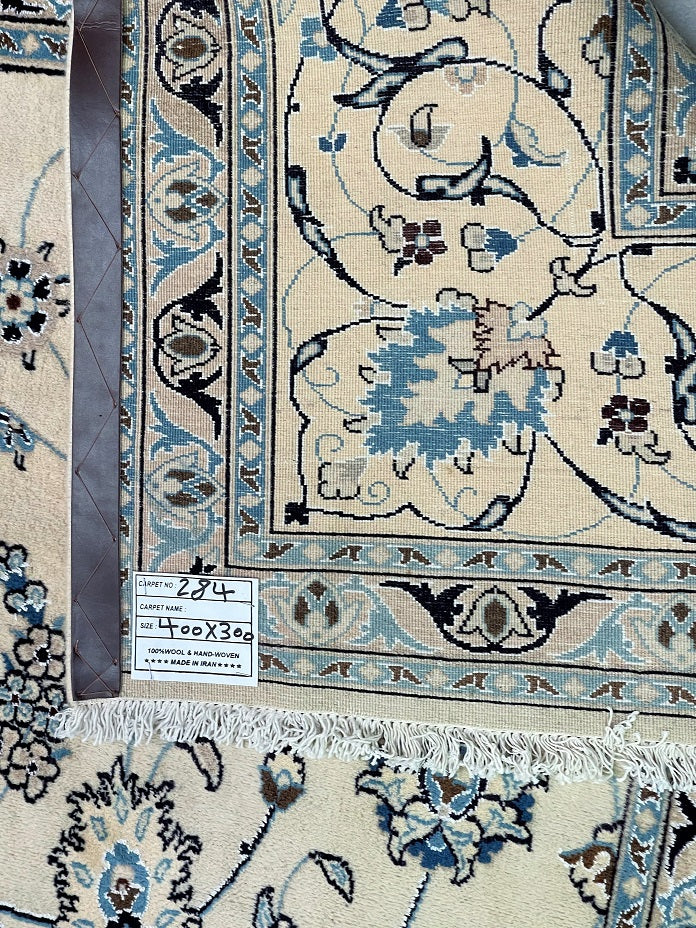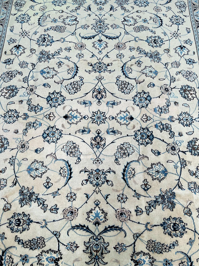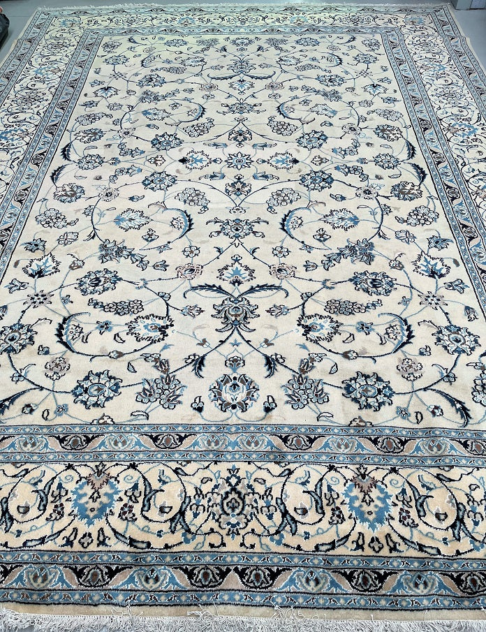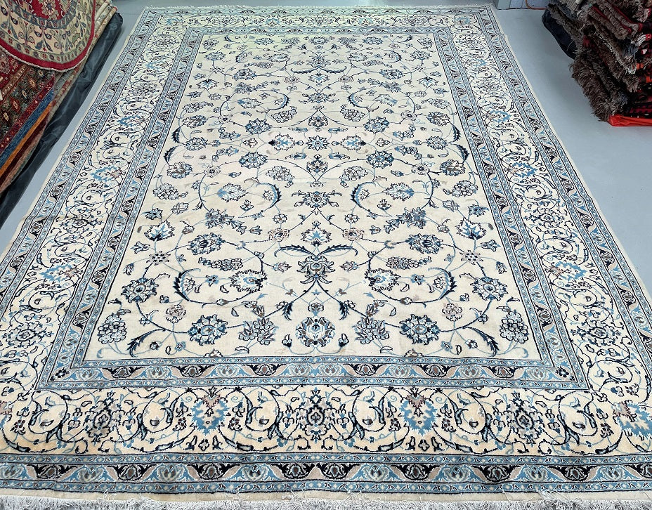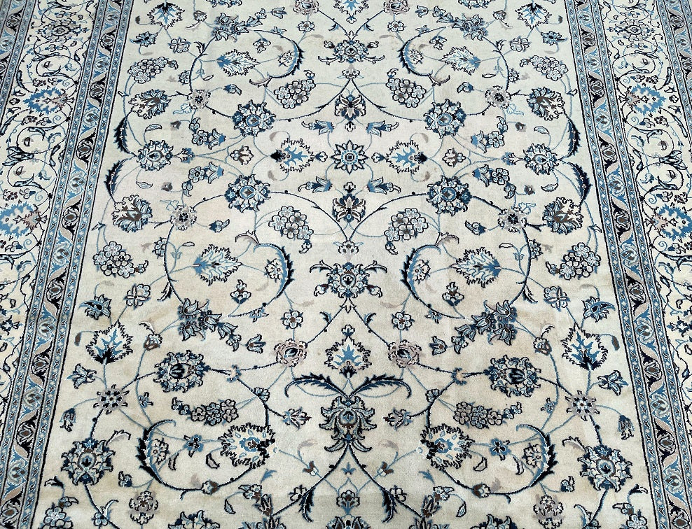 Large Room Size Vintage Persian Nain Carpet Woven Circa 1980’s. Above All It Is Hard To Get Handmade Vintage Nain Rugs In 4x3m Size. It Also Has A Wool Pile on Cotton Base. Cream, Beige, Light Blue, Black/Indigo Blue And Brown Tone Dyed Using Traditional Methods.