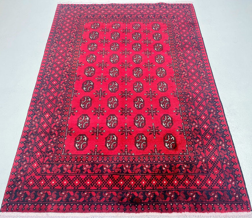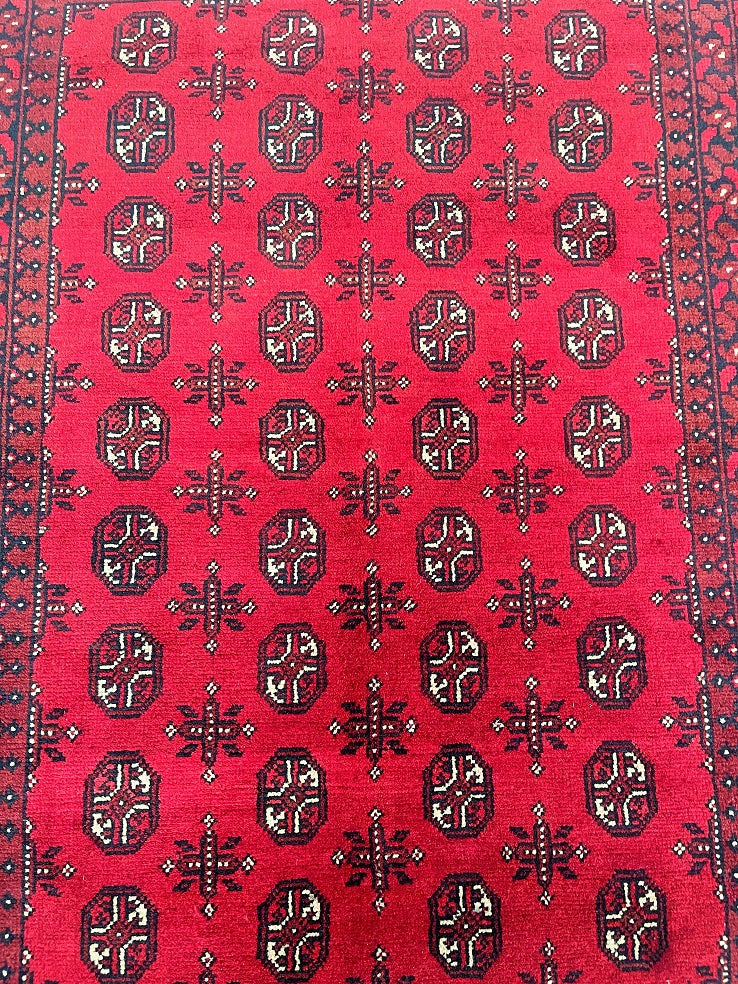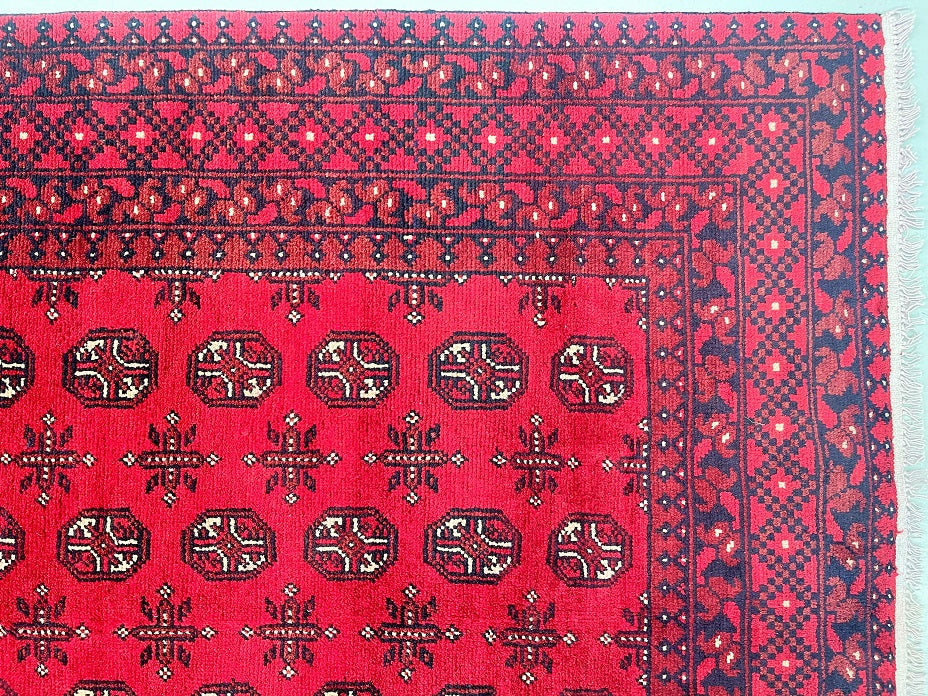 Gorgeous Coffee Table Size Handmade Afghan Aqcha Rug. Above All It Has A Pure Hand Spun Wool Pile On Cotton Base. It Also Has A Rich Red/Burgundy Tone Dyed Using Traditional Methods.
