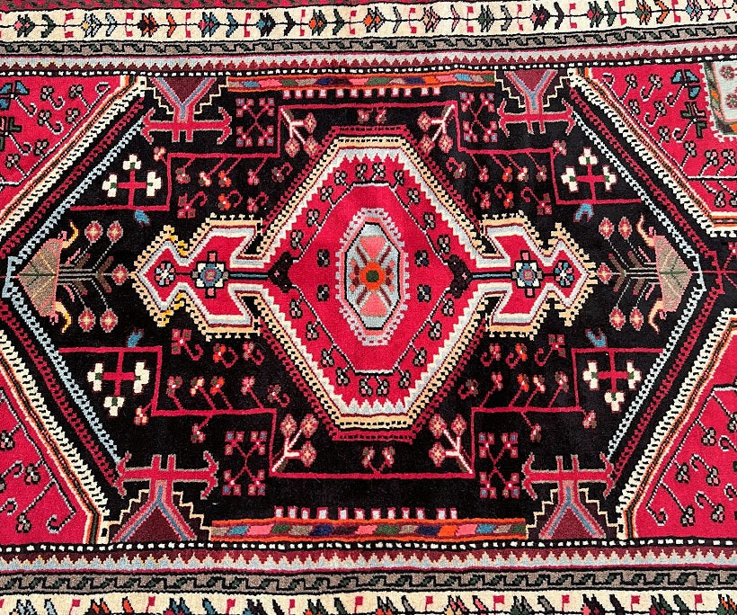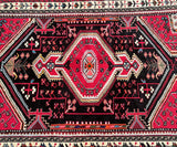 The rug showcases a captivating color palette, including black, red, beige, green, pink, and blue tones. These colors are achieved through time-honored dyeing methods, adding depth and richness to the design. The central medallion and broken branches geometric pattern create a visually striking and balanced composition.