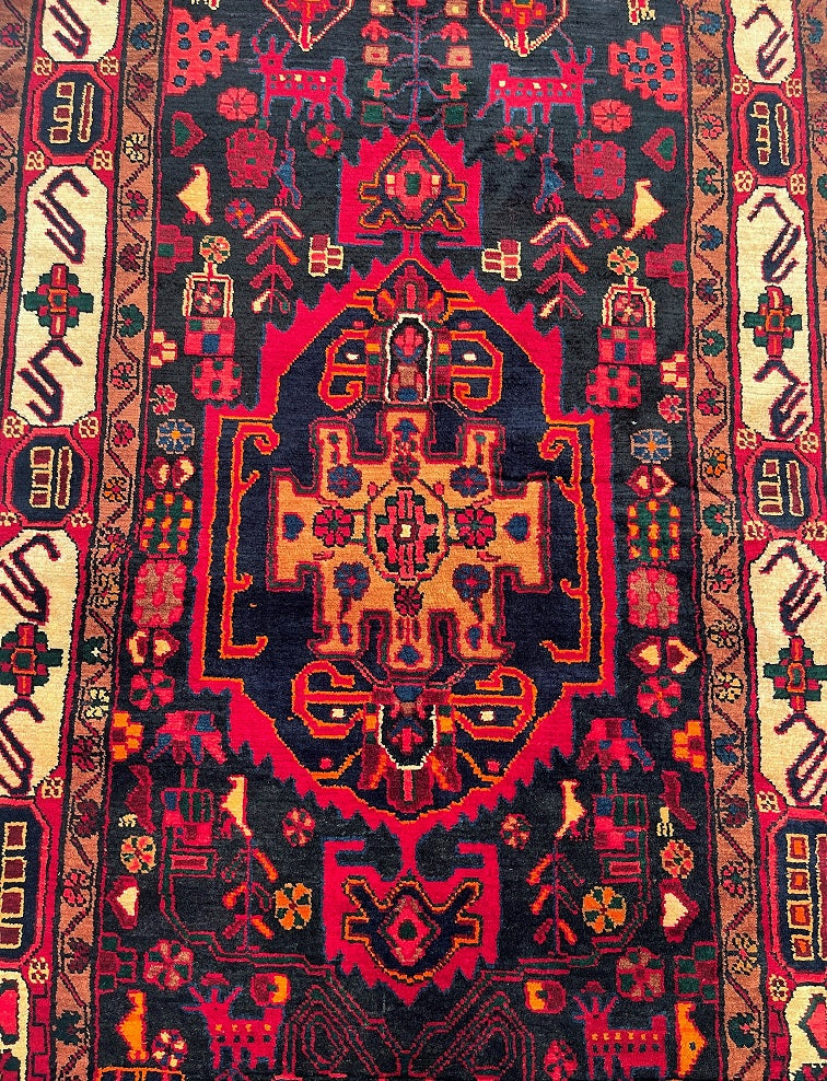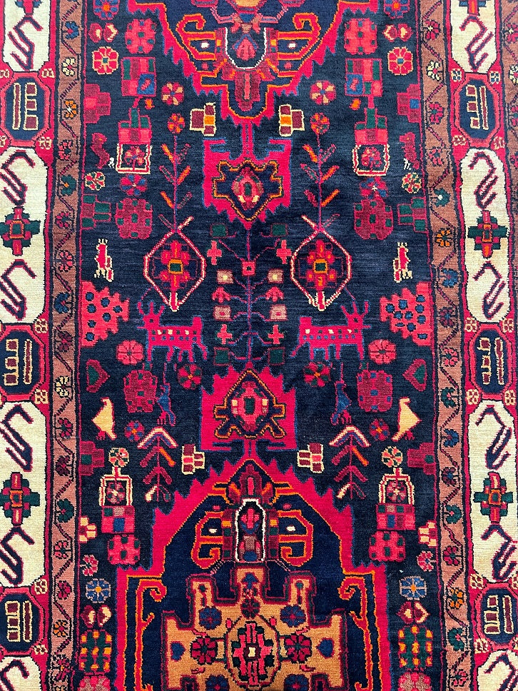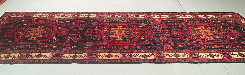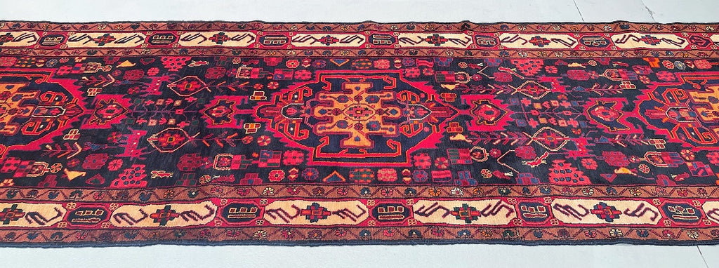 Extra Long Authentic Handmade Persian Tuserkan Hall Runner. Above All It A Has a Pure Hand Spun Wool Pile On Cotton Base. Deep Indigo Blue/Black, Beige, Gold, Orange And Pink Tones Dyed Using Traditional Methods.