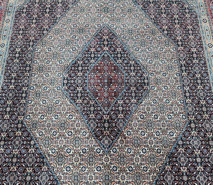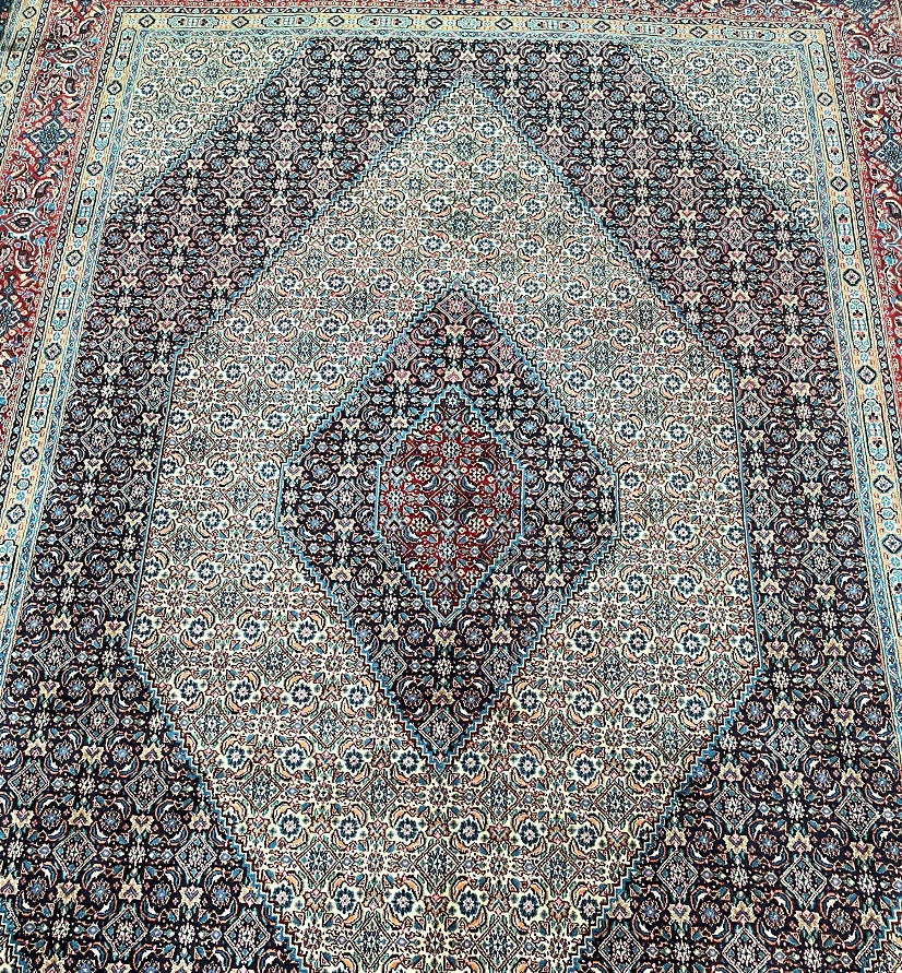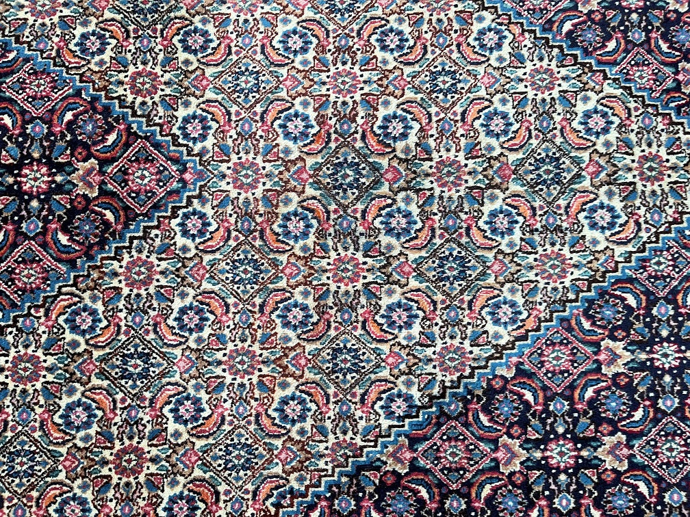 Large Room Size Authentic Handmade Vintage Persian Birjand Rug. Above All It Is Hard To Find Pattern In Original Handmade Rugs. It Also Has A Pure Lamb’s Wool Pile On Fine Cotton. Beige, Blues, Orange And Red Tone Dyed Using Traditional Methods.