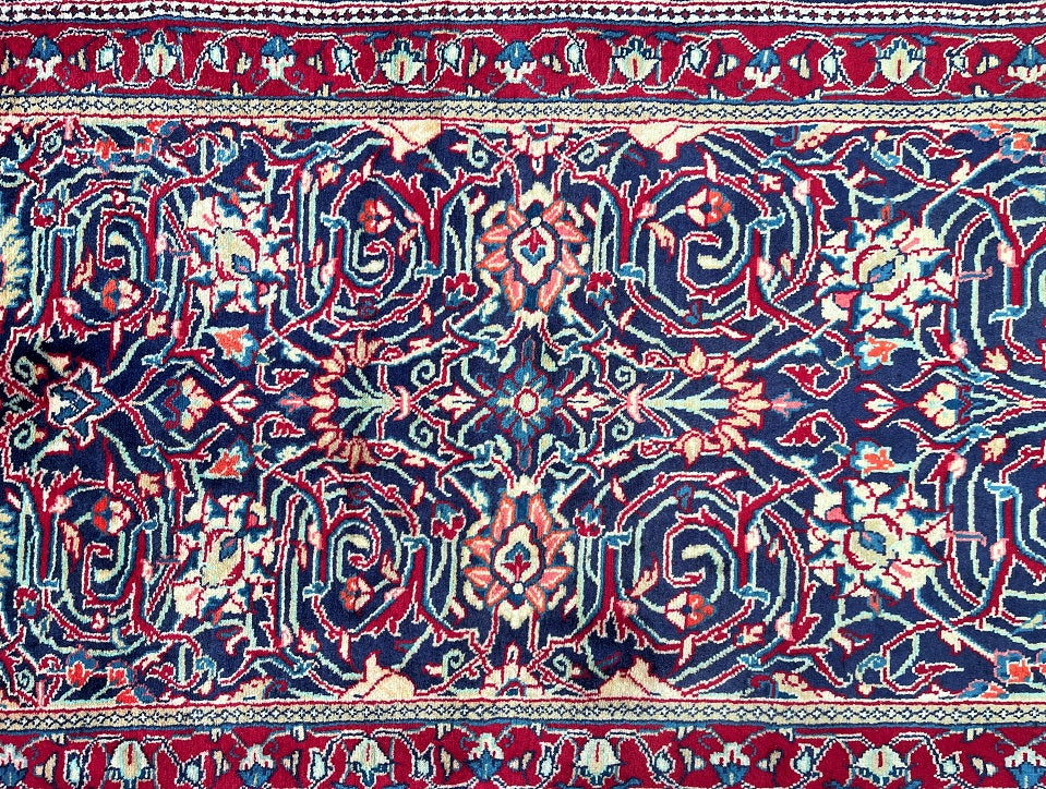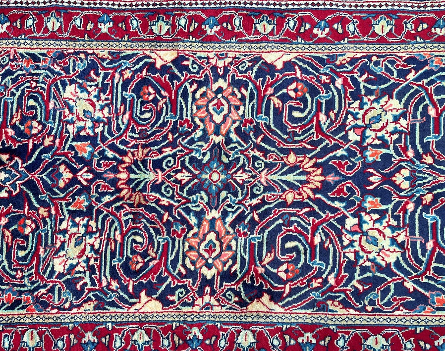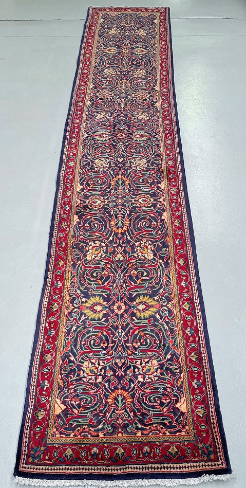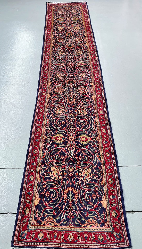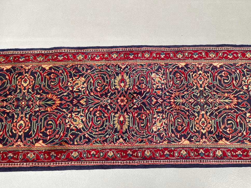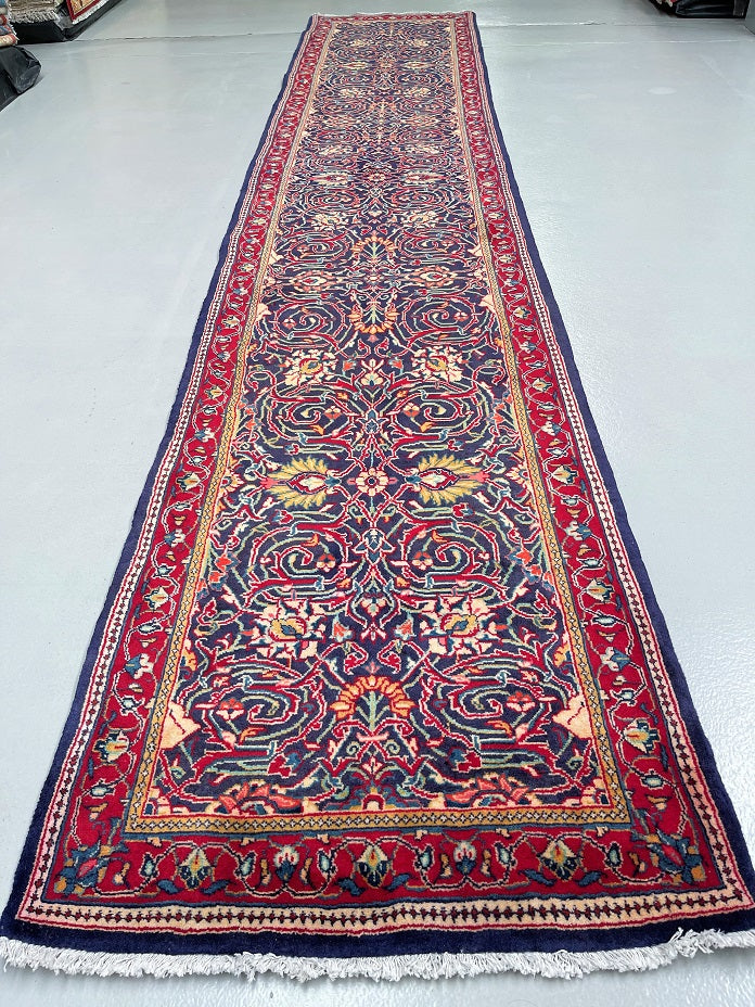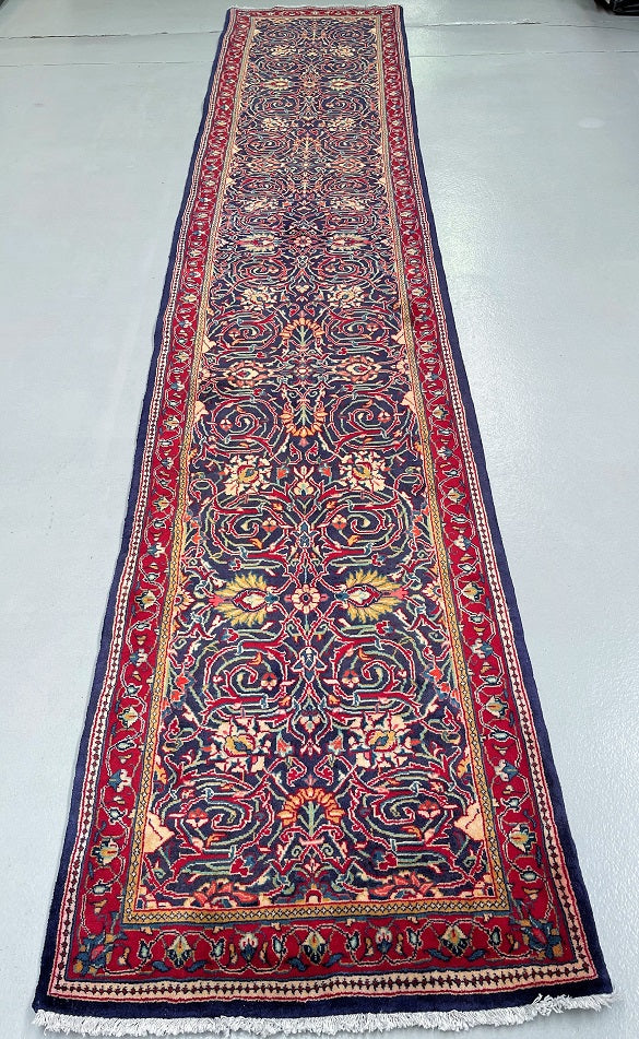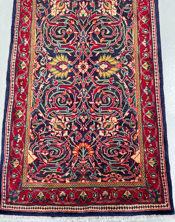Authentic Handmade Vintage Persian Sarough Hall Runner Circa 1980’s. Above All It Has A Pure Lamb’s Wool Pile On Cotton Base. It Also Has An Indigo Blue Tones Dyed Using Traditional Methods.