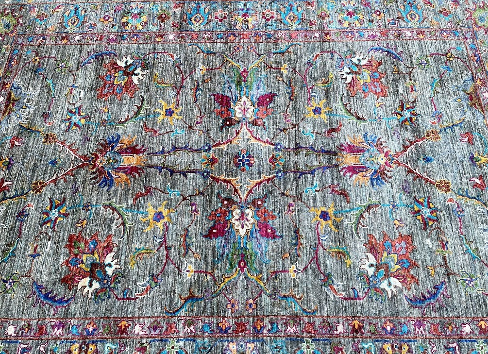 Decorative Room Size Handmade Afghan Chobi Rug. Above All It Is Pure Hand Spun Merino Wool Pile On Cotton Base. Modern Olive Green, Beige, Grey, Pink, Aqua Marine, Orange And Gold Tone Dyed Using Traditional Methods (Vegetable Dyes). Last Of True Woven Nomadic Art.