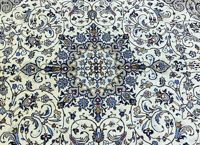 Full Room Size Authentic Handmade Persian Kashan Rug. Above All This Is Also An Original Handmade Persian Rug Not An Indian Or Chinese Imitation. Kashan Is A City In Central Persia. It Is Renowned To Produce Some Of The Best Quality Wool Rugs And It Is Popular Among Persians. This Rug Has A Pure Lamb’s Wool Pile On Cotton Base. Beige Tone With Touch Of Blue And Brown Dyed Using Traditional Methods.