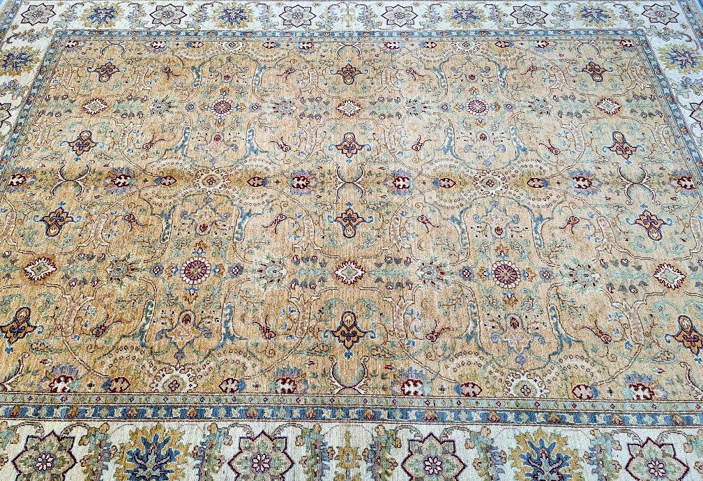 Unique Large Room Size Hand Knotted Afghan Chobi Rug. Above All It Has A Pure Hand Spun Wool Pile On Cotton Base. Gold, Beige, Pistachio, Blue And Maroon Tone Dyed Using Traditional Methods (Vegetable Dyes). Last of True Woven Nomadic Art.