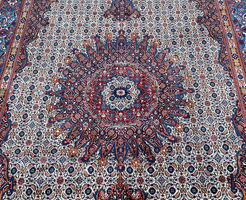 Full Room Size Authentic Handmade Persian Birjand Rug. Above All It Has A Timeless Pattern Which Is Also Unique And Decorative. It Also Has A Pure Lamb’s Wool Pile On Cotton Base. Beige, Blue, Orange And Red Tones Dyed Using Traditional Methods.