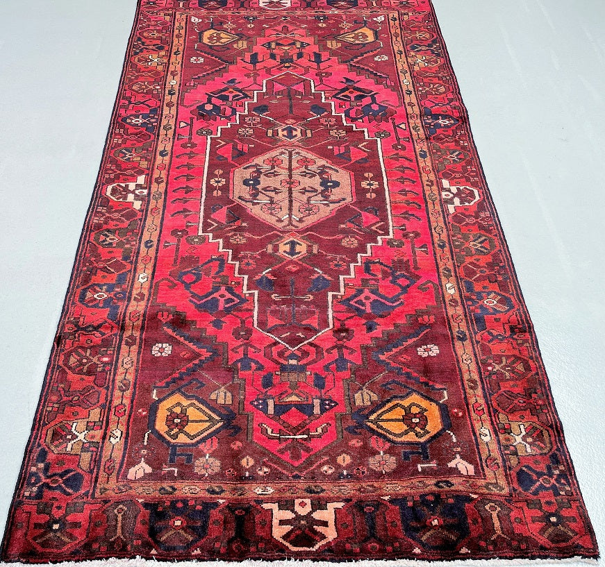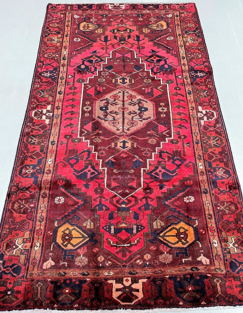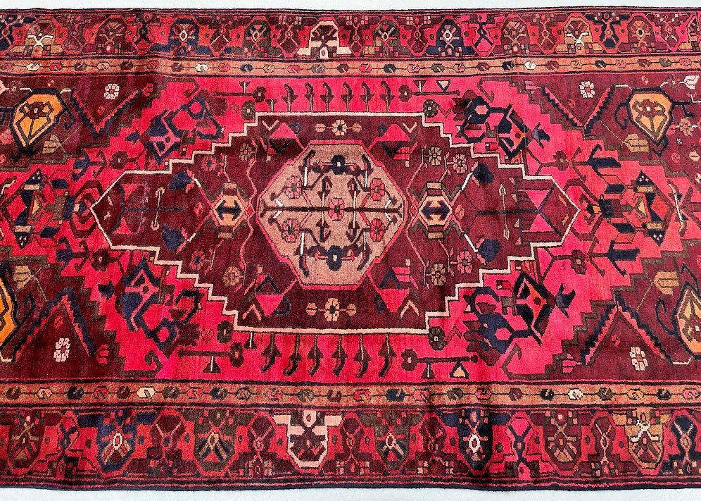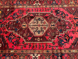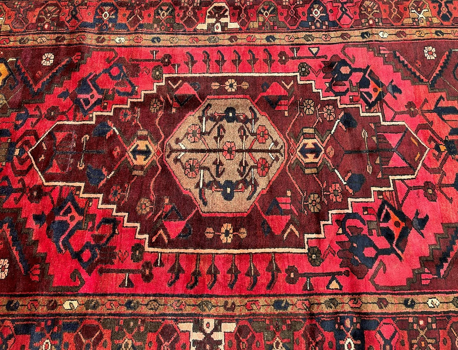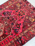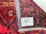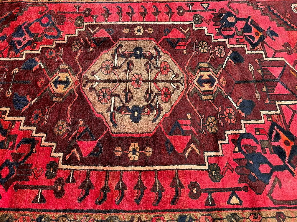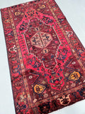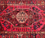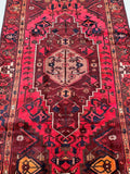 Coffee Table Size Authentic Handmade Tribal Persian Khamseh Rug. Above All It Is A Unique Hand Crafted Nomadic Rug. Pure Hand Spun Wool Pile On Cotton Base. It Also Has a Rustic Red, Indigo Blue, Maroon, Brown, Pink And Green Tone Dyed Using Traditional Methods.
