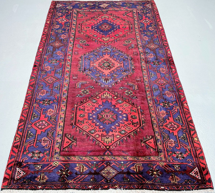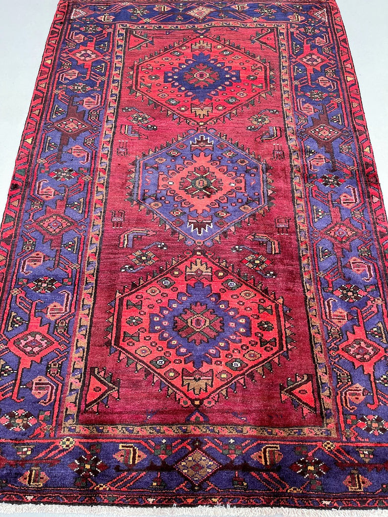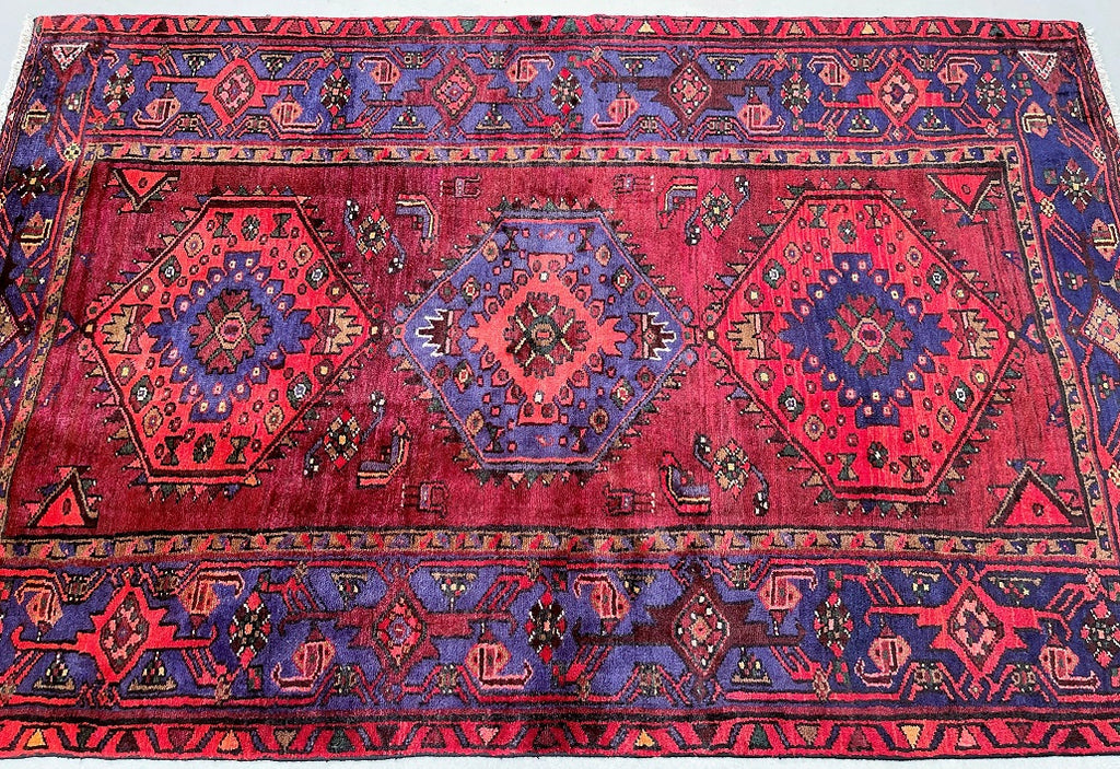 Coffee Table To Room Size Handmade Persian Khamseh Rug. Above All It Has A Pure Hand Spun Wool Pile On Cotton Base. It Also Has An Scarlet Red, Blue With Hint Of Purple, Dark Pink, Brown And Green Tone Dyed Using Traditional Methods.