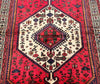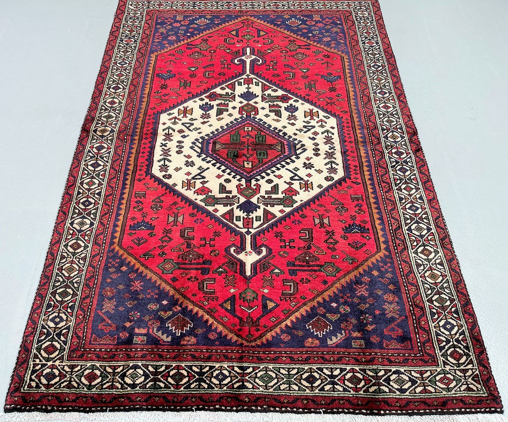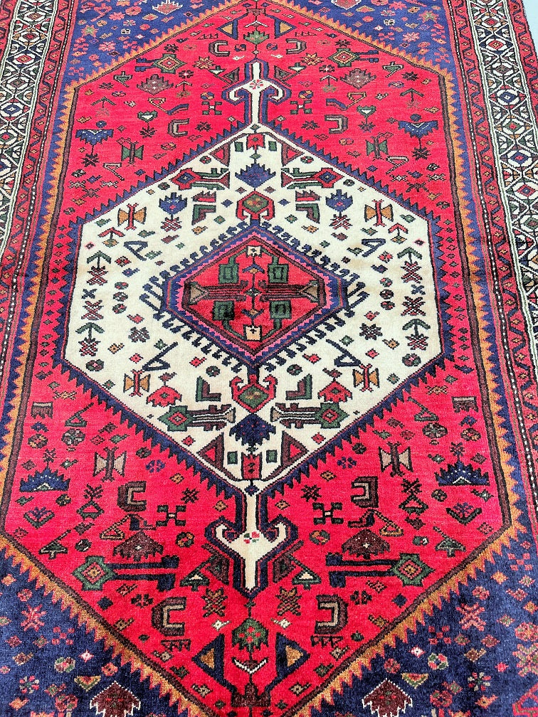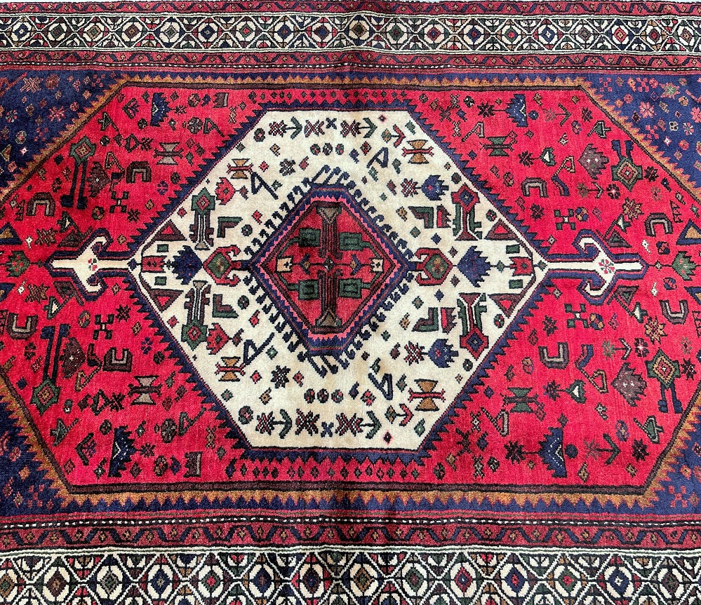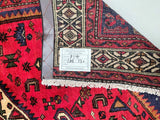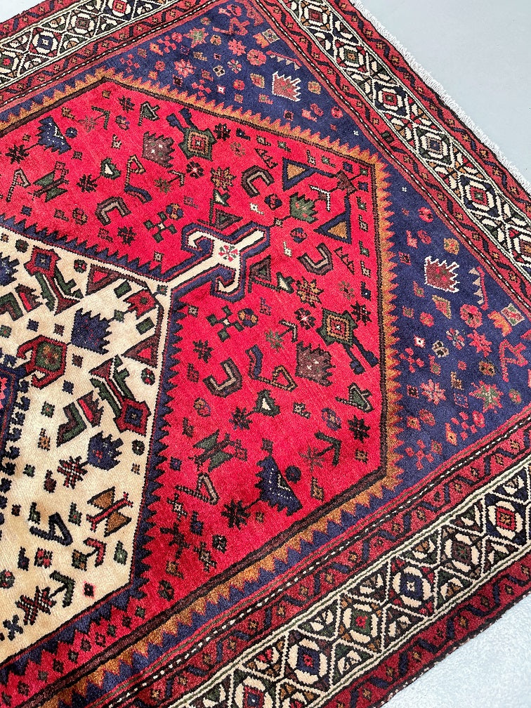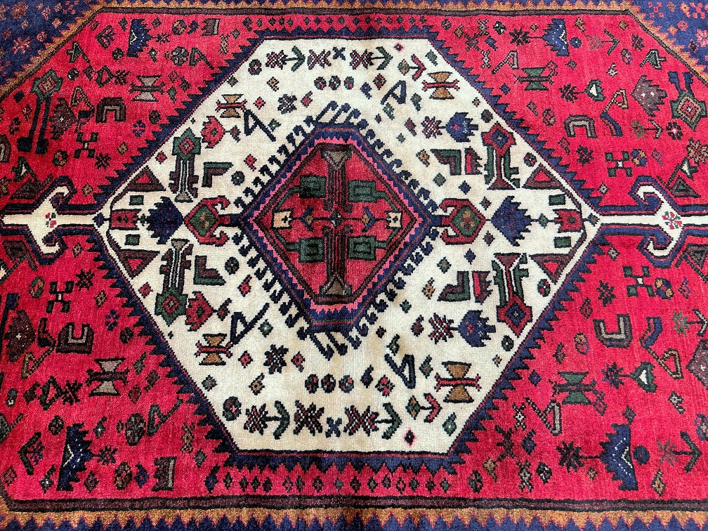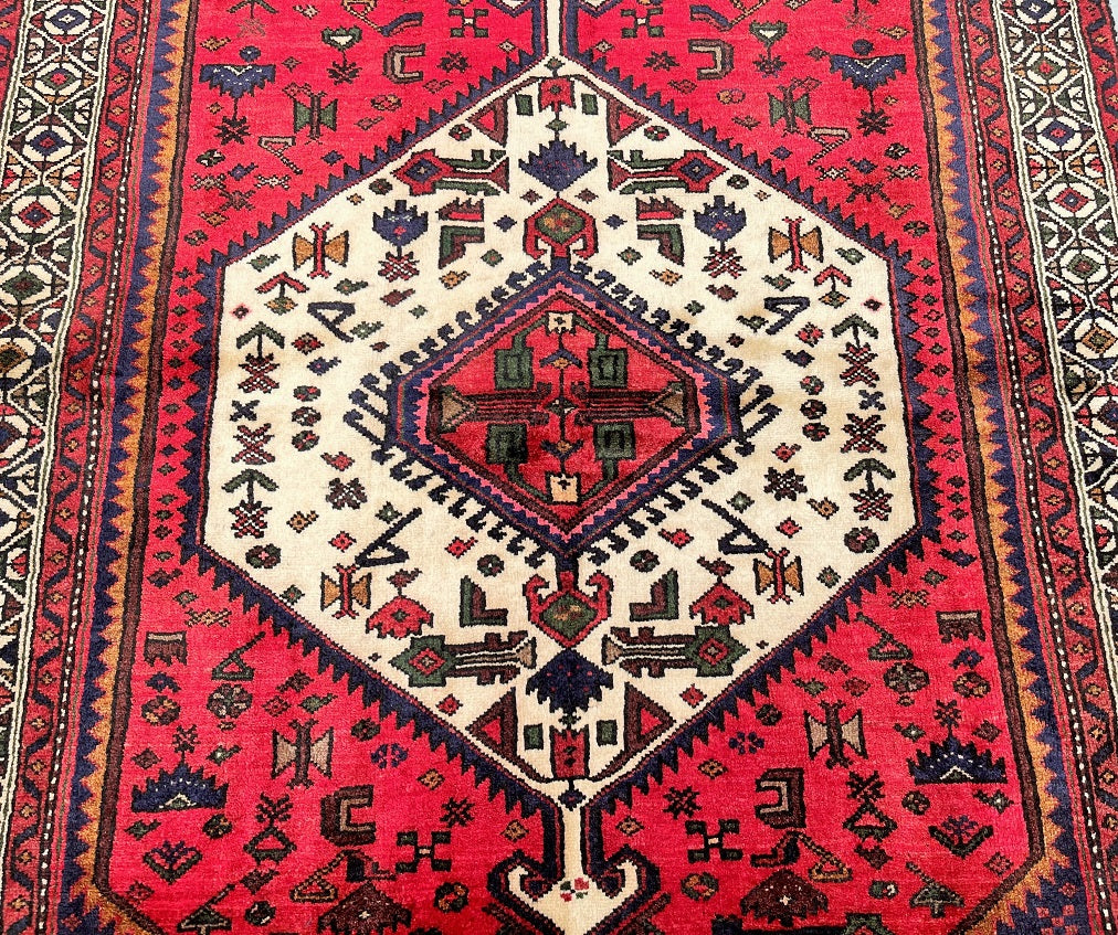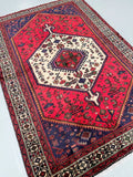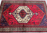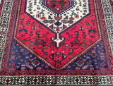 Coffee Table Size Authentic Handmade Village Persian Khamseh Rug. Above All It Is A Very Hard Wearing Rug. Pure Hand Spun Wool Pile On Cotton Base. It Also Has a Tomato Red, Indigo, Orange, Green And Black Tone Dyed Using Traditional Methods.