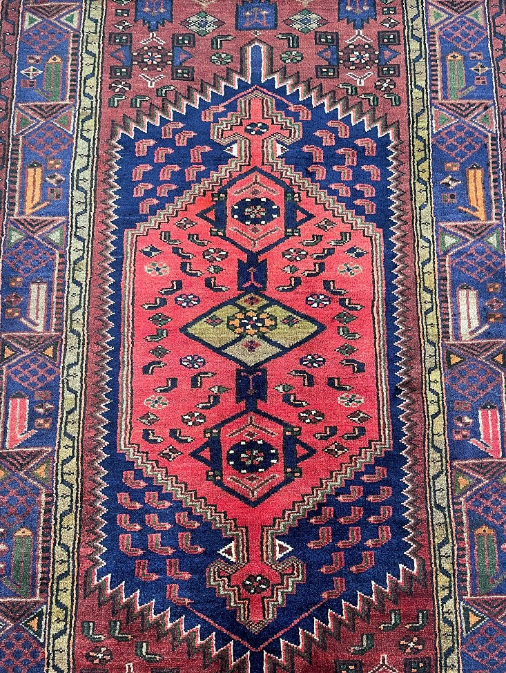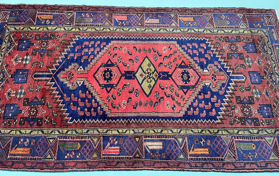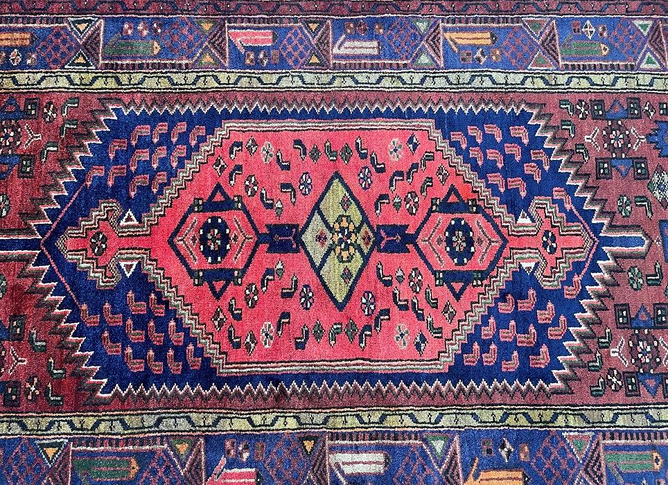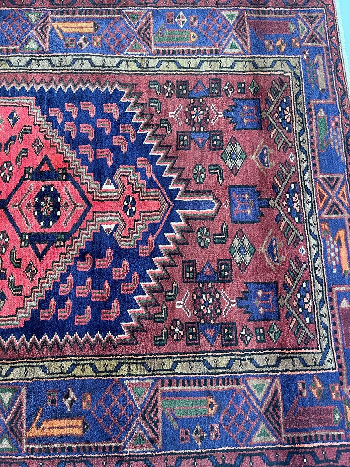 Coffee Table Size Authentic Handmade Persian Khamseh Rug. Above All It Has A Pure Hand Spun Wool Pile On Cotton Base. It Also Has A Terracotta Red, Blue, Beige, Brown And Green Tone Dyed Using Traditional Methods.