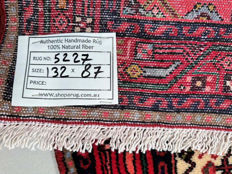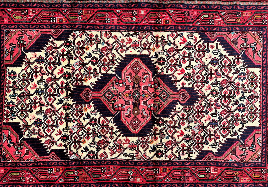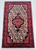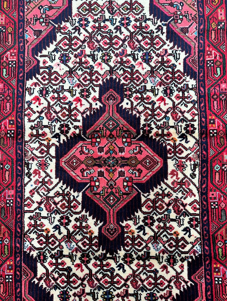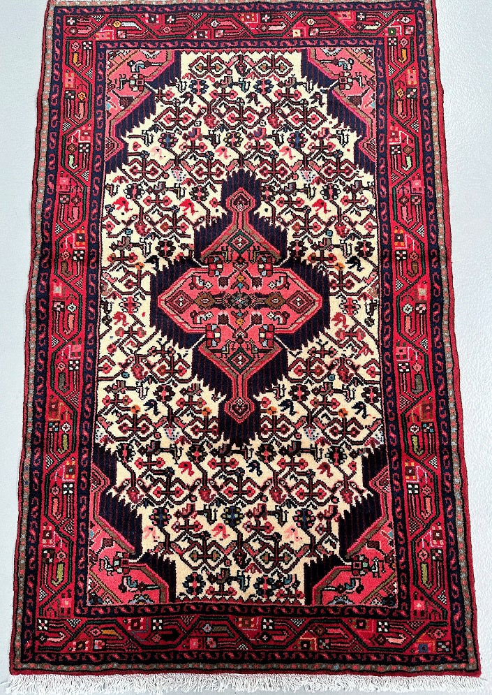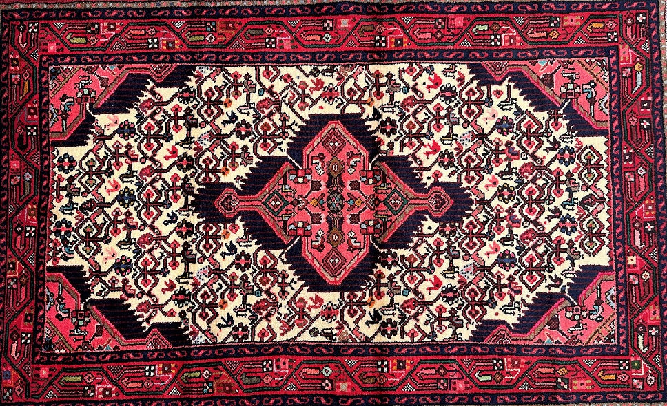 Coffee Table Size Authentic Handmade Persian Hamedan Asadabad Rug. Above All It Is A Unique Nomadic Rug. Pure Hand Spun Wool Pile On Cotton Base. It Also Has a Beige, Orange, Red, Blue Black, Pink And Green Tone Dyed Using Traditional Methods.