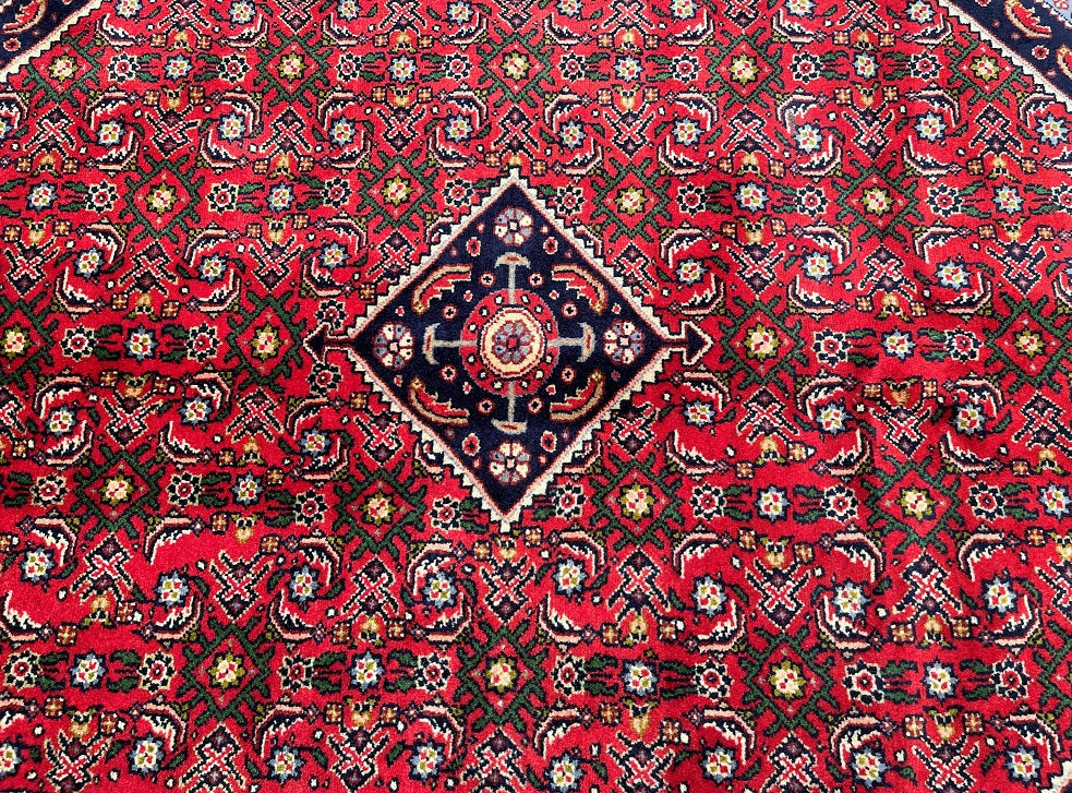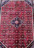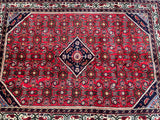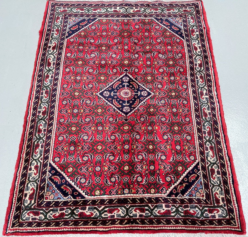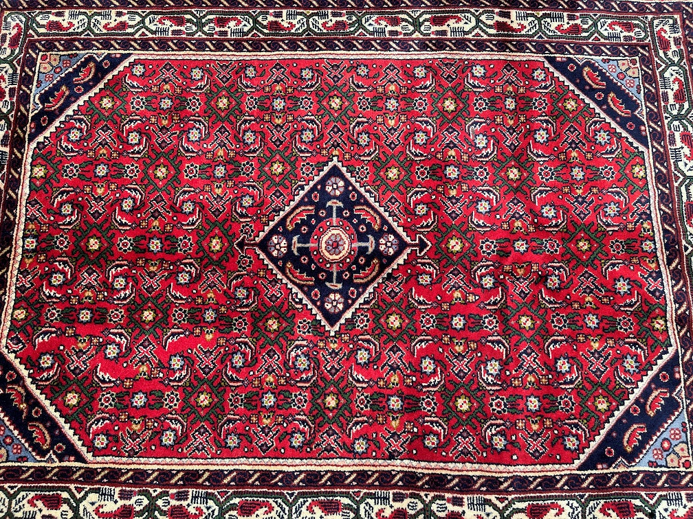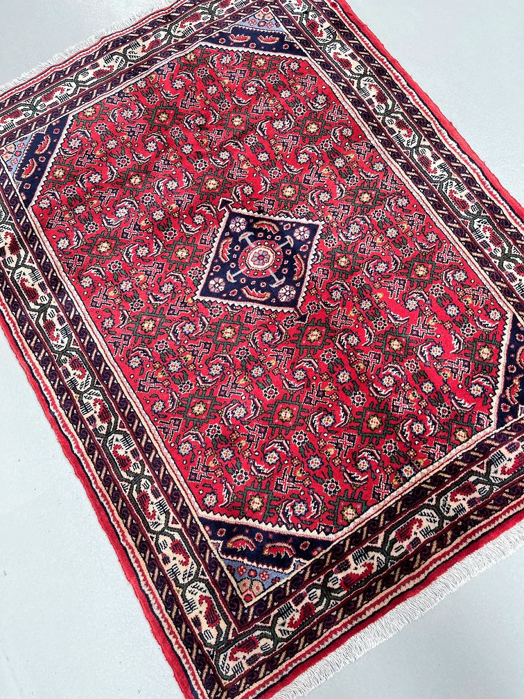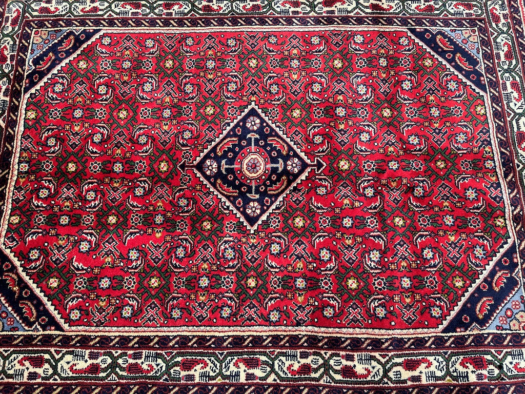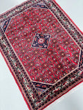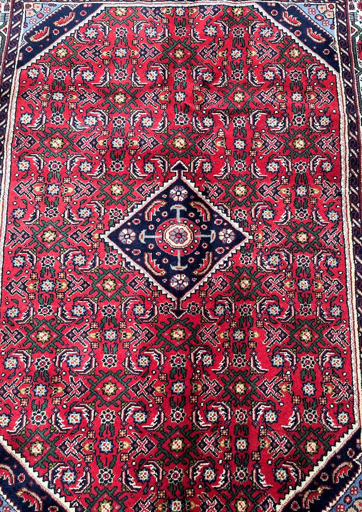 Coffee Table Size Hand Knotted Persian Hamedan Rug. Above All It Is A Very Unique Nomadic Rug. Pure Hand Spun Wool Pile On Cotton Base. It Also Has a Red, Beige, Blue And Green Tone Dyed Using Traditional Methods.
