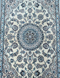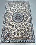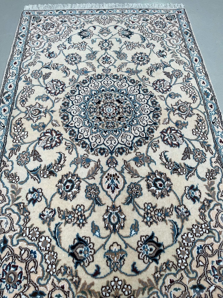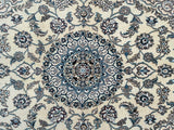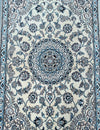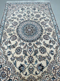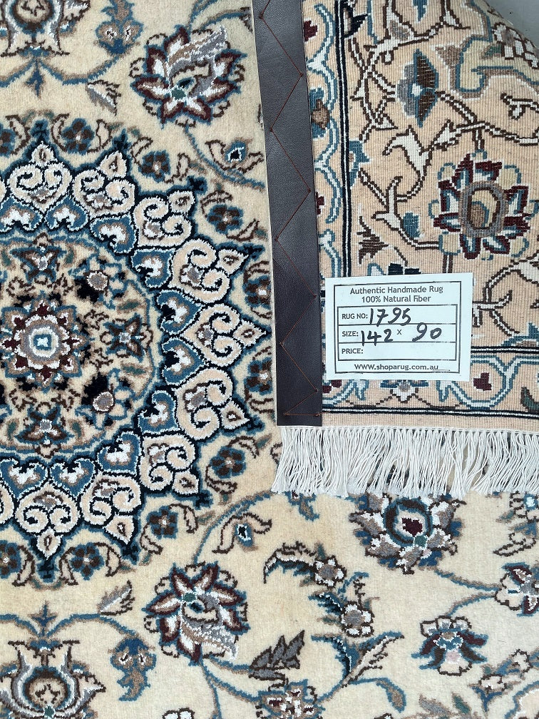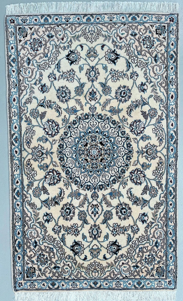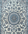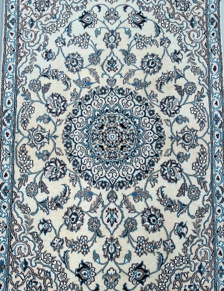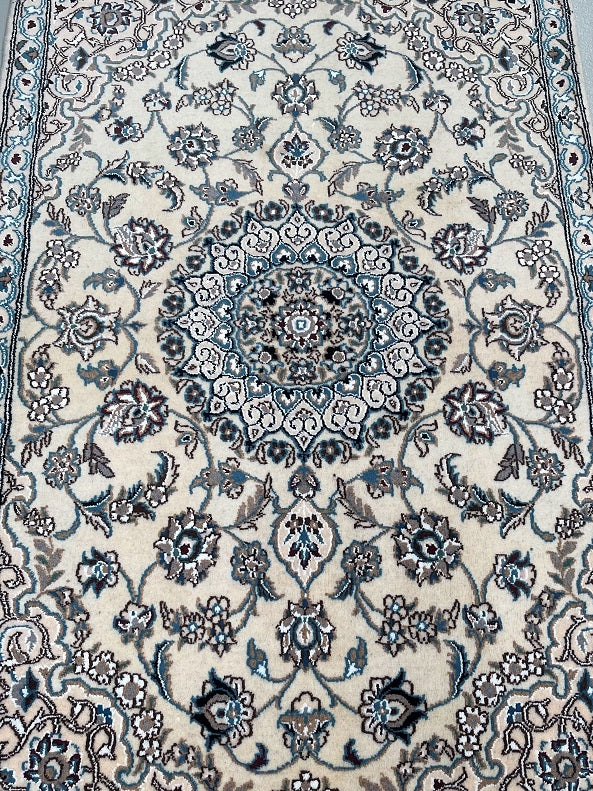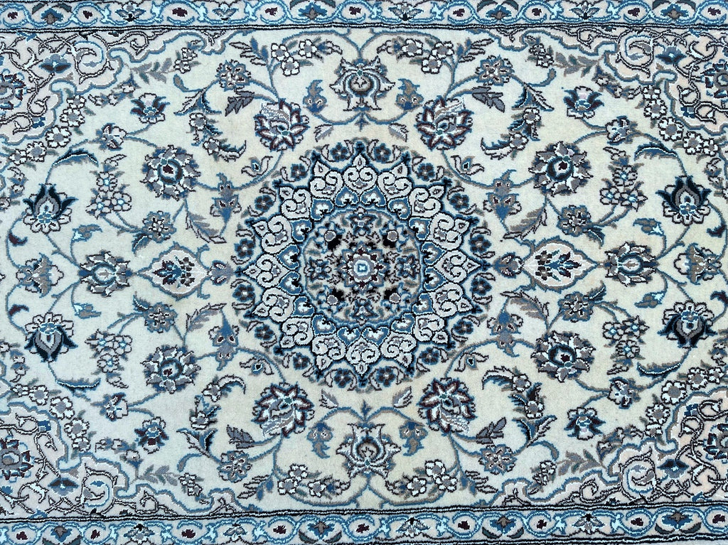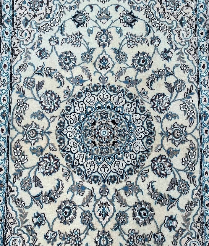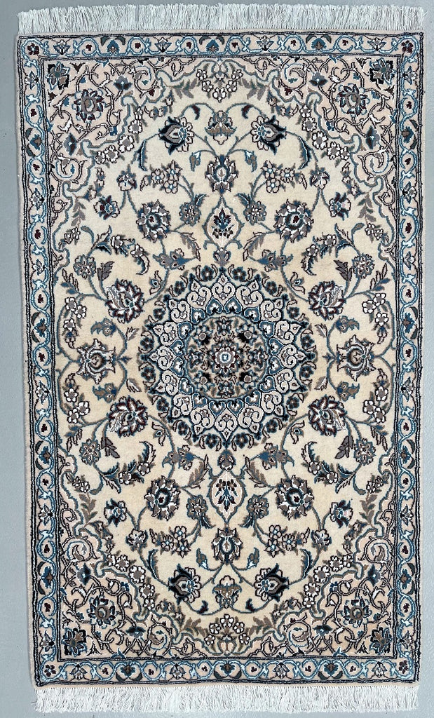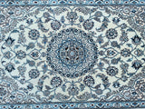 Authentic Hand Knotted Persian Nain Rug. Above All It Has A Dense Pure Wool Pile On Cotton Base. It Also Has A Beige, Light Blue, Grey With touch Of Black And Burgundy Tone Dyed Using Traditional Methods.