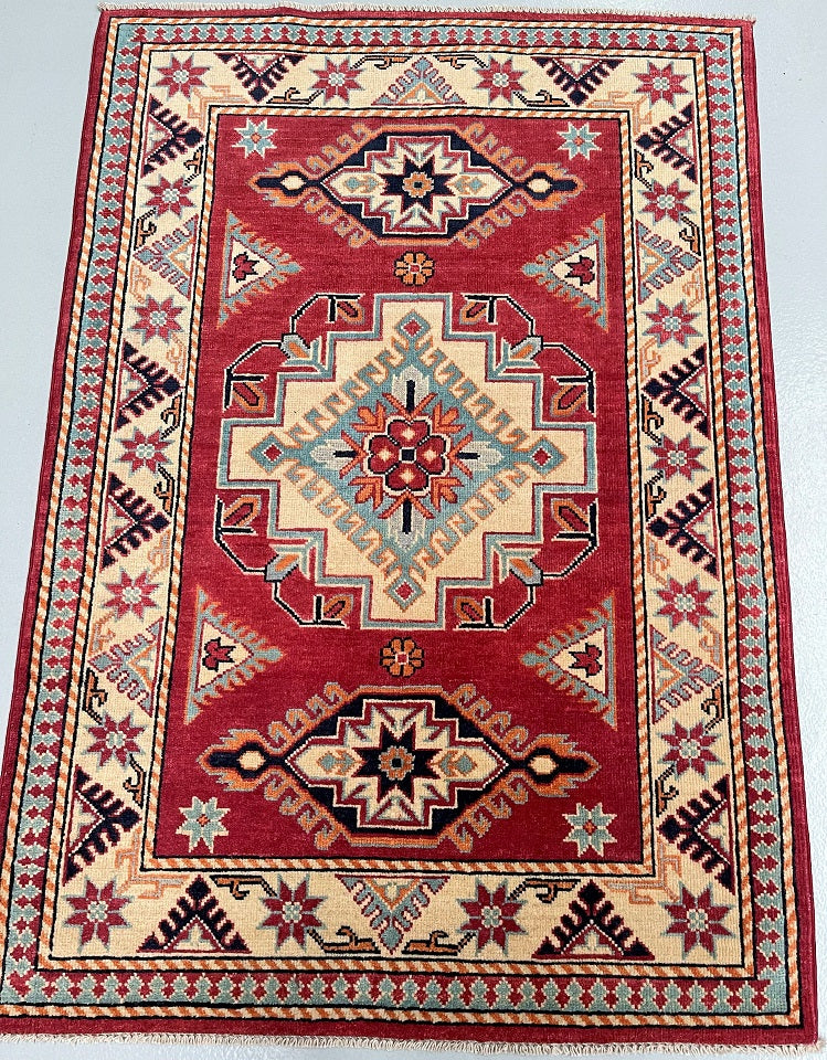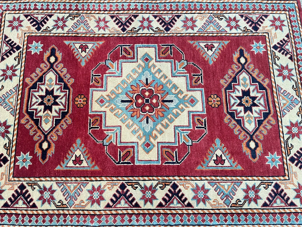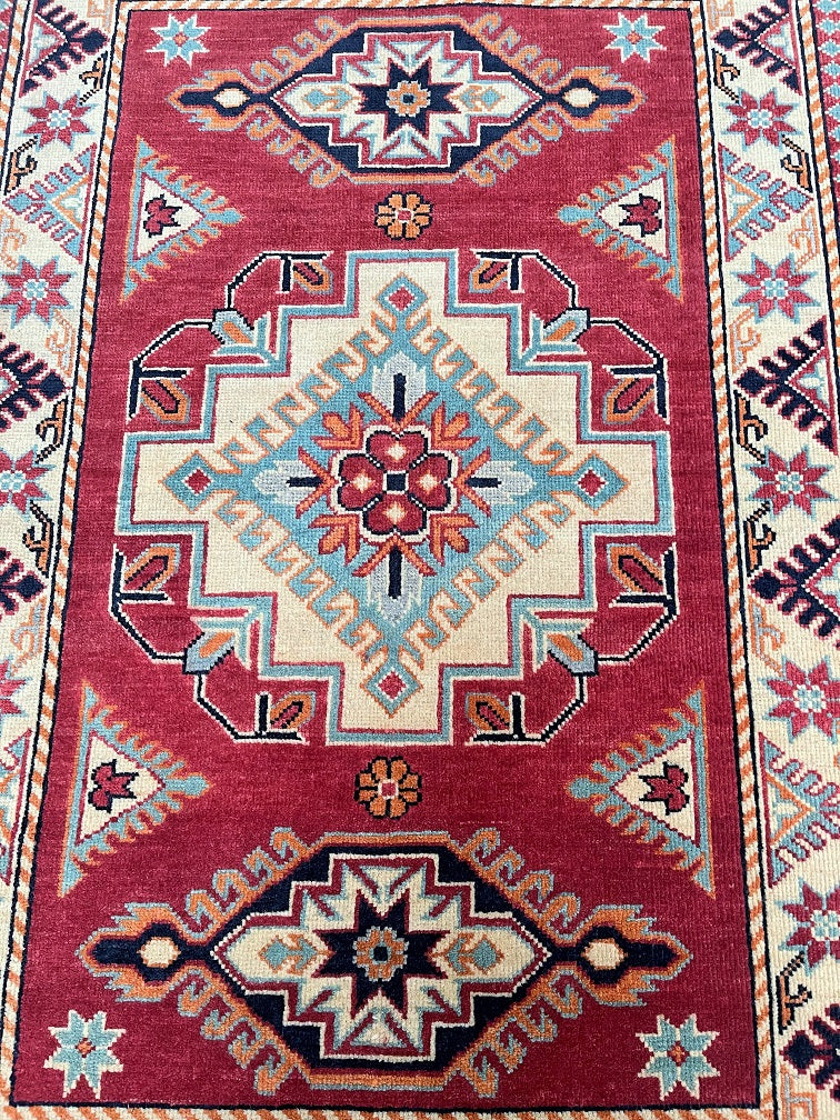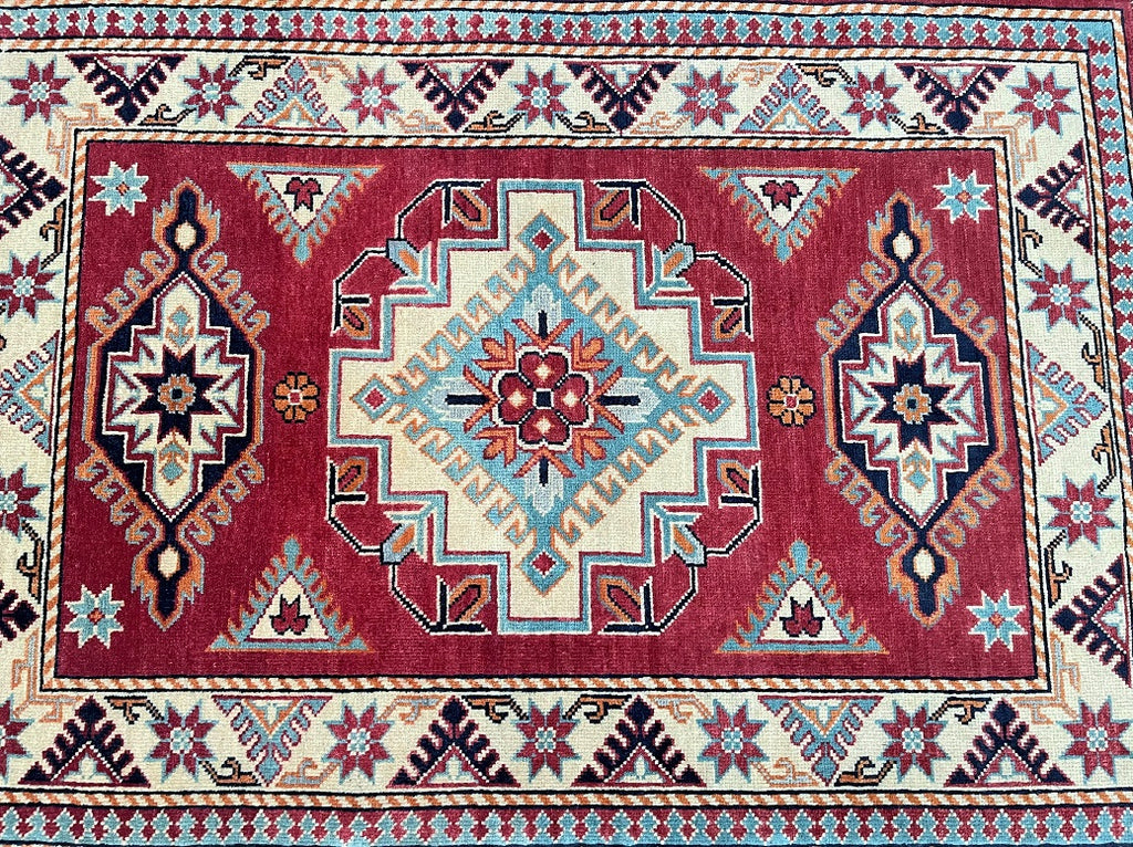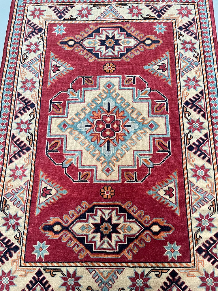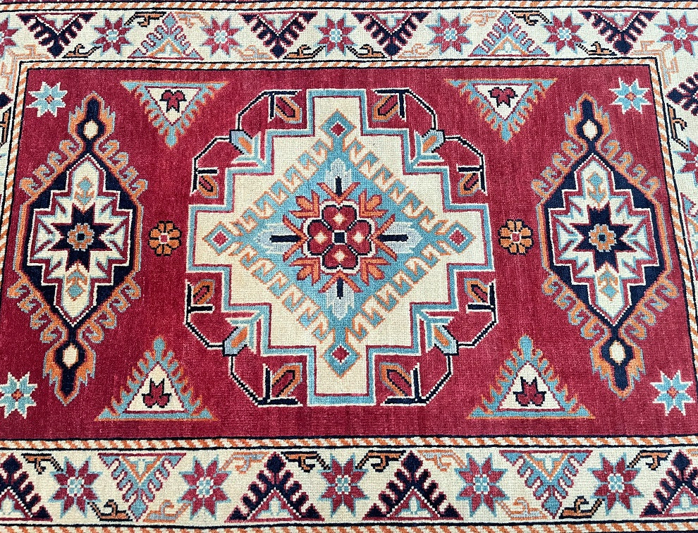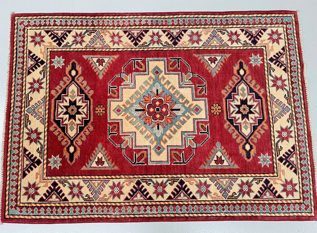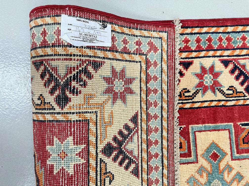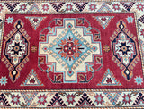 Decorative Coffee Table Size Hand Knotted Afghan Kazak Rug. Above All It Is Pure Hand Spun Wool Pile On Cotton Base. Red/Terracotta, Beige, Black, Orange And Blue Tone Dyed Using Traditional Methods (Vegetable Dyes). Last of True Woven Tribal Art.