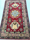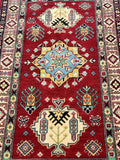 Coffee Table Size Genuine Hand Knotted Afghan Kazak Rug. Above All It Is Pure Hand Spun Wool Pile On Cotton Base. Soft Red, Beige Yellow, Green, Black And Aqua Tone Dyed Using Traditional Methods (Vegetable Dyes). Last Of True Woven Tribal Art.