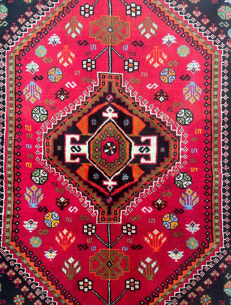 Dense Quality Coffee Table Size Authentic Handmade Persian Qashqai Shiraz Rug. It Has a Dense Pure Hand Spun Wool Pile On Wool Base. Red, Beige, Green, Blue, Black, Yellow, Orange and Brown Tone Dyed Using Traditional Methods.