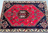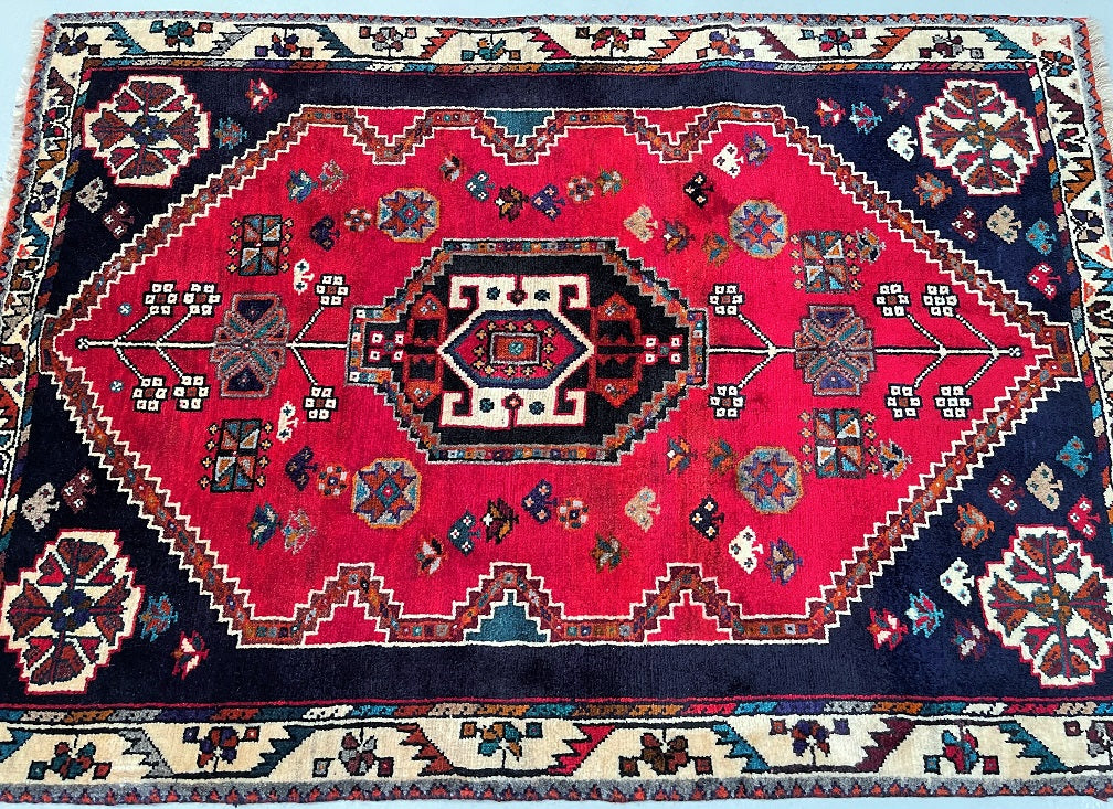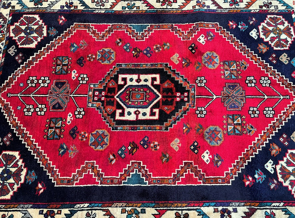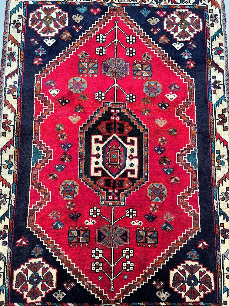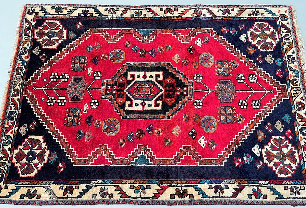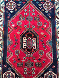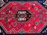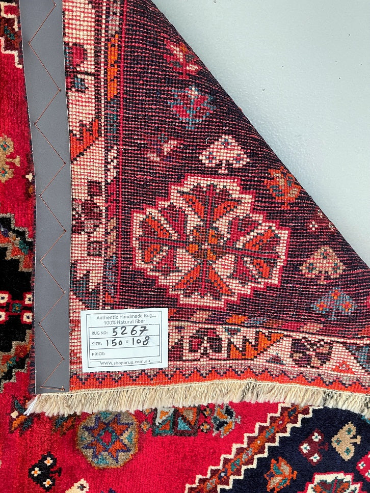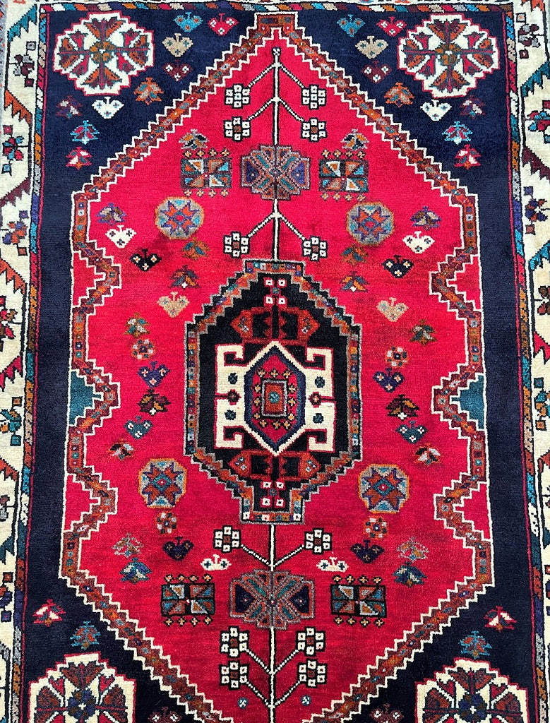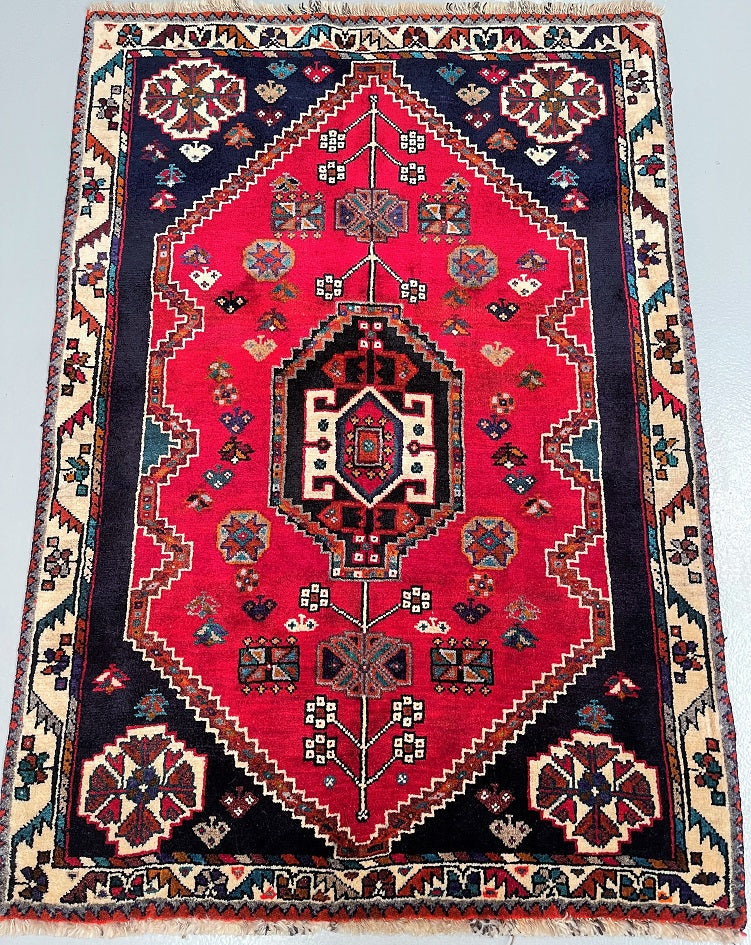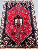 Handmade Persian Qashqai Shiraz rug, known for its dense and high-quality craftsmanship. This rug features a luxurious pile made of pure hand-spun wool, skillfully woven onto a wool base. The color palette is a captivating blend of red, beige, green, blue, black, yellow, orange, and brown tones, achieved through traditional dyeing methods. The design showcases a central medallion that combines elements of both floral and geometric patterns, creating a unique and visually appealing composition. The level of skill and dedication is evident, as it would have taken a weaver approximately 4 months to complete this piece. Hand-woven in the Shiraz district of South Persia, this rug measures 150 x 108 cm and holds a gallery replacement value of $2,299