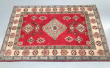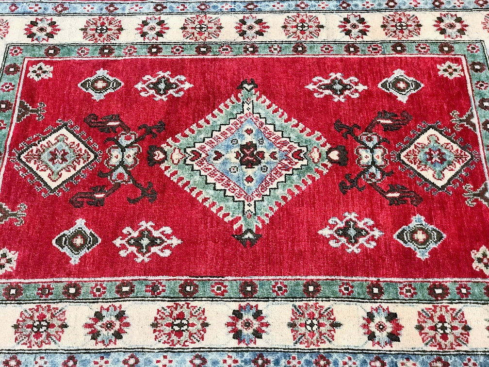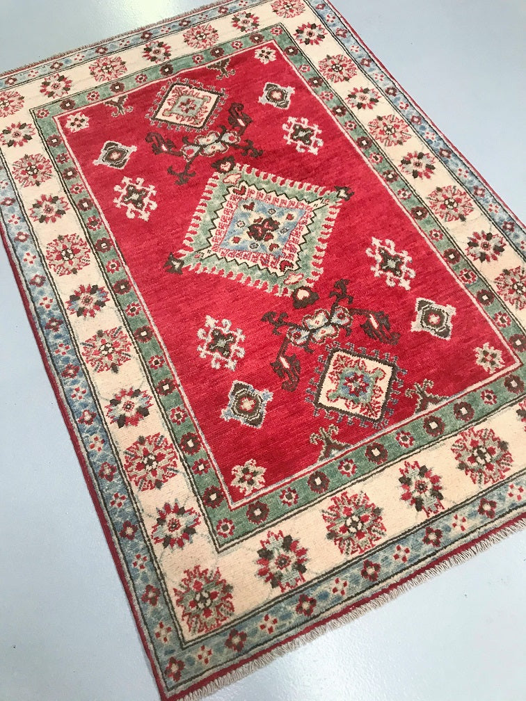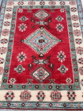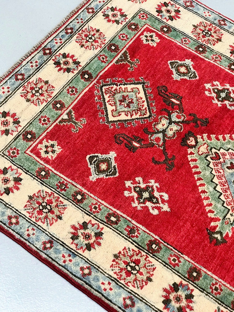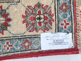 Discounted Coffee Table Size Hand Knotted Afghan Kazak Rug. Above All It Is Pure Hand Spun Wool Pile On Cotton Base. Soft Red, Beige Green And Blue Tone Dyed Using Traditional Methods (Vegetable Dyes). Last Of True Woven Tribal Art.