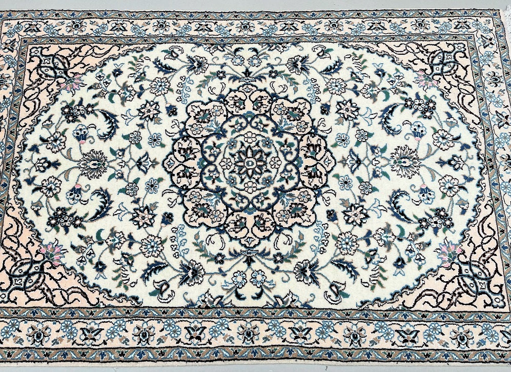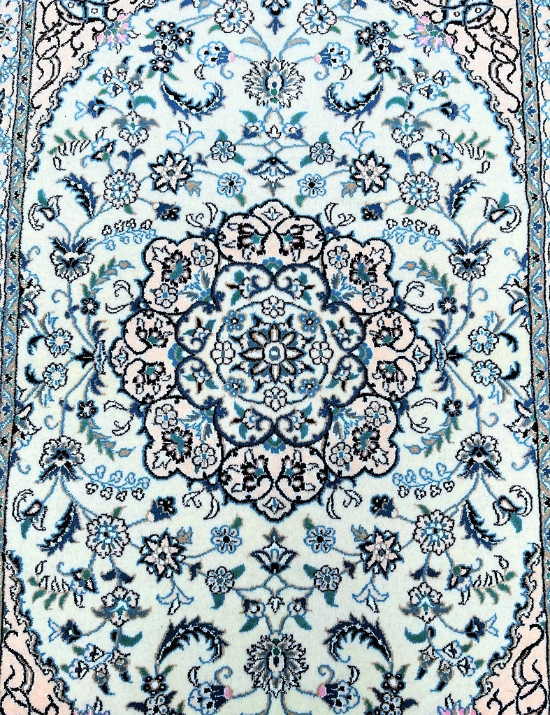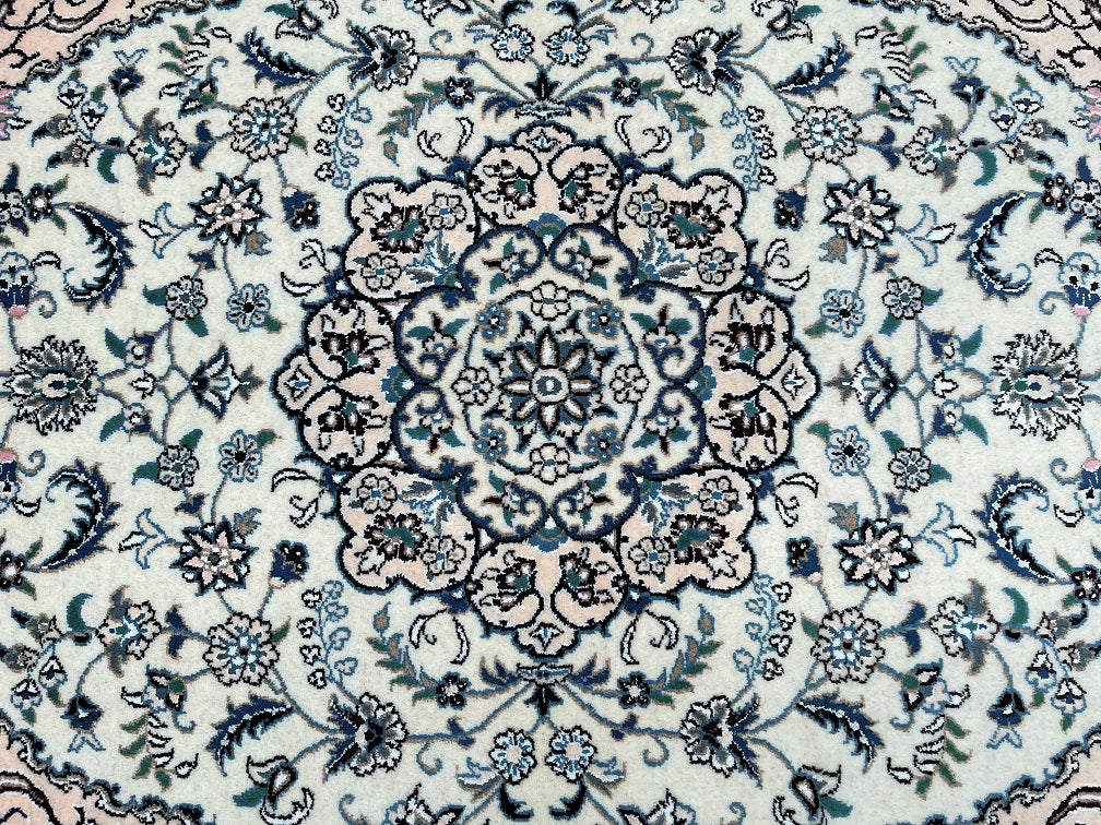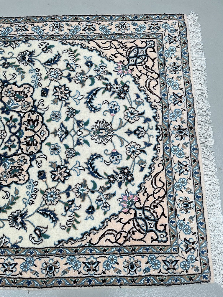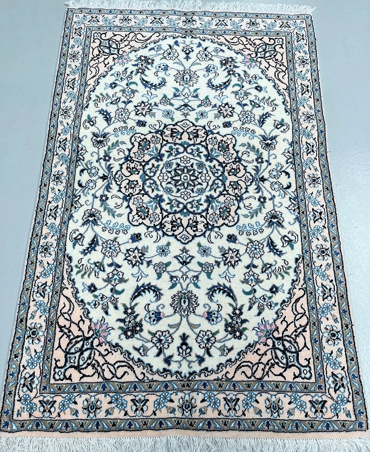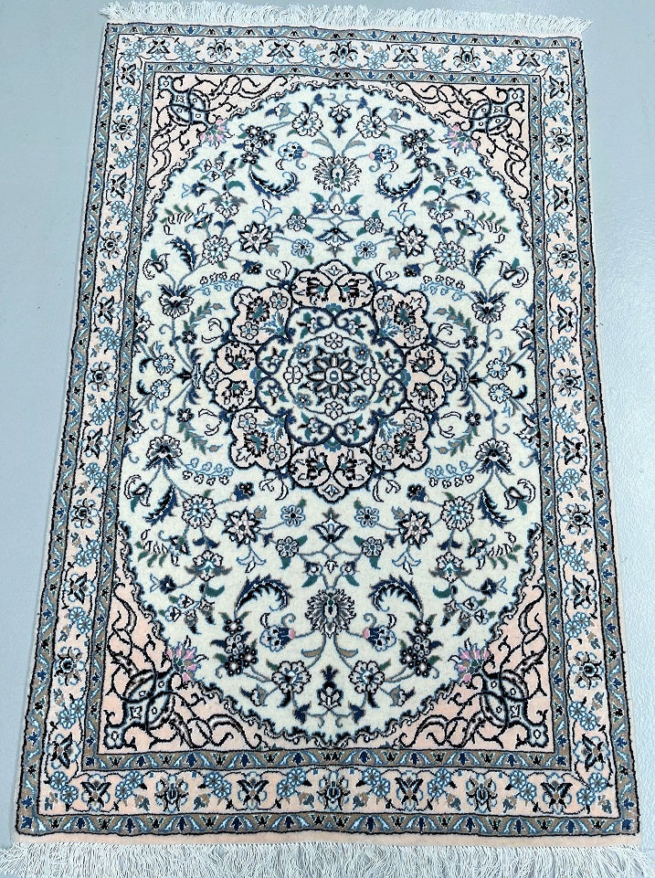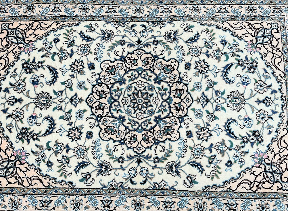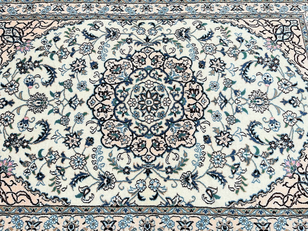 Superb Authentic Handmade Persian Nain Rug. It Is Hard To Get This Quality Original Handmade Traditional Rug. Never The Less It Has A Lamb’s Wool Pile On Cotton Base. Beige, Blue With Touch Pink, Cream, Black And Green Tone Dyed Using Traditional Methods.
