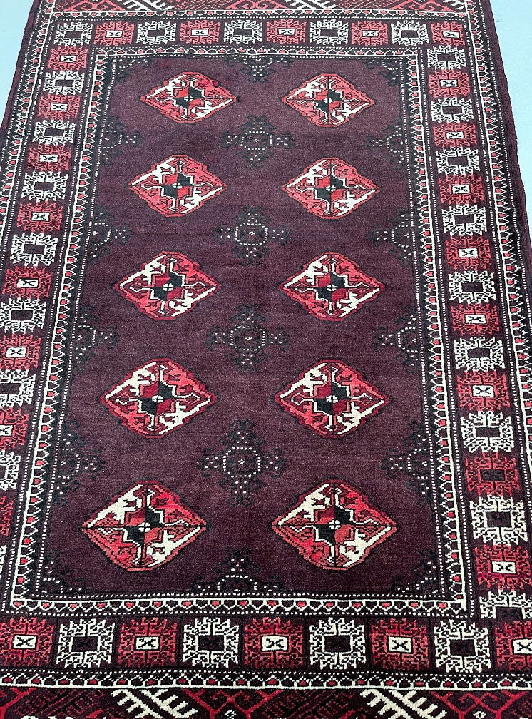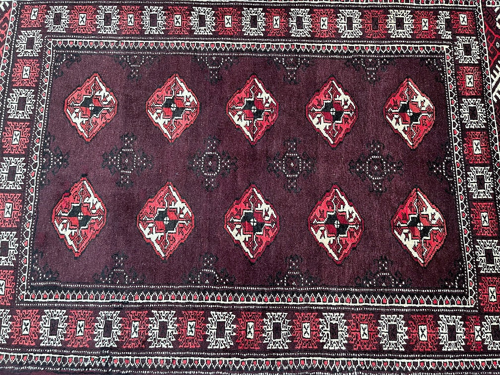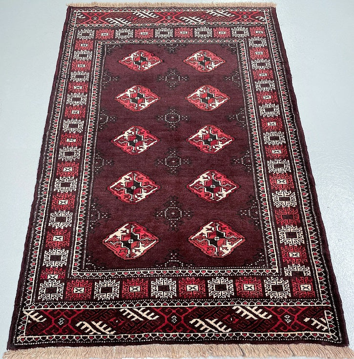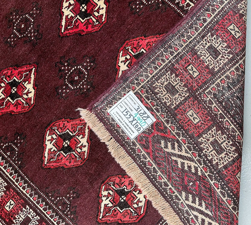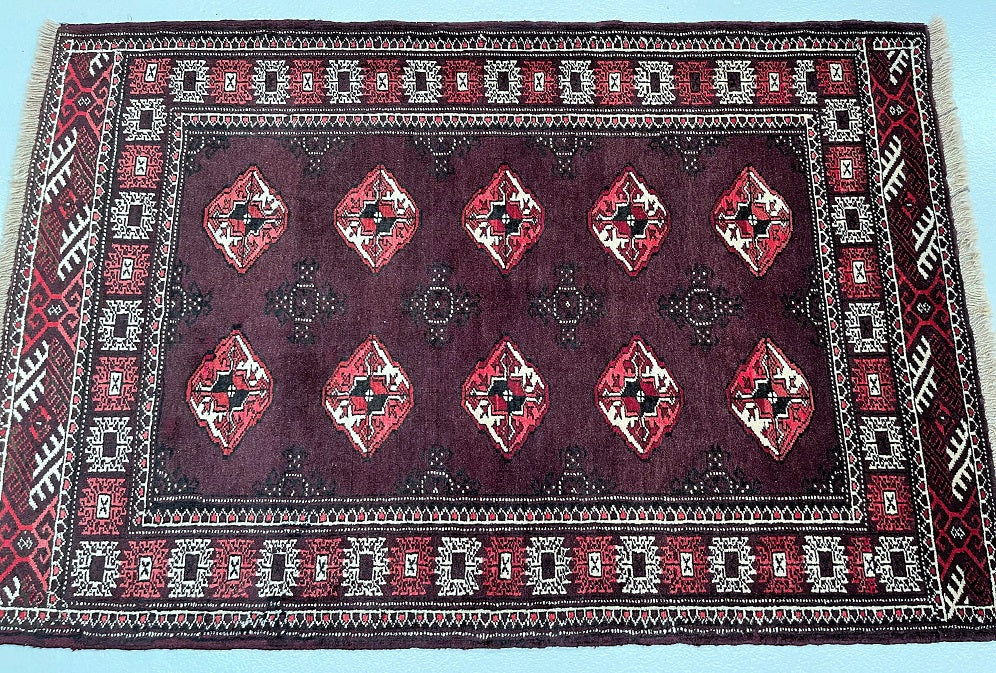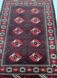 Authentic Handmade Tribal Bokhara Design Persian Turkoman Rug. Above All It Is Pure Hand Spun Wool Pile On Wool Base. It Also Has Rare Scarlet Red/Burnt Chocolate Tone Dyed Using Traditional Methods.