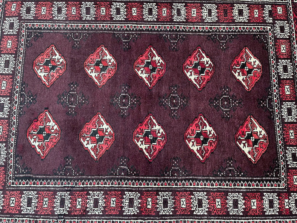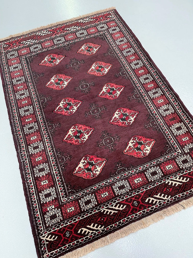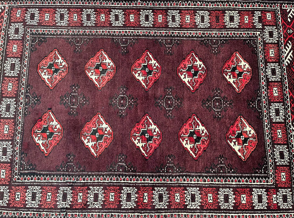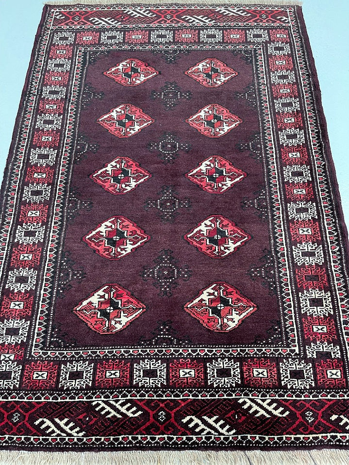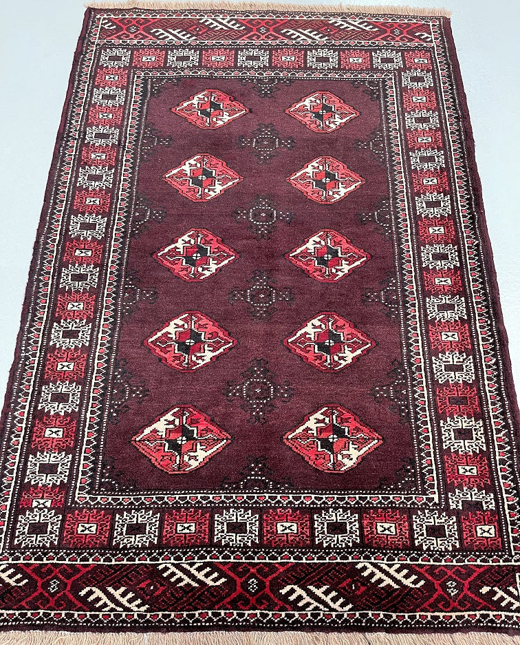 Authentic Handmade Tribal Bokhara Design Persian Turkoman Rug. Above All It Is Pure Hand Spun Wool Pile On Wool Base. It Also Has Rare Scarlet Red/Burnt Chocolate Tone Dyed Using Traditional Methods.