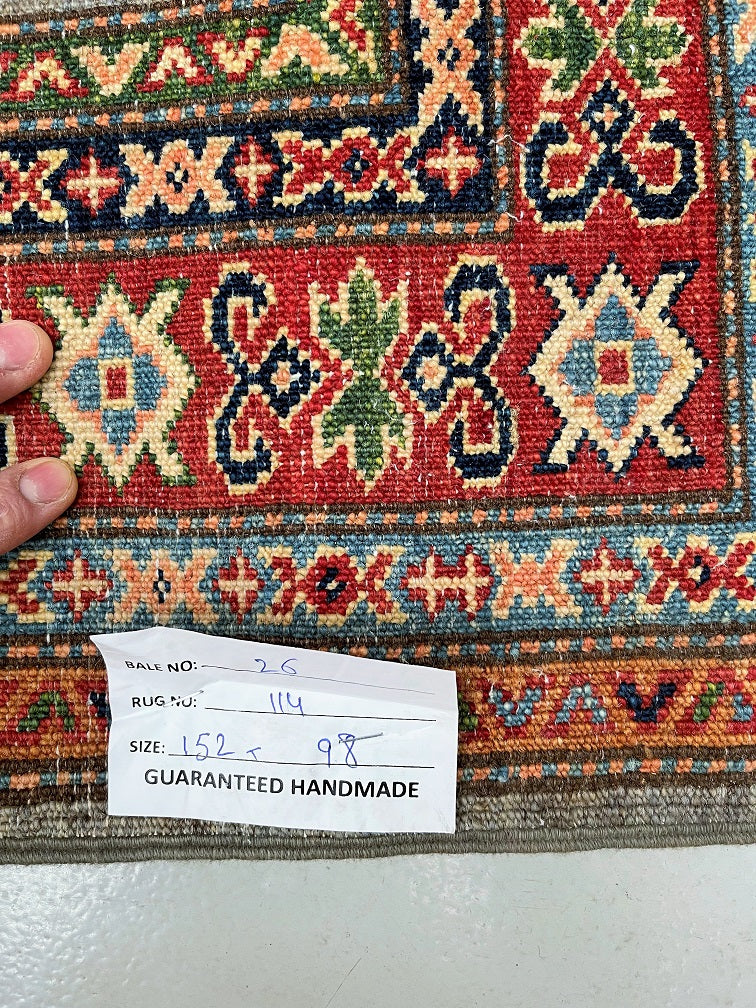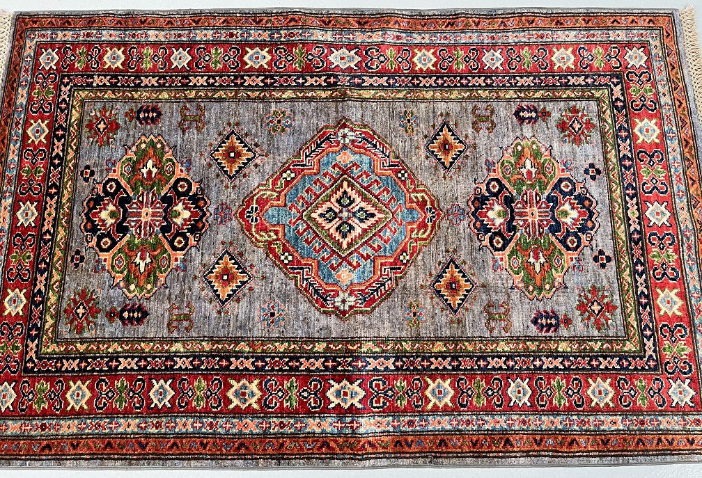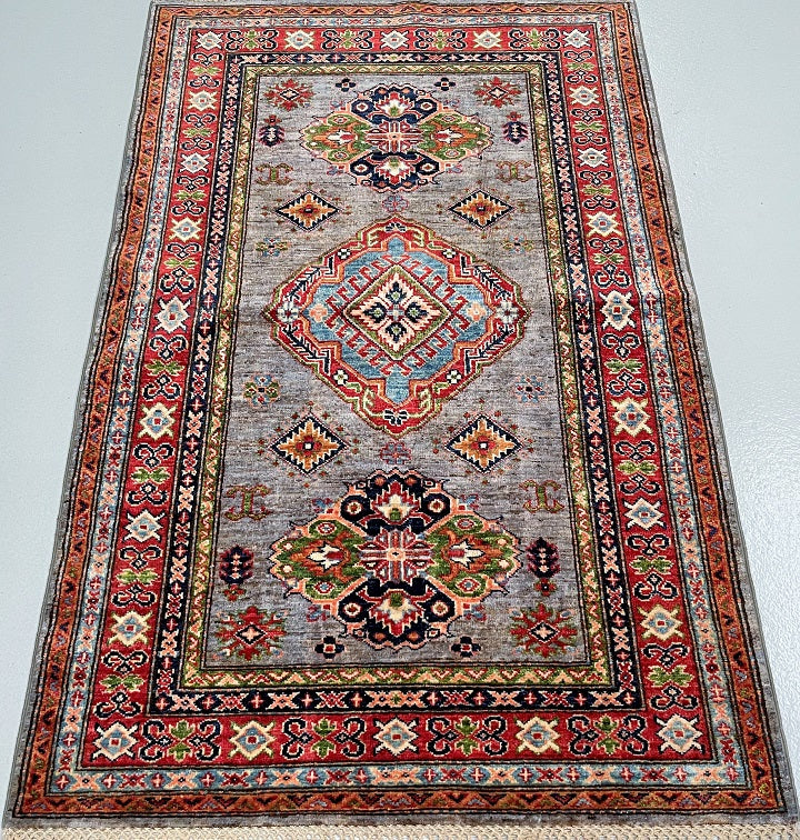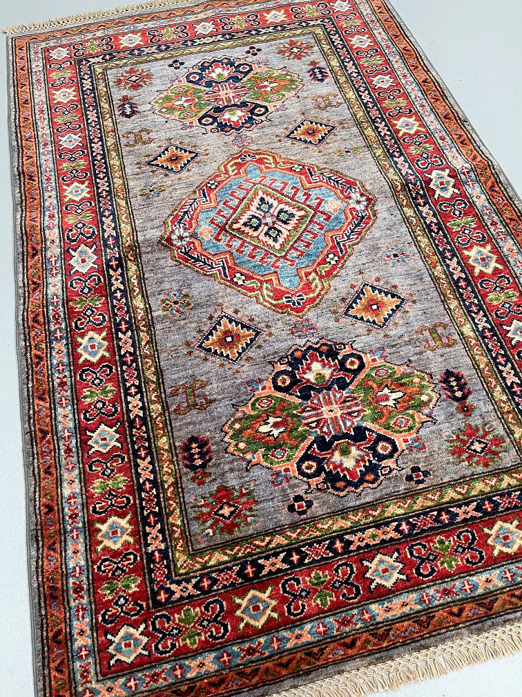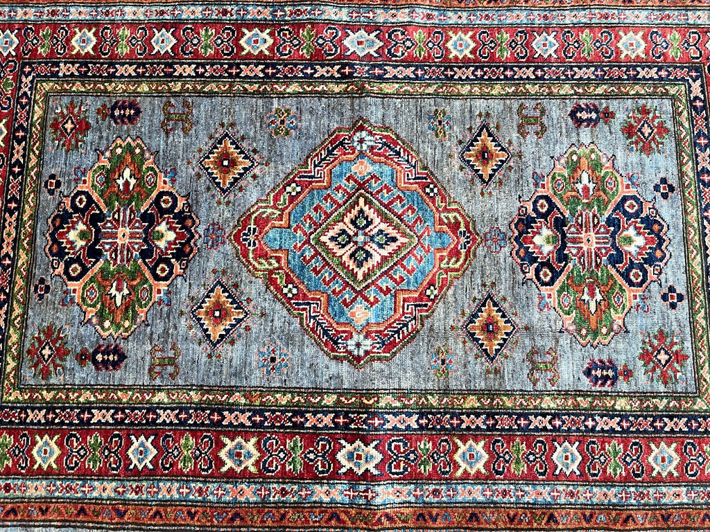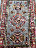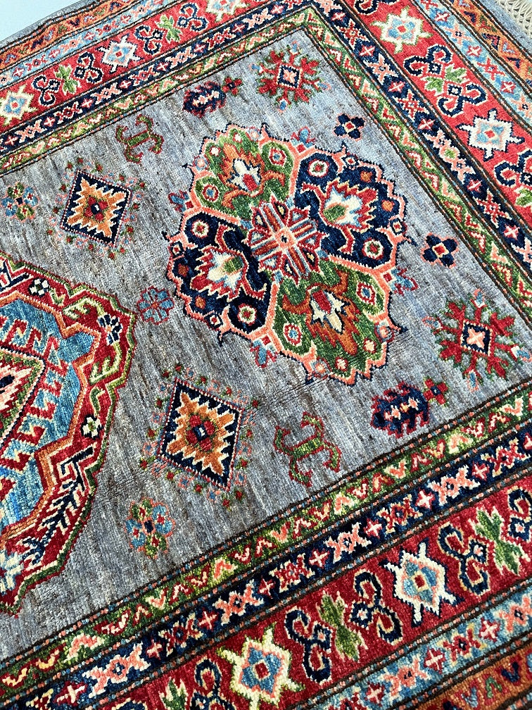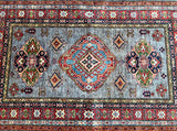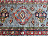 Gorgeous Authentic Hand Knotted Afghan Royal Kazak Rug. Above All It Is Pure Hand Spun Ghazni Wool Pile On Cotton Base. Grey/Silver, Blue, Green, Orange And Maroon Tone Dyed Using Traditional Methods (Vegetable Dyes). Last of True Woven Nomadic Art.