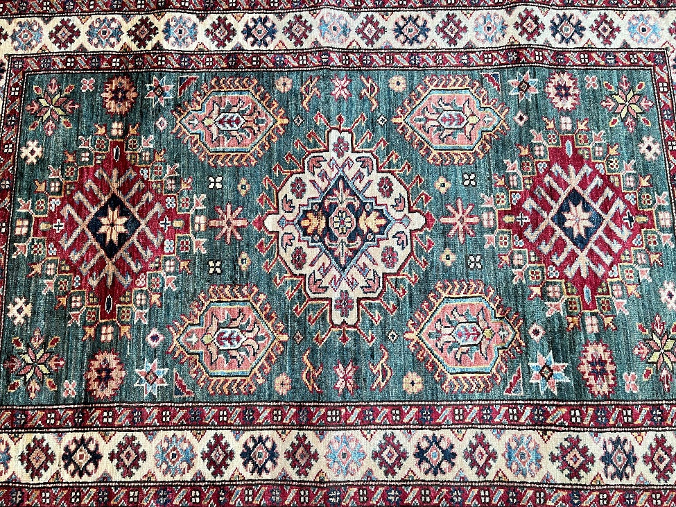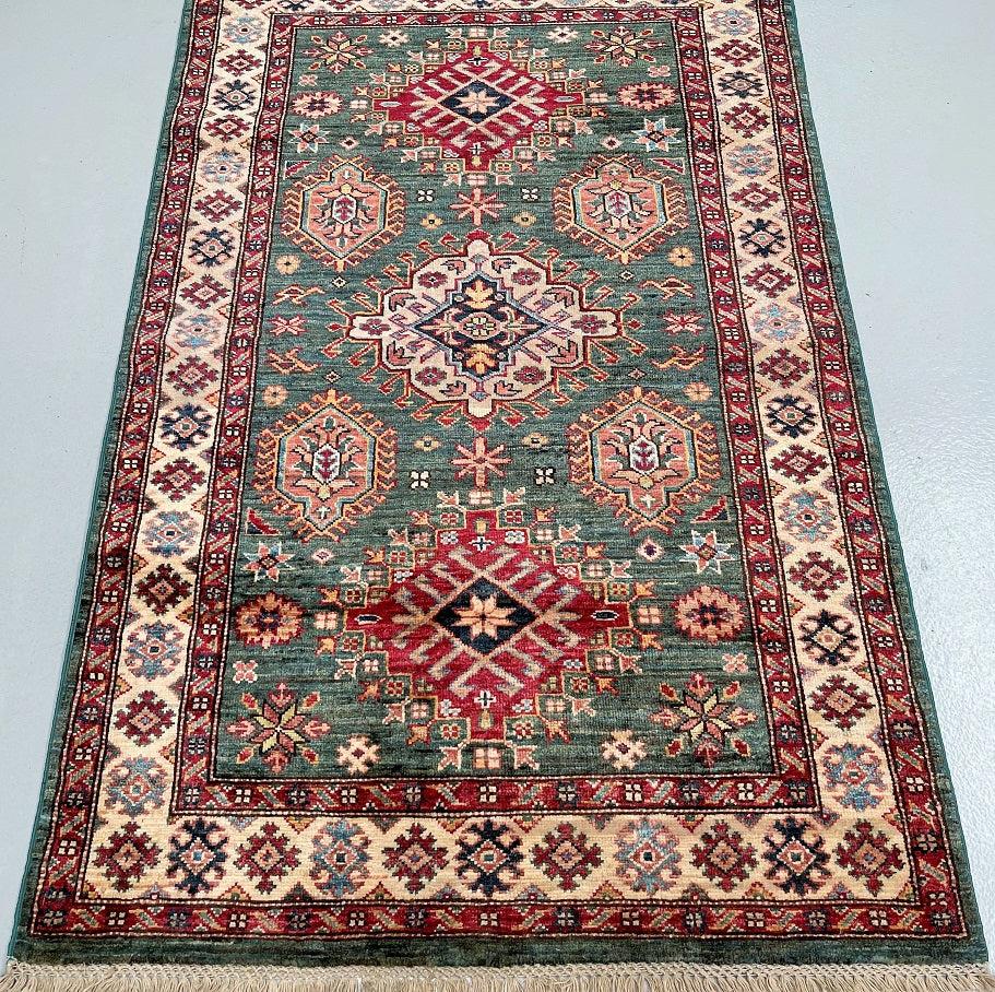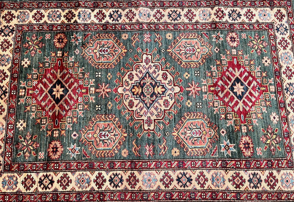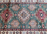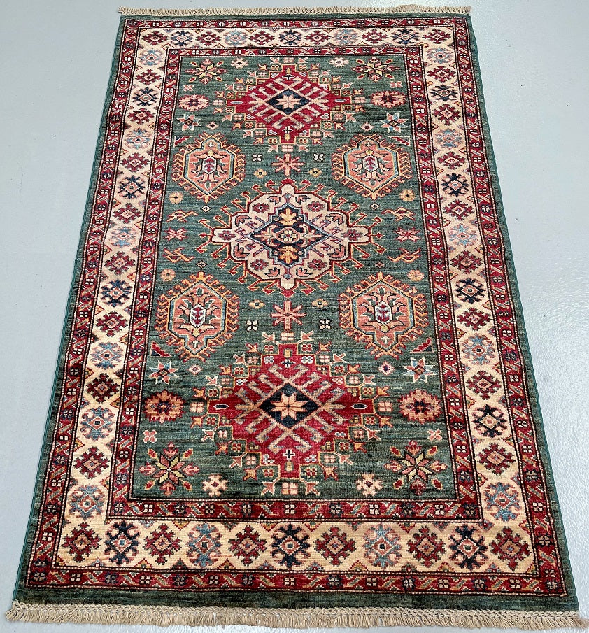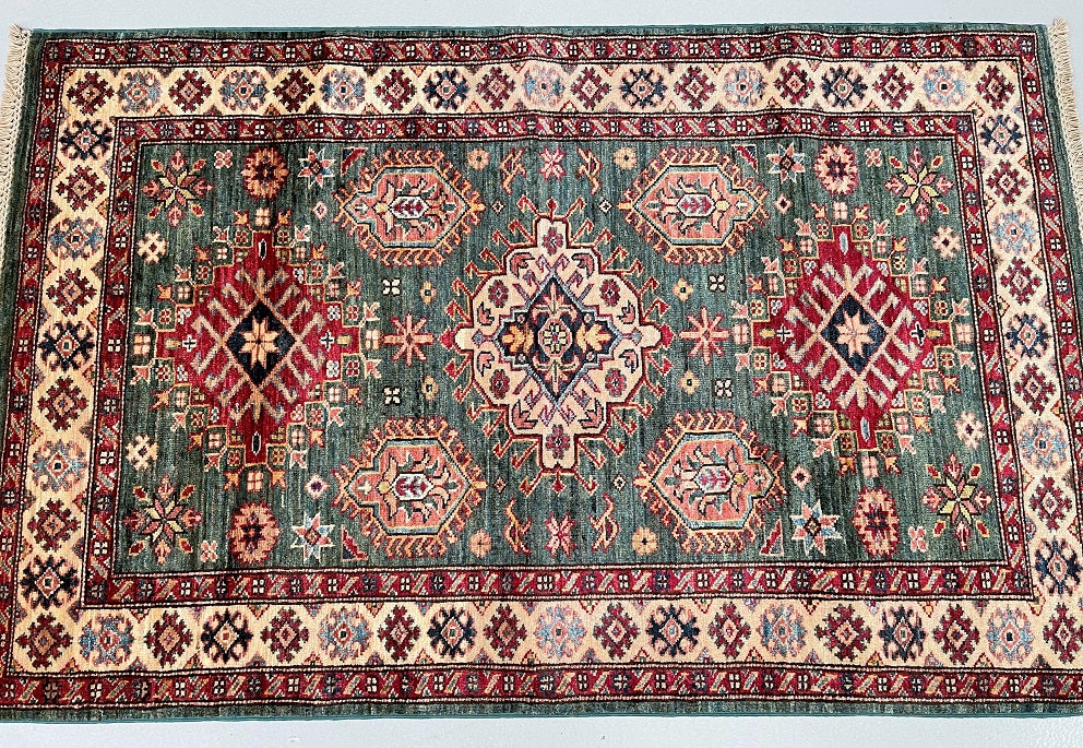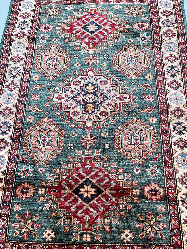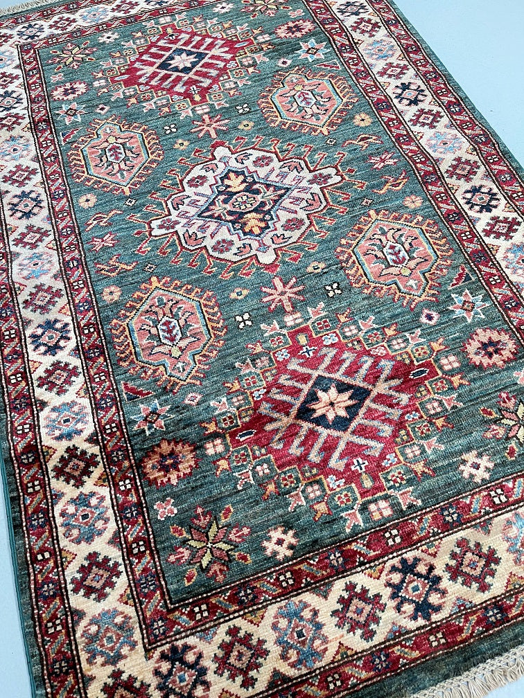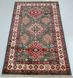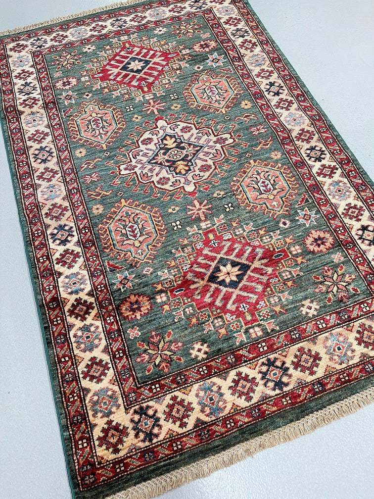 Superb Coffee Table Size Hand Knotted Afghan Royal Kazak Rug. Above All This Quality of Kazak Rugs Are Rare And Are Made Using Merino Wool Pile on Cotton Base. Green Tone Dyed Using Traditional Methods (Vegetable Dyes). Last of True Woven Nomadic Art.