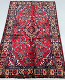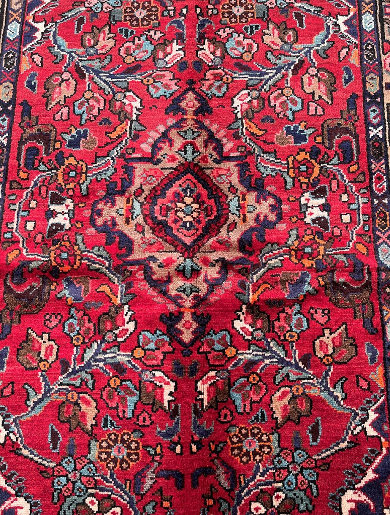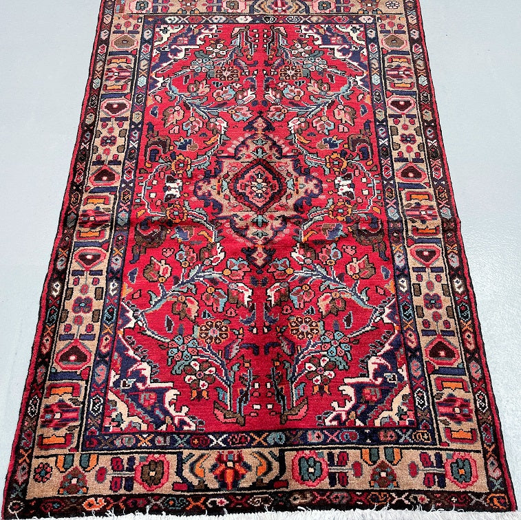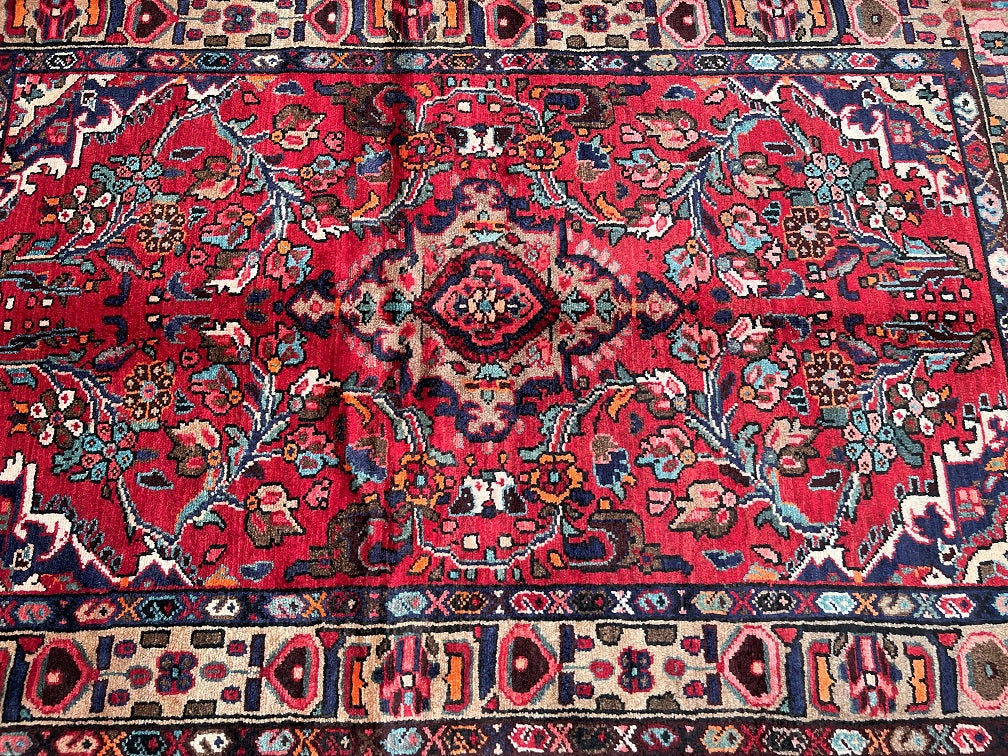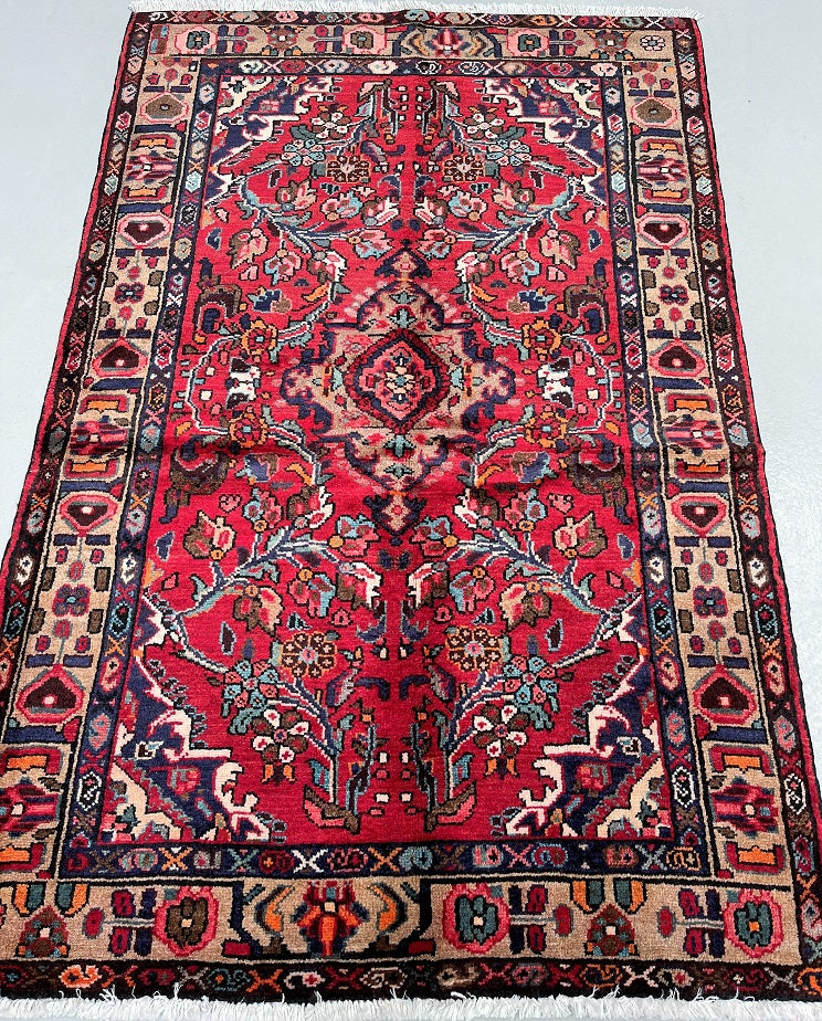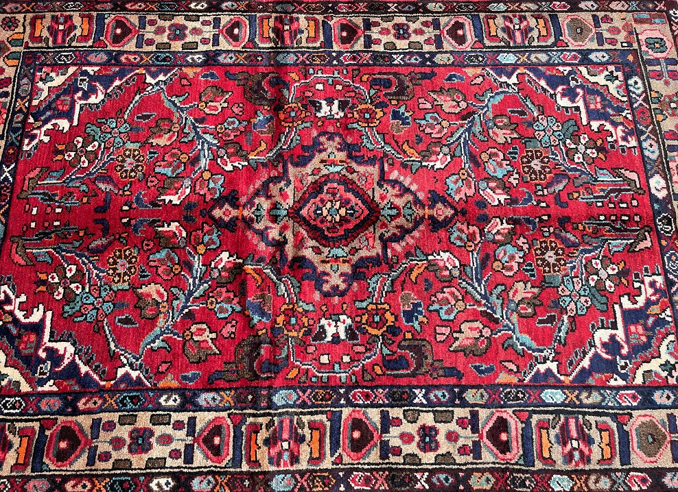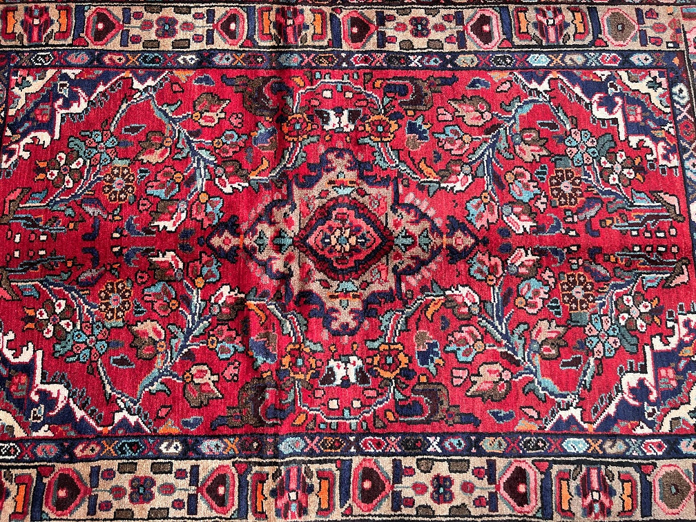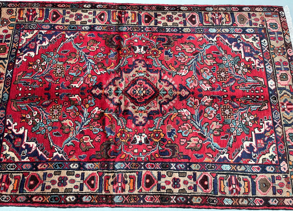 Coffee Table Size Genuine Handmade Persian Lilian Rug. Above All It Is A Hard Wearing Rug. Pure Hand Spun Wool Pile On Cotton Base. It Also Has a Maroon Red, blue, Beige And Orange Tone Dyed Using Traditional Methods.