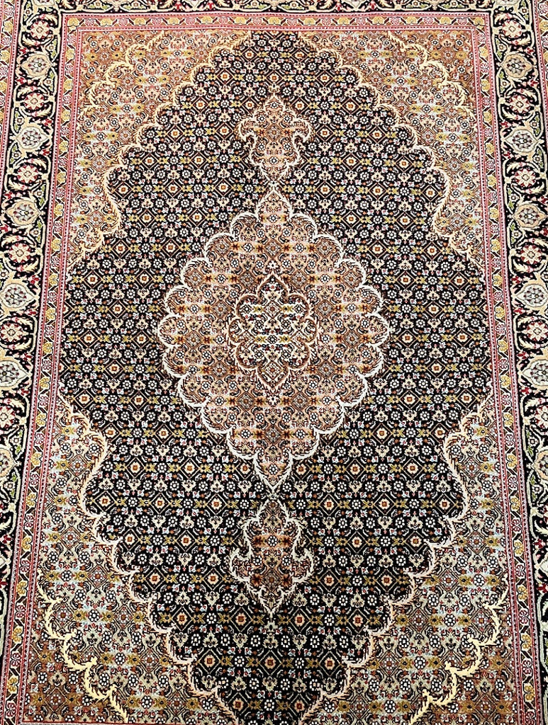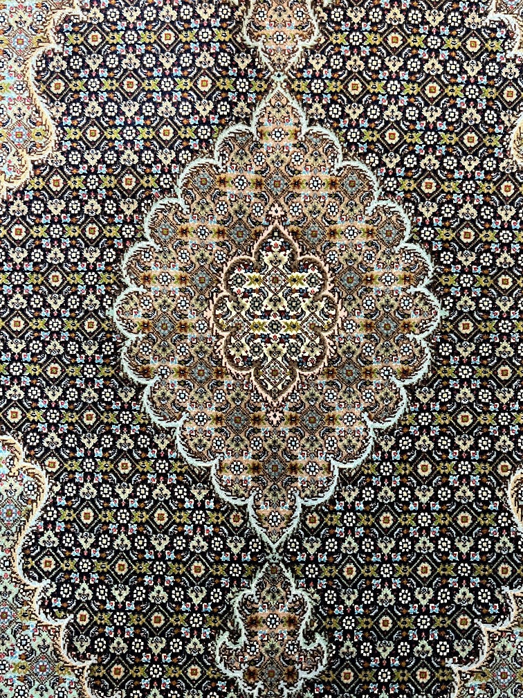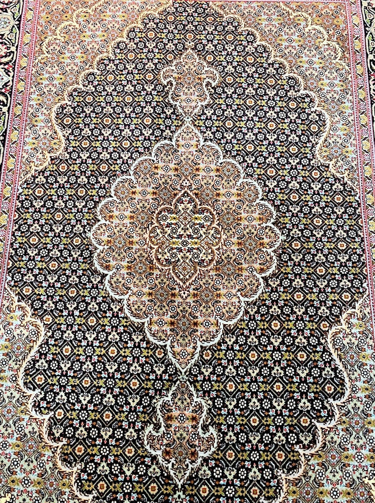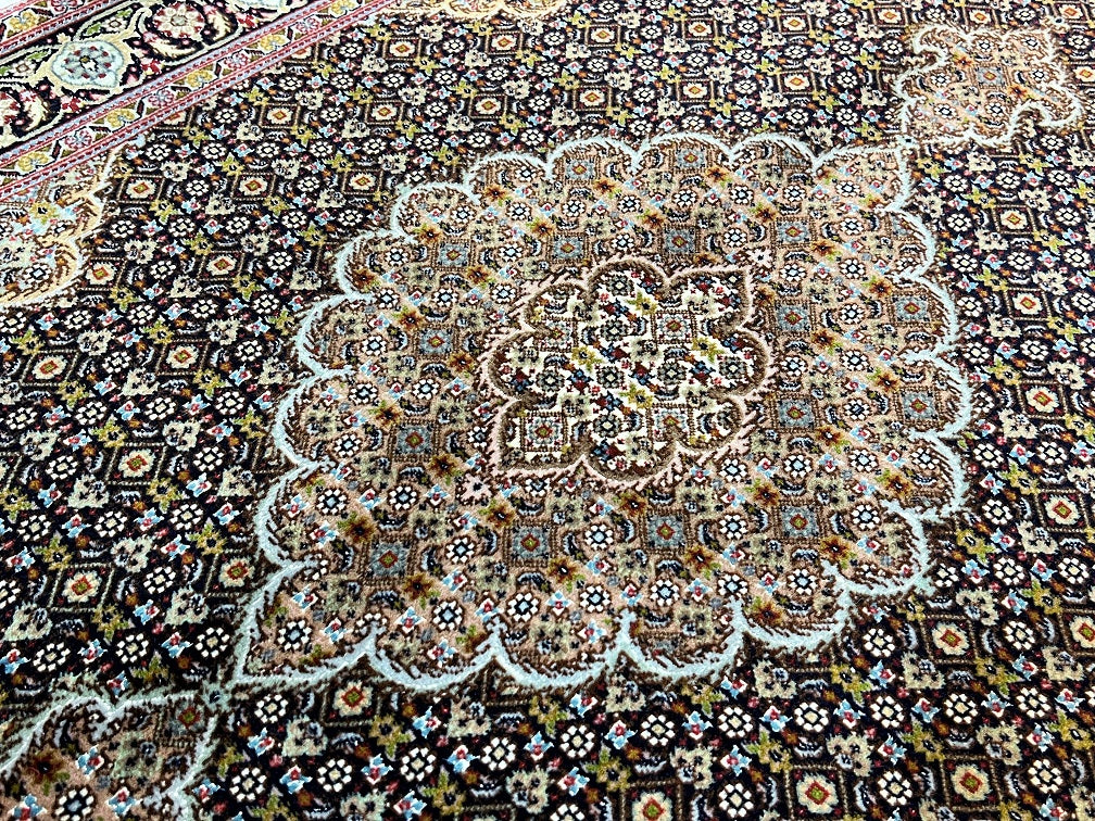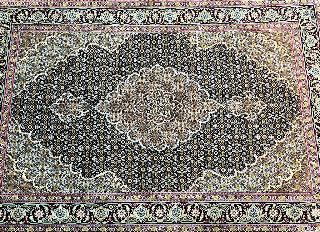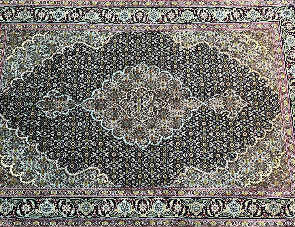 Masterpiece Authentic Handmade Persian Tabriz Rug. Above All It Is Hard To Find This Quality Handmade Rug (50raj). It Also Has A Lamb’s Wool And Silk Highlights Pile on Cotton Base. Black, Beige, Pistachio, Blue And Light Blue Tone Dyed Using Traditional Methods.