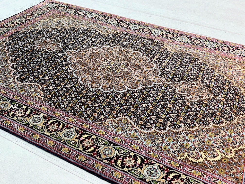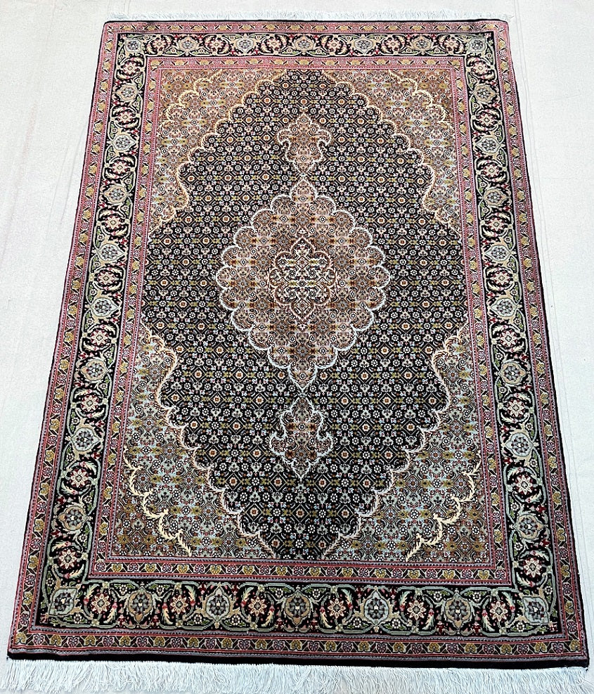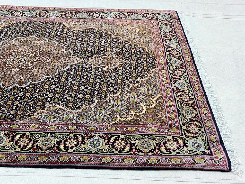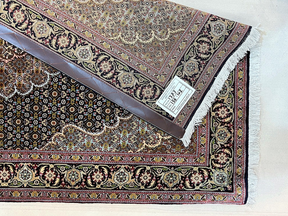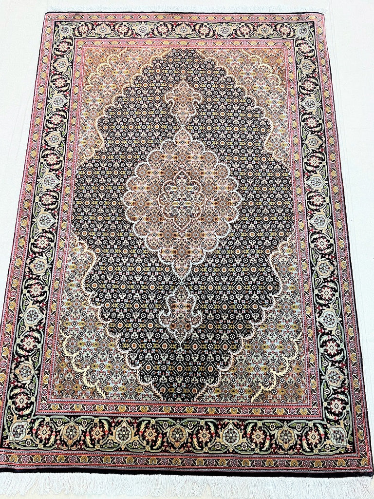 Masterpiece Authentic Handmade Persian Tabriz Rug. Above All It Is Hard To Find This Quality Handmade Rug (50raj). It Also Has A Lamb’s Wool And Silk Highlights Pile on Cotton Base. Black, Beige, Pistachio, Blue And Light Blue Tone Dyed Using Traditional Methods.