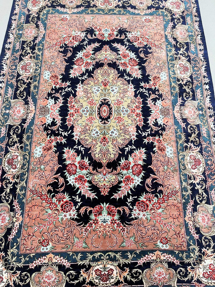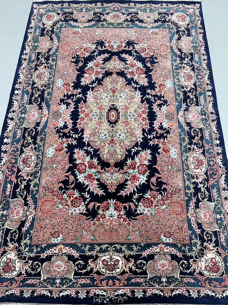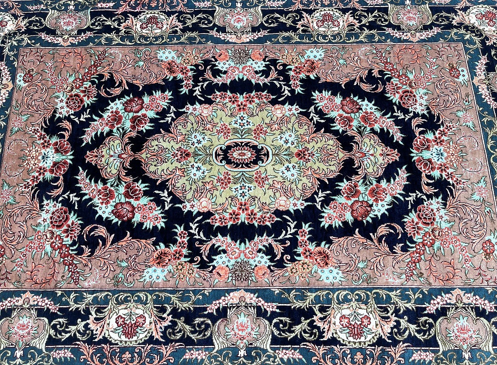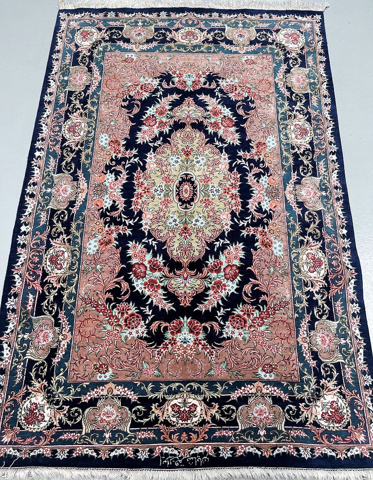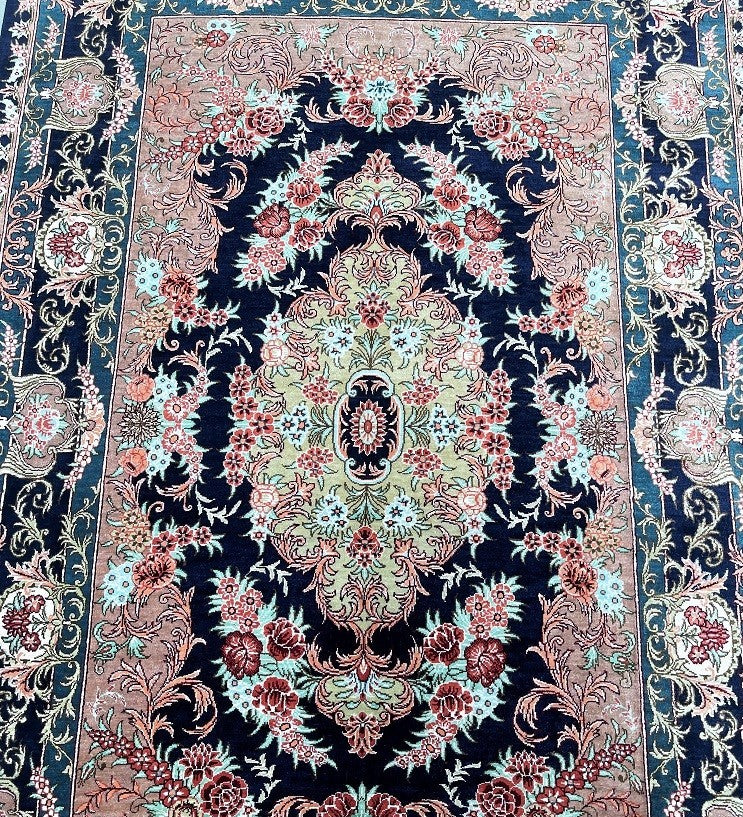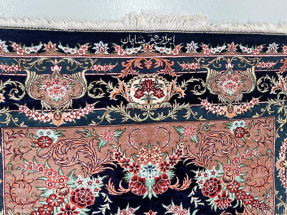 Superb Authentic Handmade Pure Silk Persian Qum Rug. Above All This Is An Original Persian Qum Rug Not An Indian Or Chinese Imitation. Indigo Blue, Beige, Pink, Green And Orange Tone Dyed Using Traditional Methods. Pin-Point Quality From Weaving House Of “Shayan-Qum”