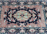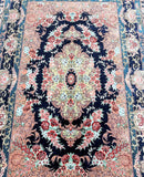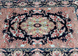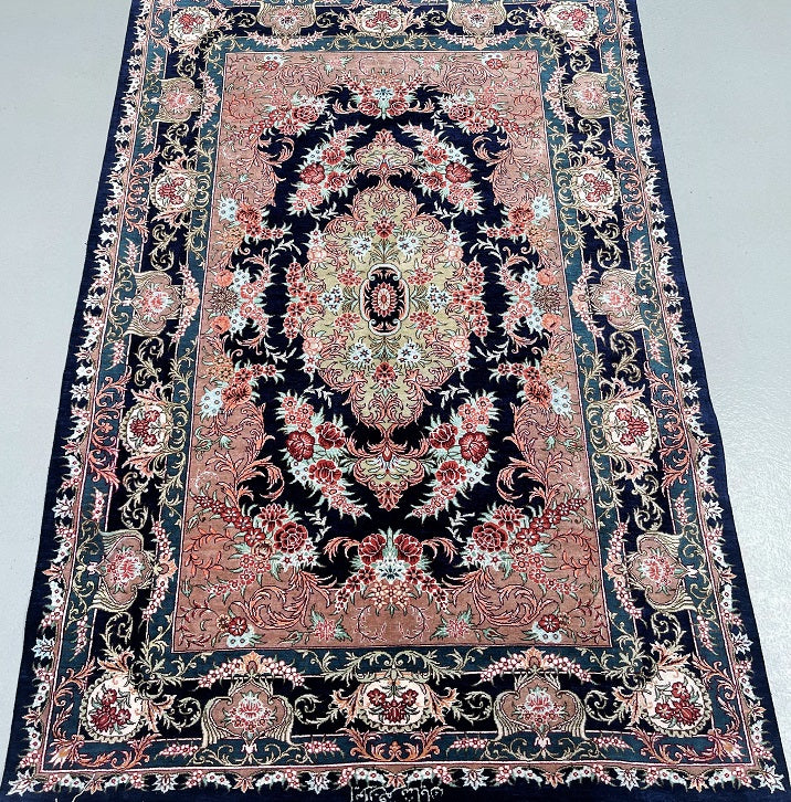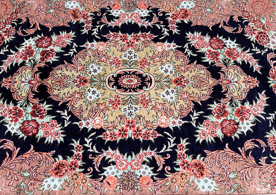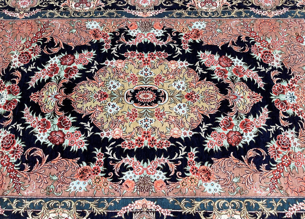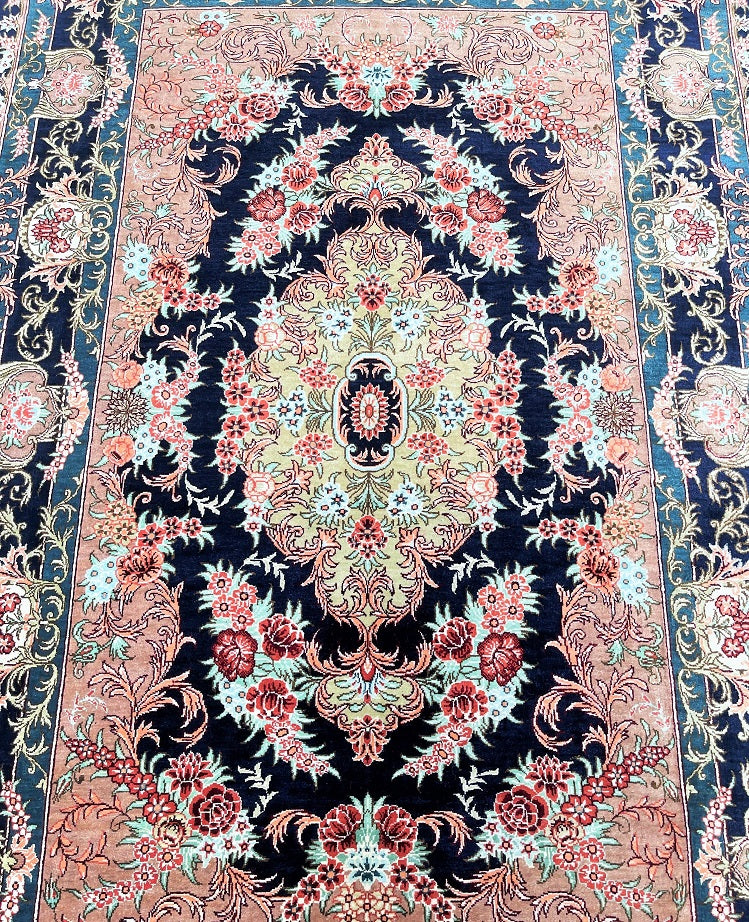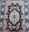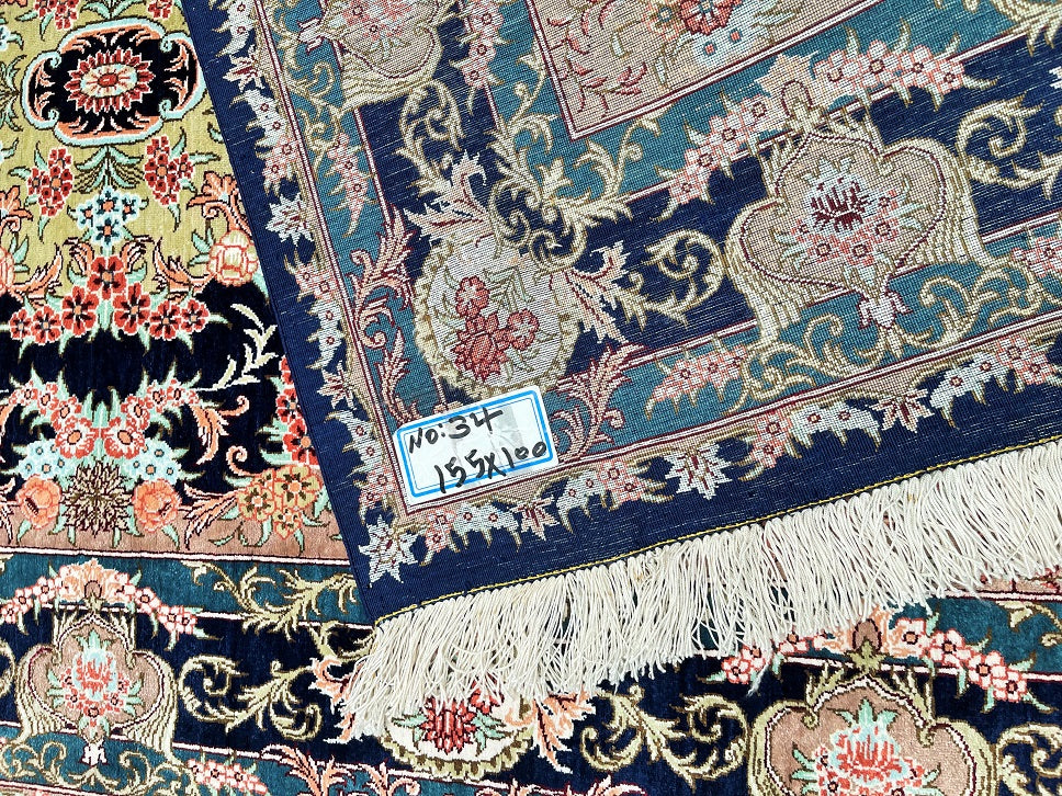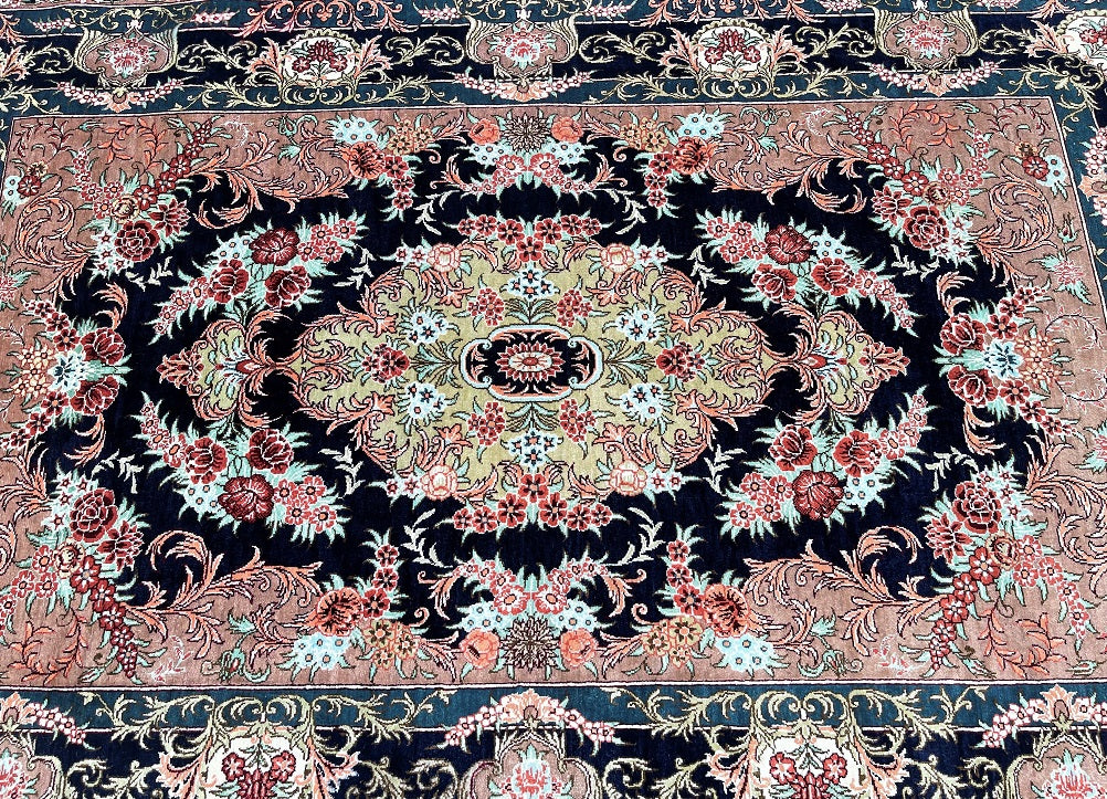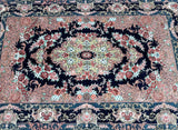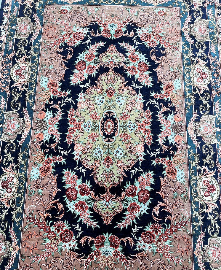 Superb Authentic Handmade Pure Silk Persian Qum Rug. Above All This Is An Original Persian Qum Rug Not An Indian Or Chinese Imitation. Indigo Blue, Beige, Pink, Green And Orange Tone Dyed Using Traditional Methods. Pin-Point Quality From Weaving House Of “Shayan-Qum”