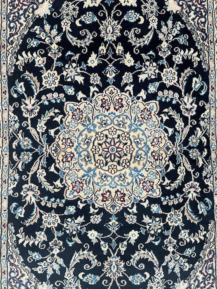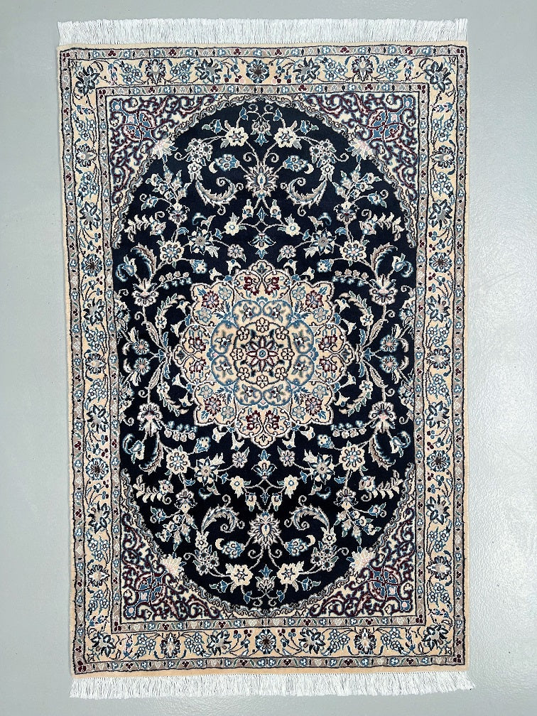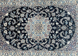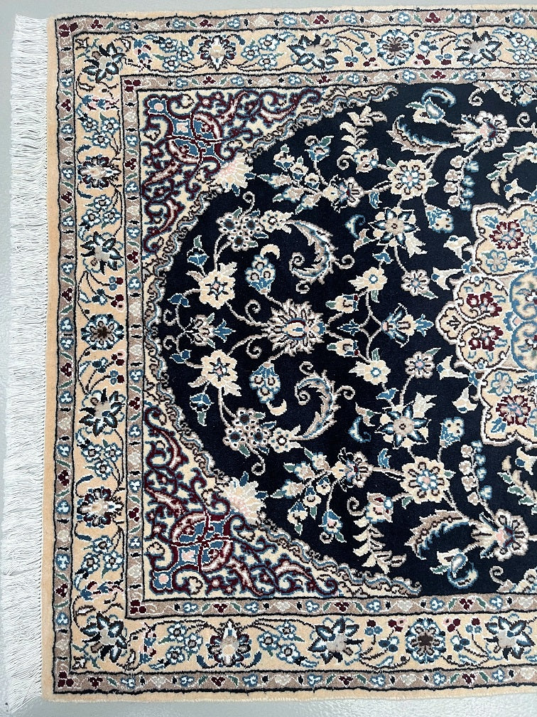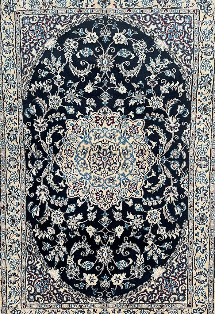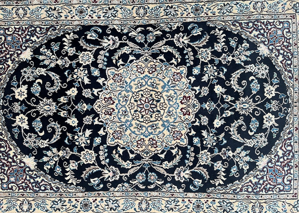 Superb Coffee Table Size Authentic Persian Nain Carpet. Above All It Is Hard To Get This Quality Original Handmade Traditional Rug. Never The Less It’s Lamb’s Wool Pile Cotton Base. Indigo Blue, Beige, French Blue And Burgundy Tone Dyed Using Traditional Methods.