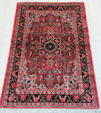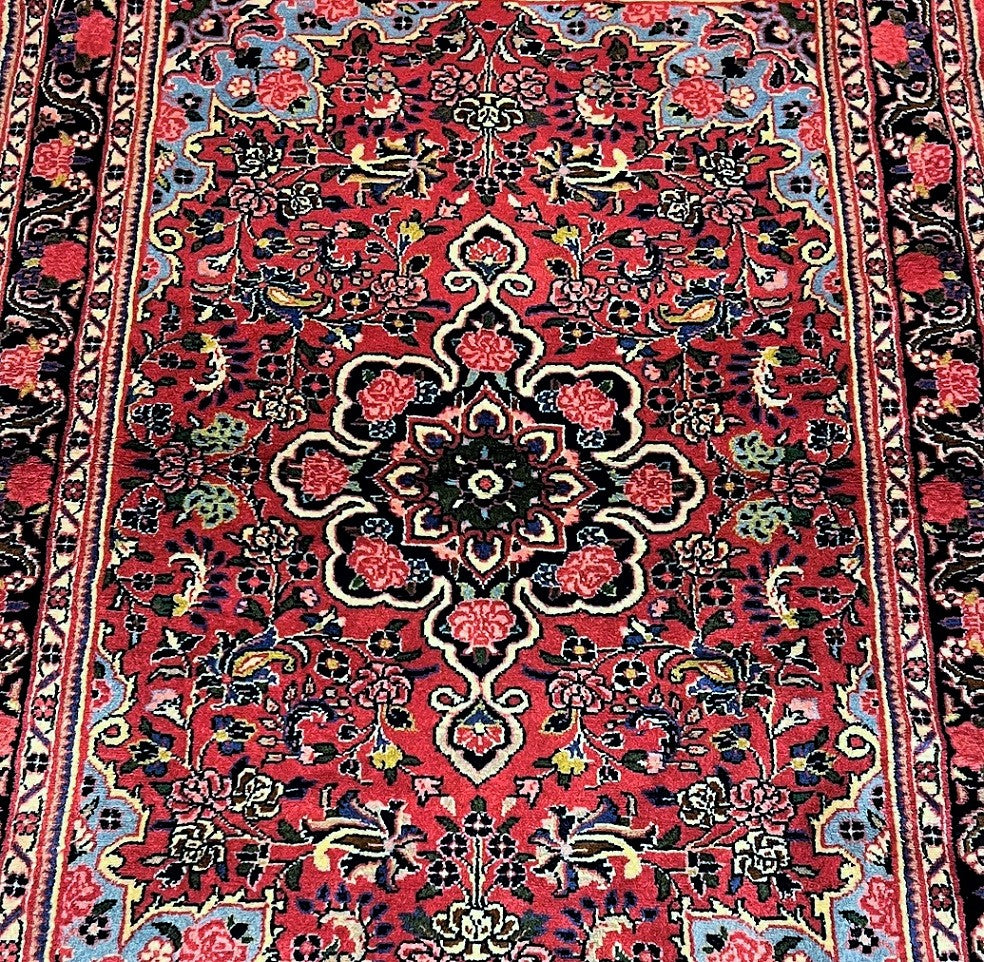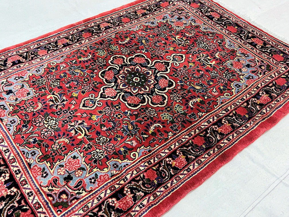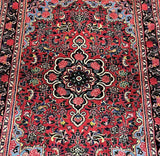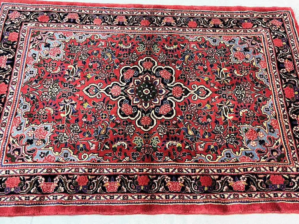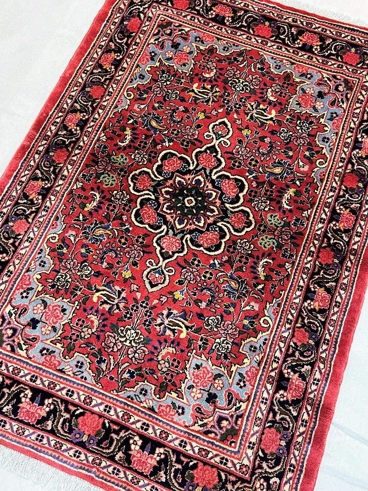 Coffee Table Size Authentic Handmade Persian Hamedan Rug. Above All It Is A Unique Nomadic Rug. Pure Hand Spun Wool Pile On Cotton Base. It Also Has a Red, Beige, Pink, French Blue, Black And Green Tone Dyed Using Traditional Methods.