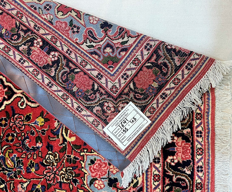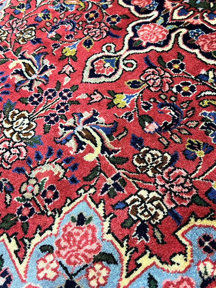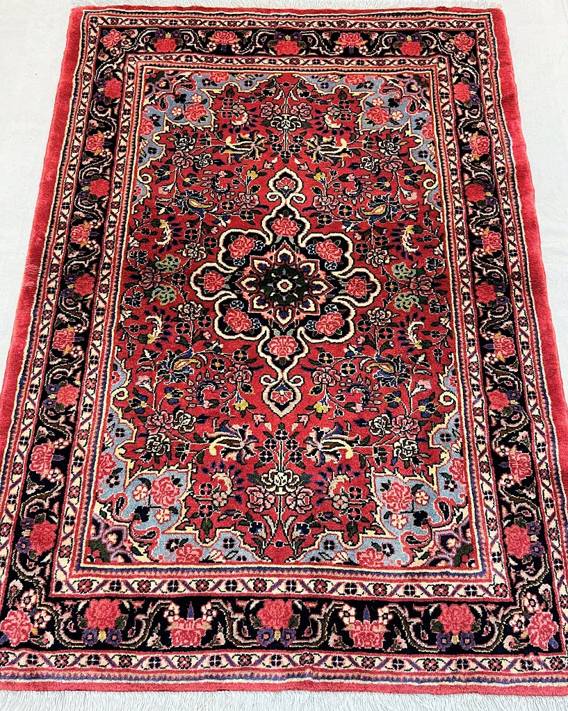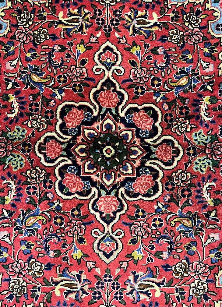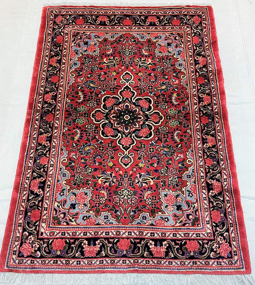 Coffee Table Size Authentic Handmade Persian Hamedan Rug. Above All It Is A Unique Nomadic Rug. Pure Hand Spun Wool Pile On Cotton Base. It Also Has a Red, Beige, Pink, French Blue, Black And Green Tone Dyed Using Traditional Methods.