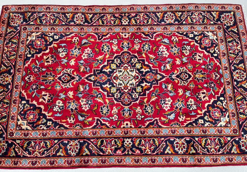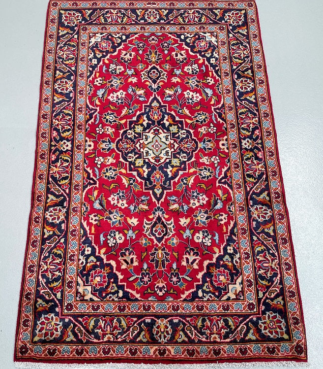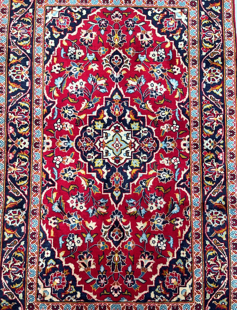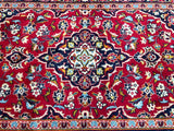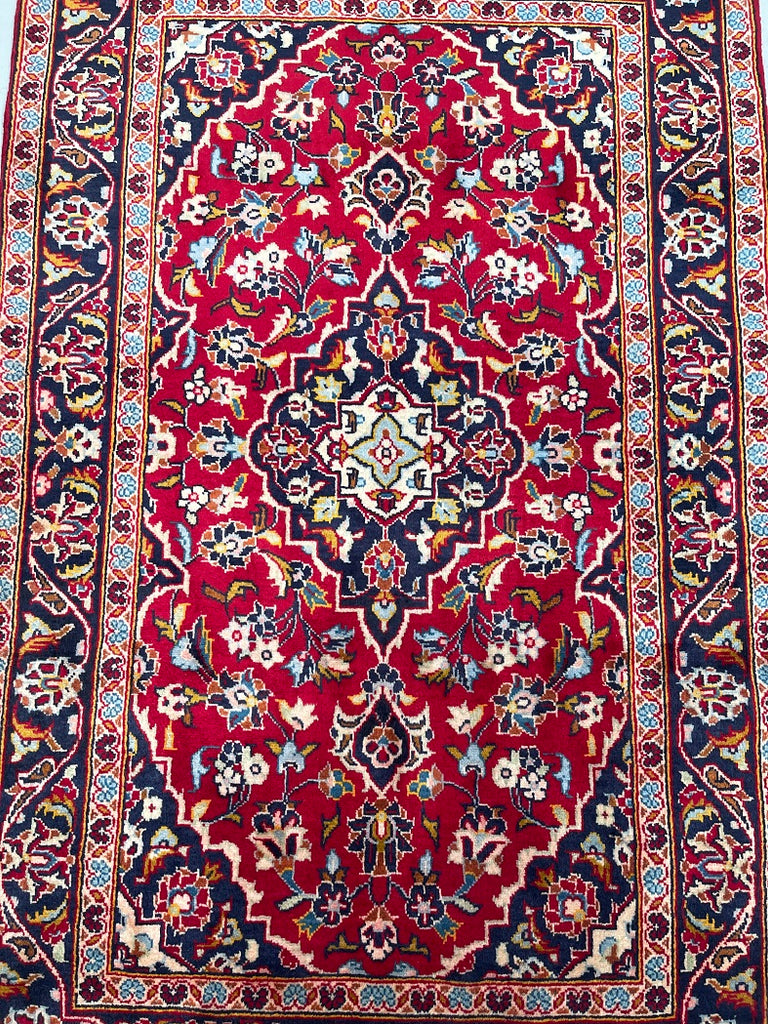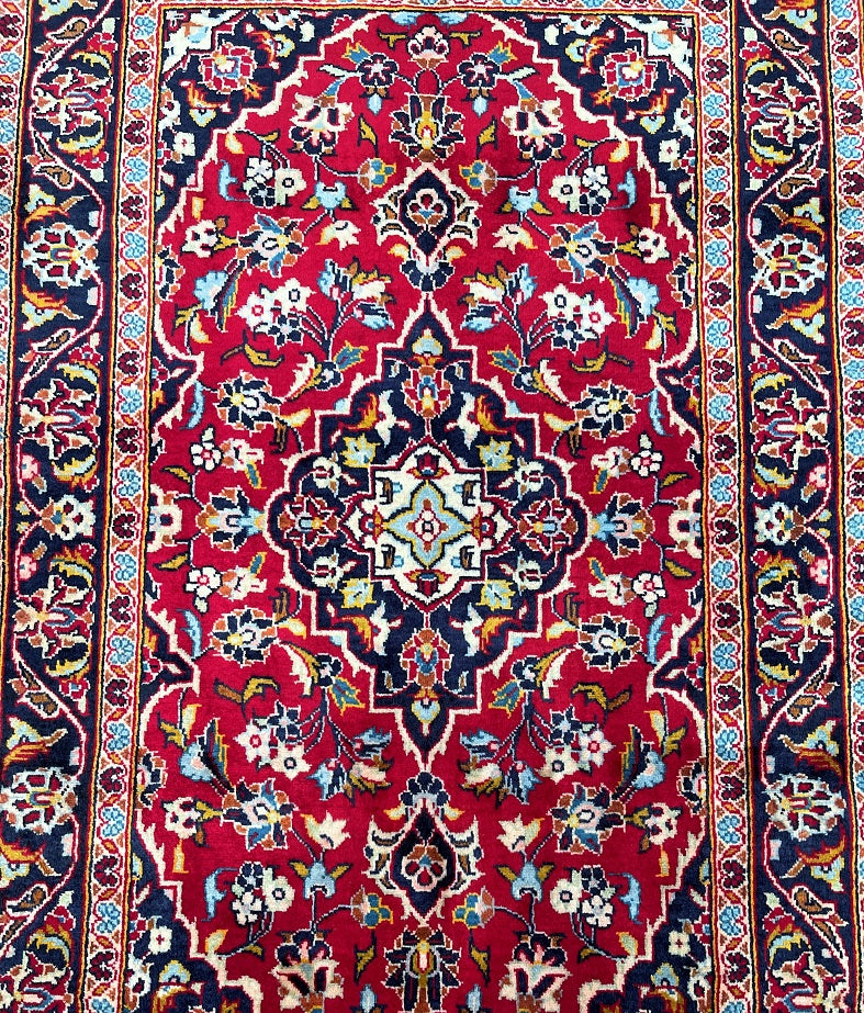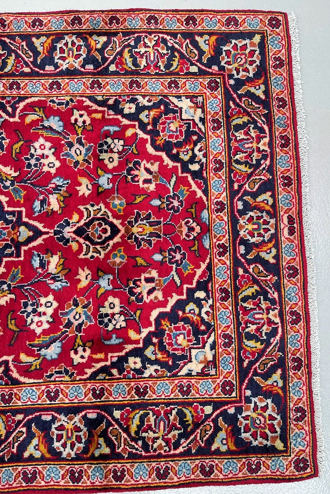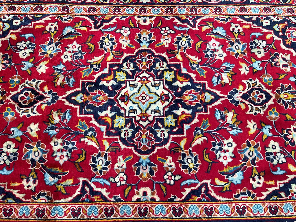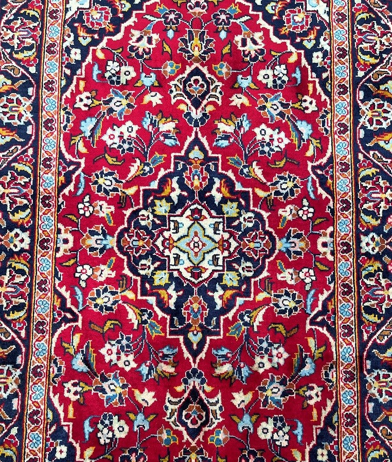 Fine Coffee Table Size Authentic Handmade Persian Kashan Rug. It Has a Pure Lamb’s Wool Pile on Cotton Base. Stunning Red, Beige, Orange, Mustard Green, Yellow And Blue Tone Dyed Using Traditional Methods.
