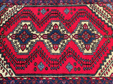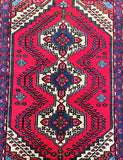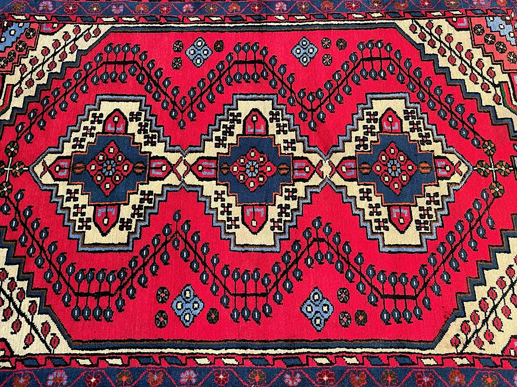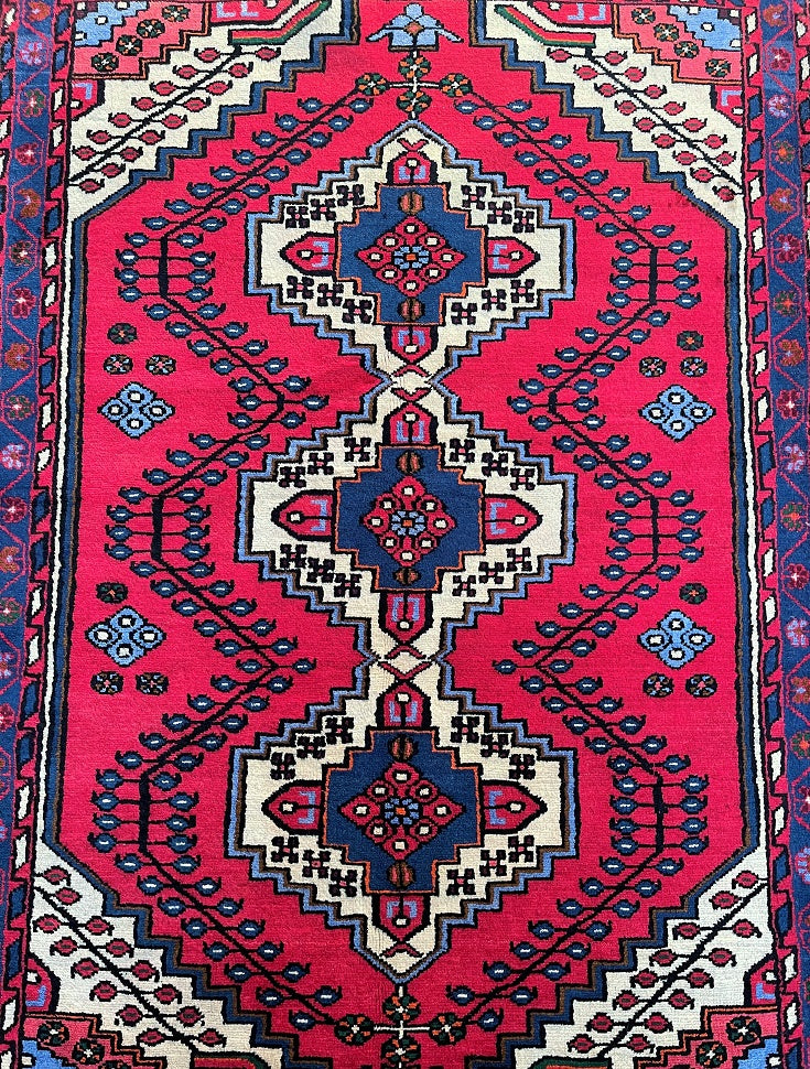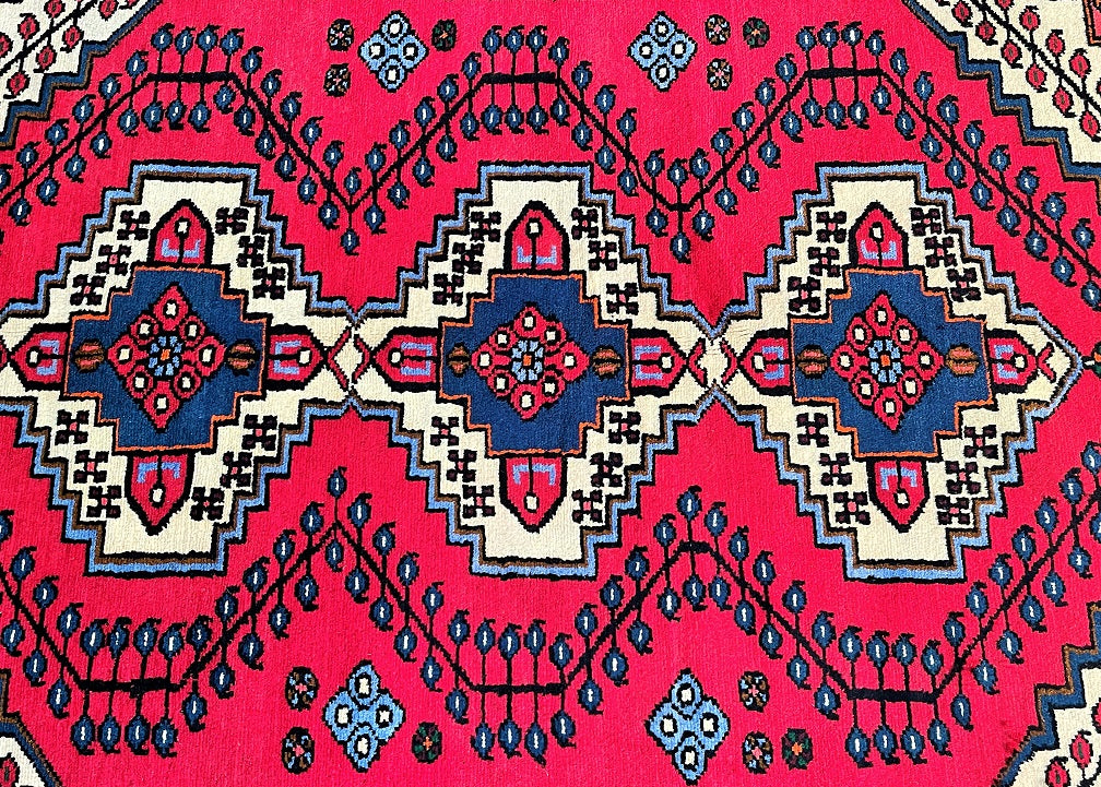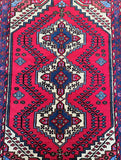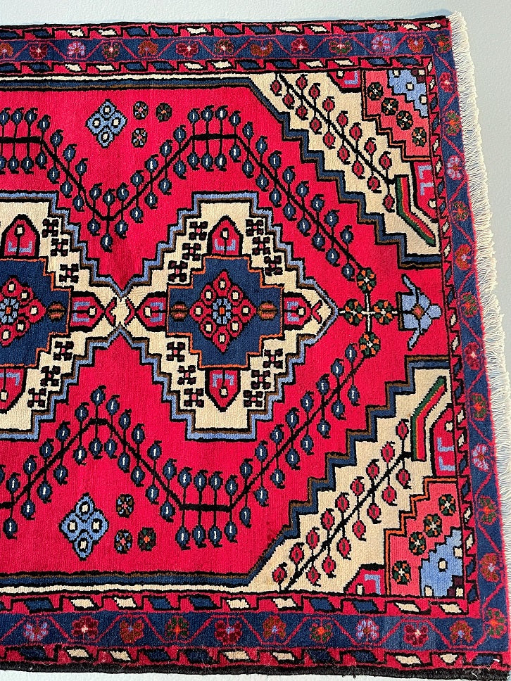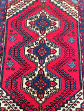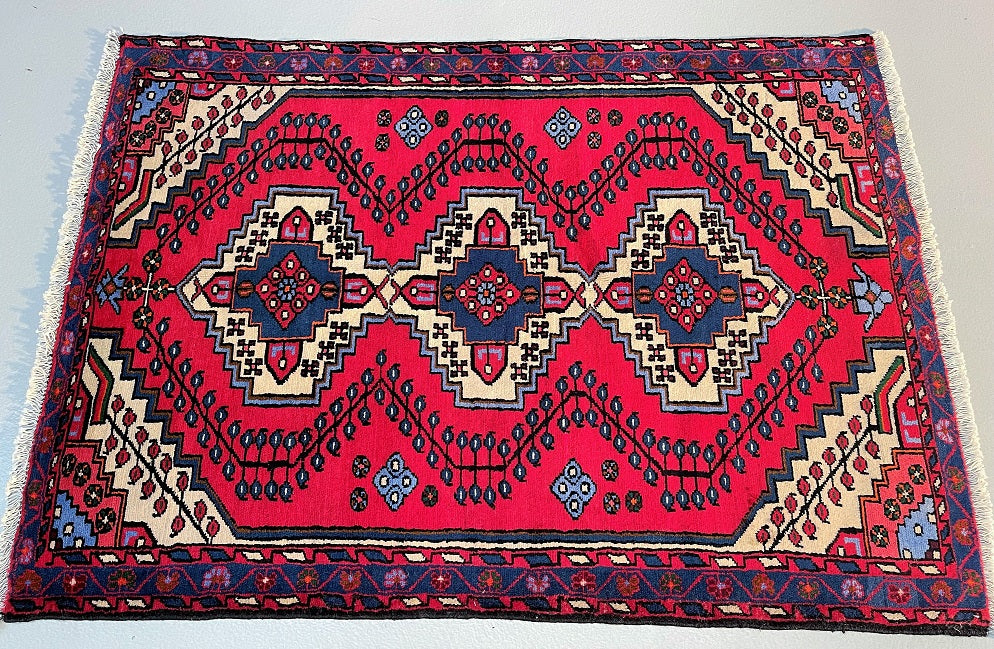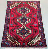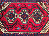 Coffee Table Size Handmade Persian Hamedan Rug. Above All We Have This Rug In A Matching Pair. Pure Hand Spun Wool Pile On Cotton Base. It Also Has a Pinkish Red, Blues, Black And Brown Tone Dyed Using Traditional Methods.
