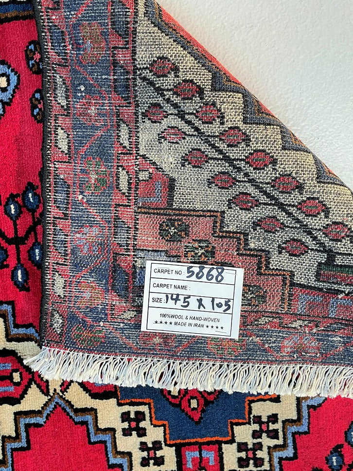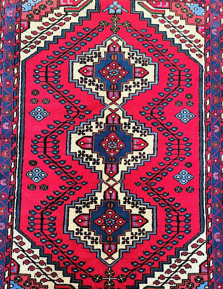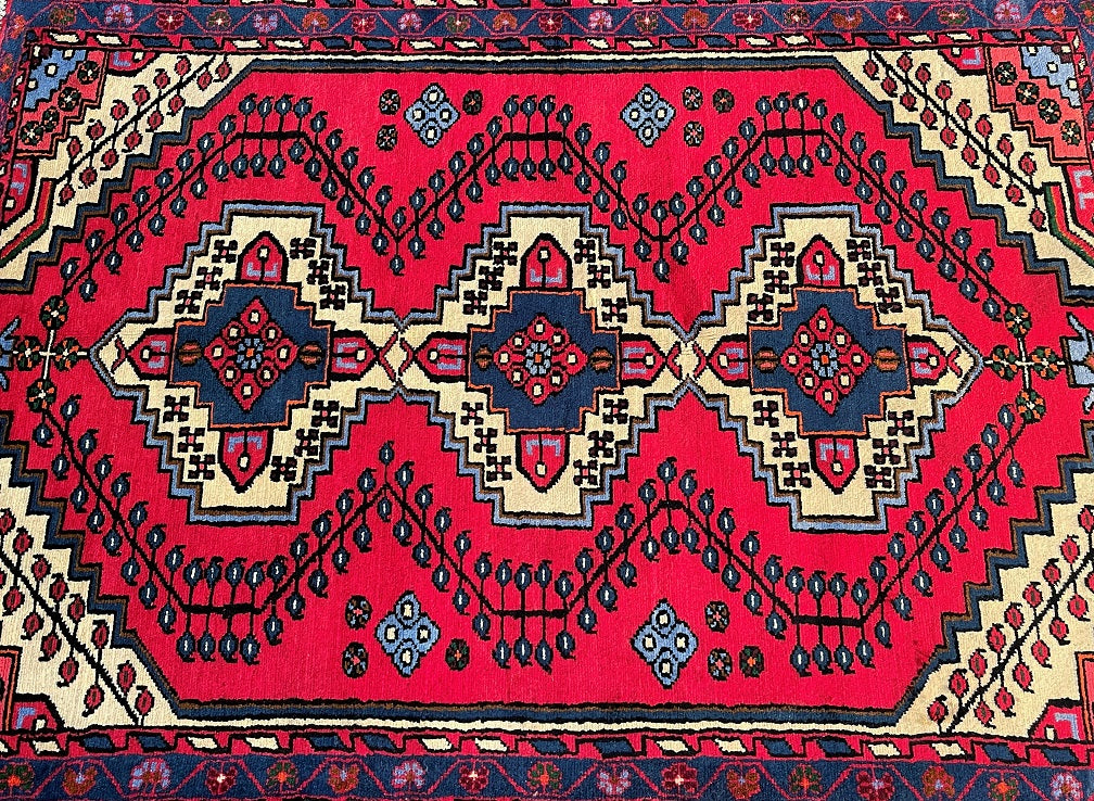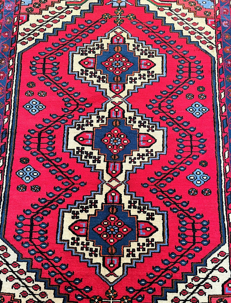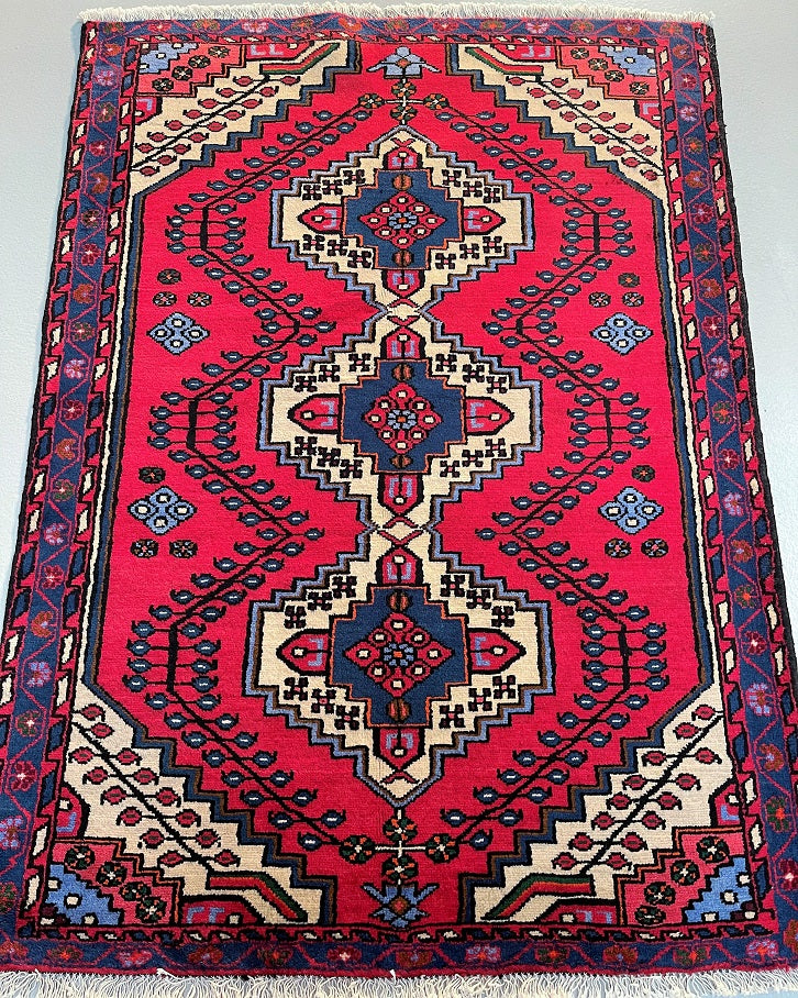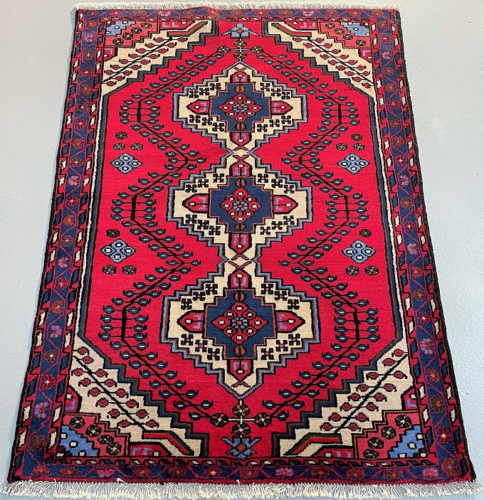 Coffee Table Size Handmade Persian Hamedan Rug. Above All We Have This Rug In A Matching Pair. Pure Hand Spun Wool Pile On Cotton Base. It Also Has a Pinkish Red, Blues, Black And Brown Tone Dyed Using Traditional Methods.