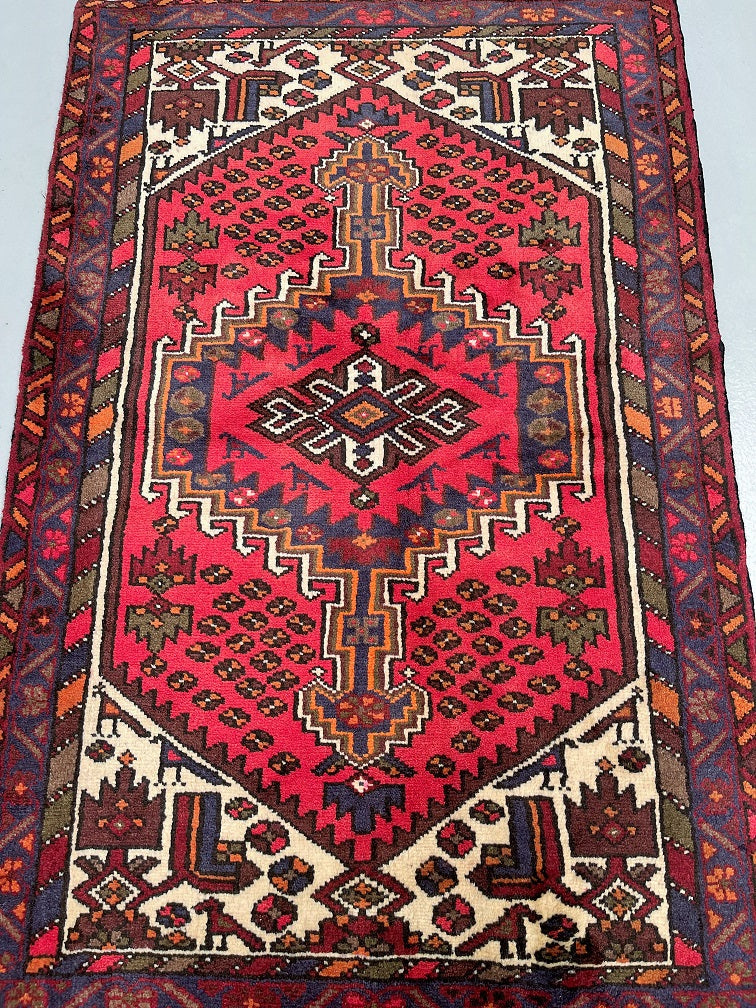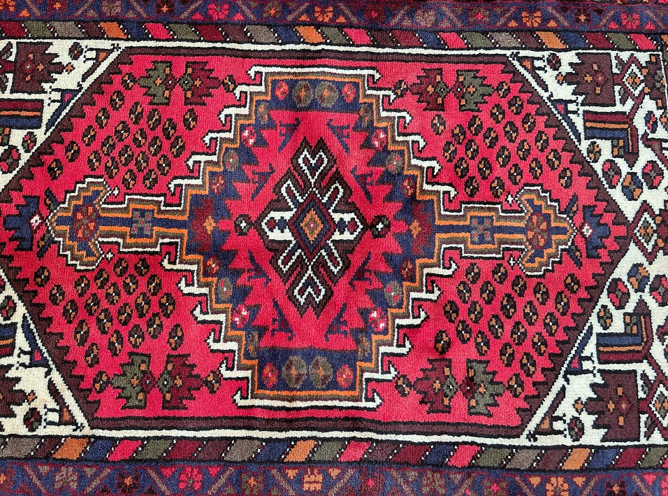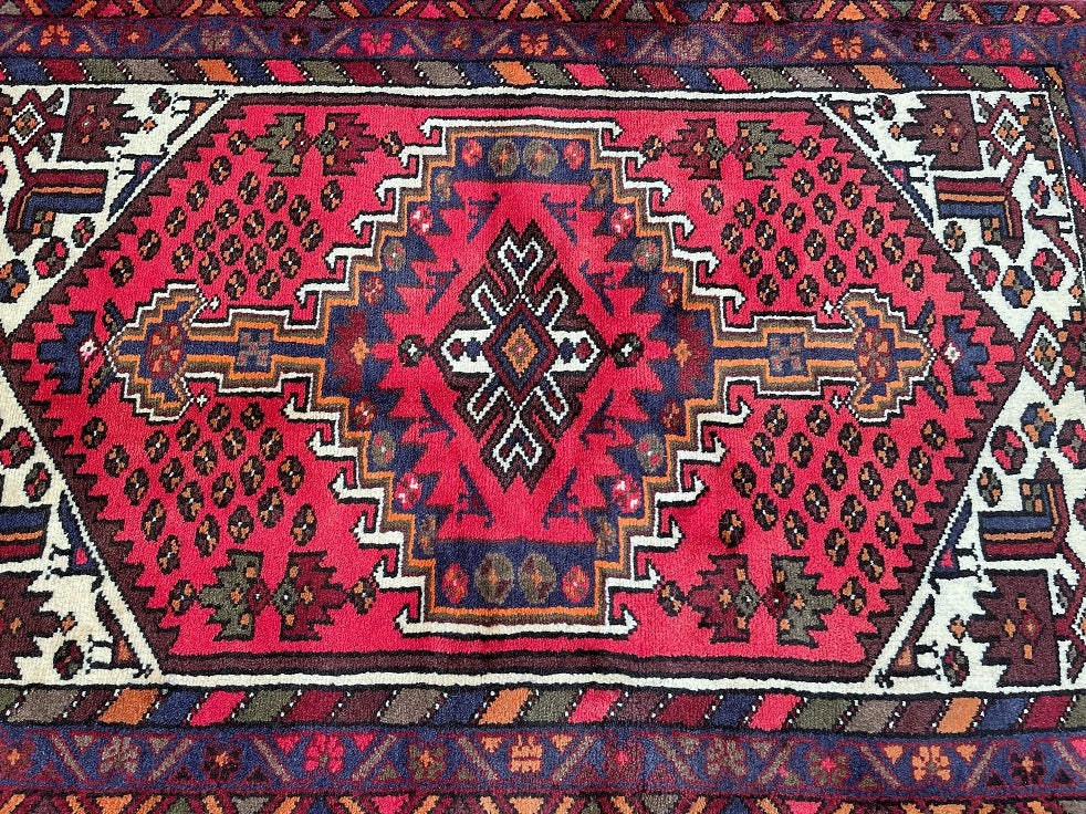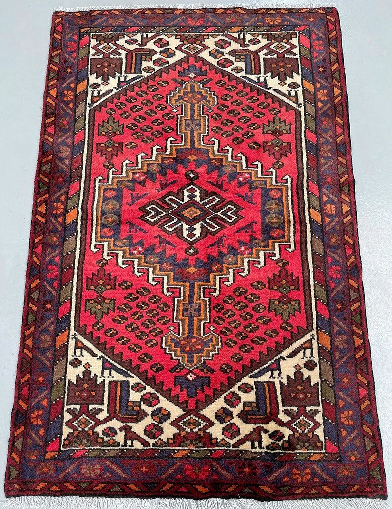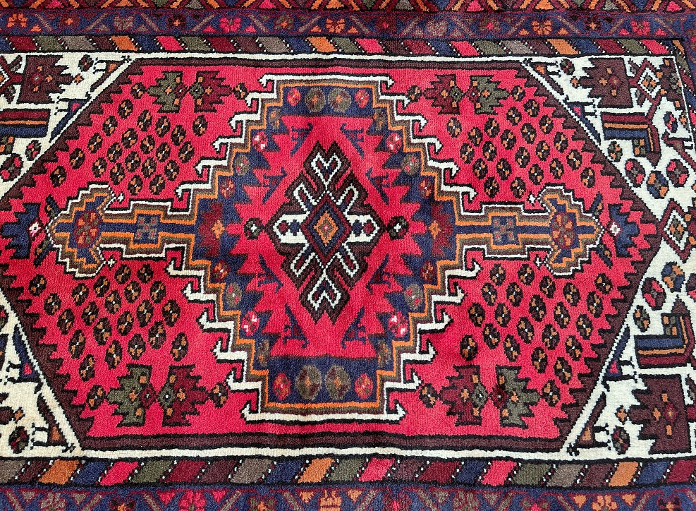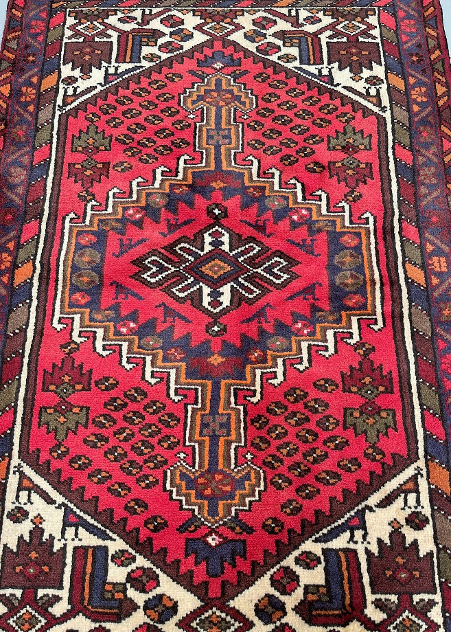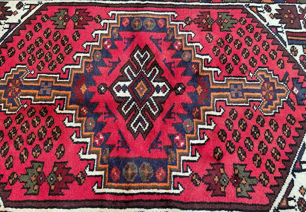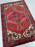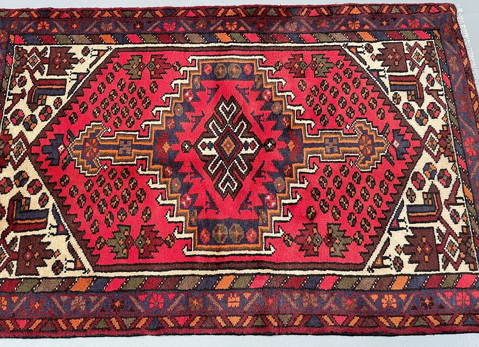 Genuine Handmade Tribal Persian Khamseh Rug. Above All It Has A Pure Hand Spun Wool Pile On Cotton Base. It Also Has A Red, Burnt Orange, Green, Beige, Blue And Brown Tone Dyed Using Traditional Methods.