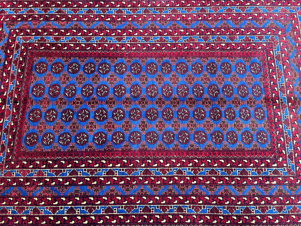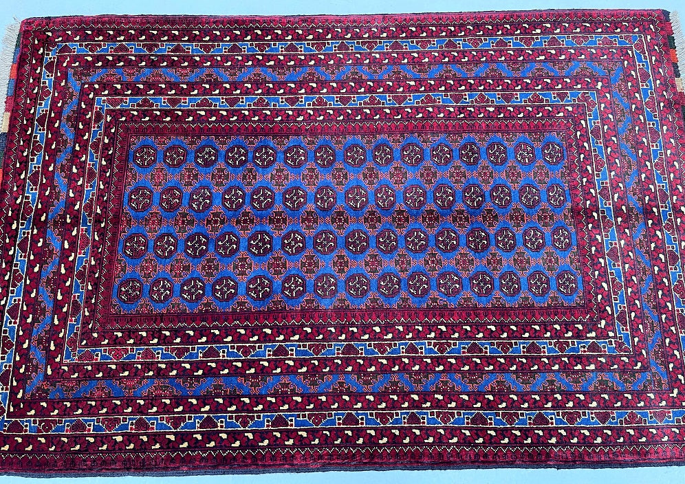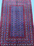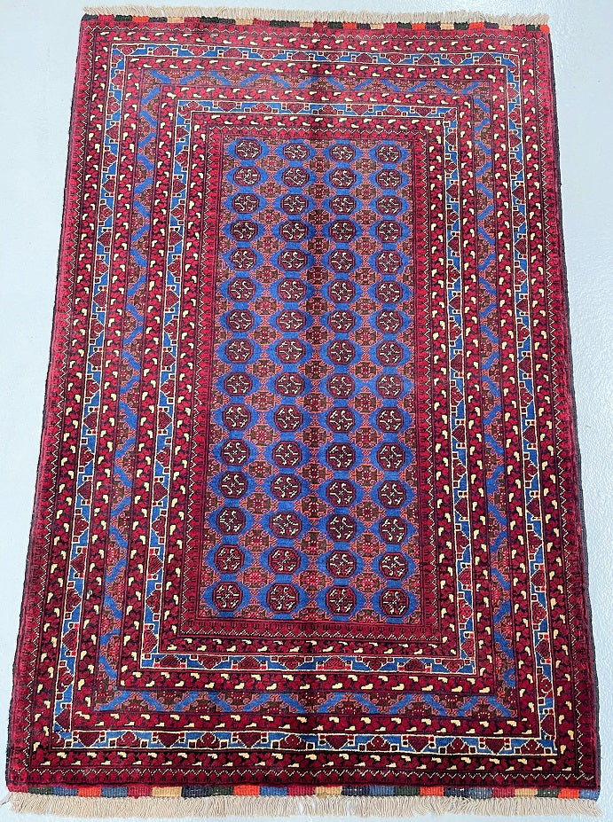 Superb Coffee Table Size Handmade Afghan Roshnai Rug. Above All It Is Pure Hand Spun Wool Pile On Cotton Base. It Also Has A Blue, Maroon With Touch Of Beige, Orange And Green Tone Dyed Using Traditional Methods.