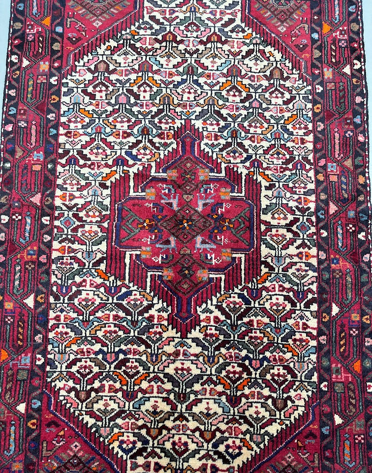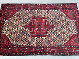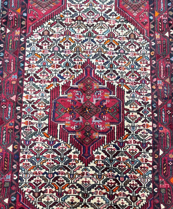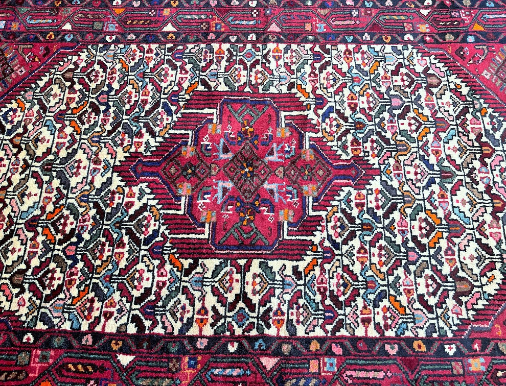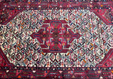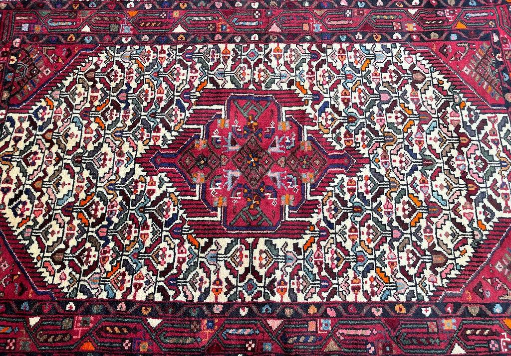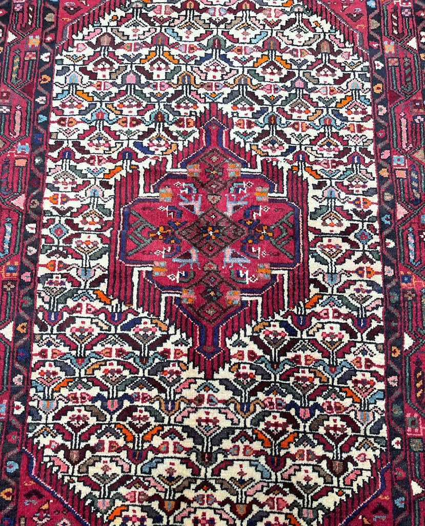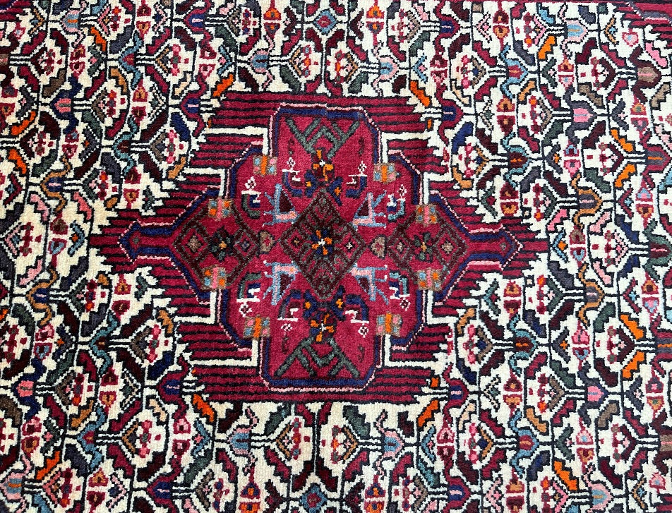 Coffee Table Size Authentic Handmade Persian Hamedan Rug. Above All It Is A Very Unique Nomadic Rug. Pure Hand Spun Wool Pile On Cotton Base. It Also Has a Beige, Orange, Maroon, Blue Orange, Pink And Green Tone Dyed Using Traditional Methods.