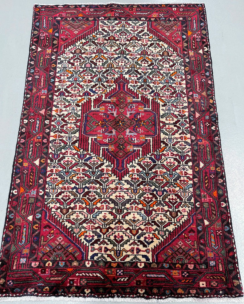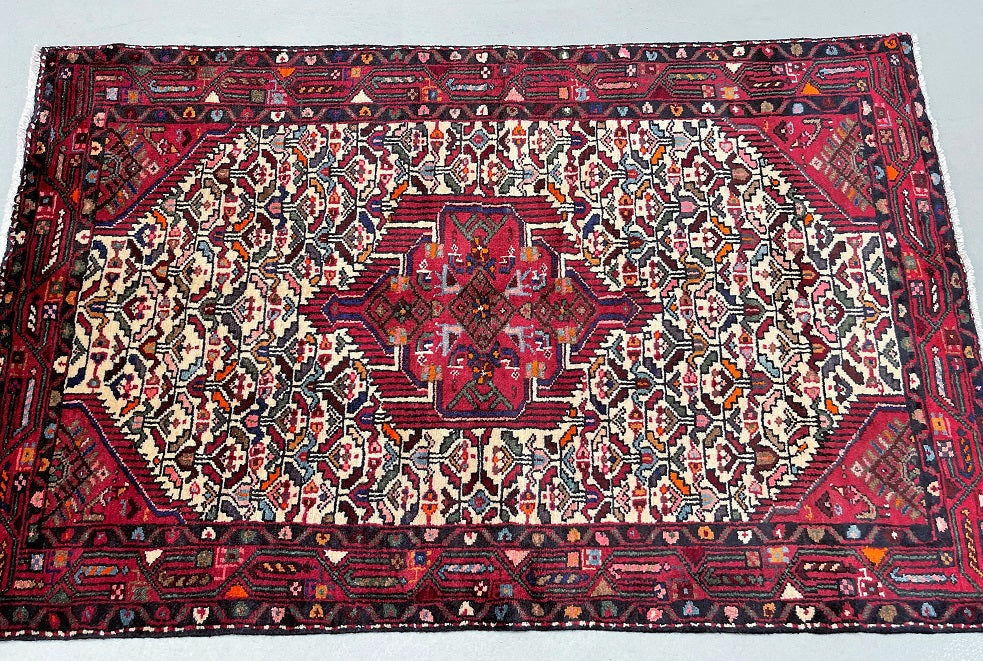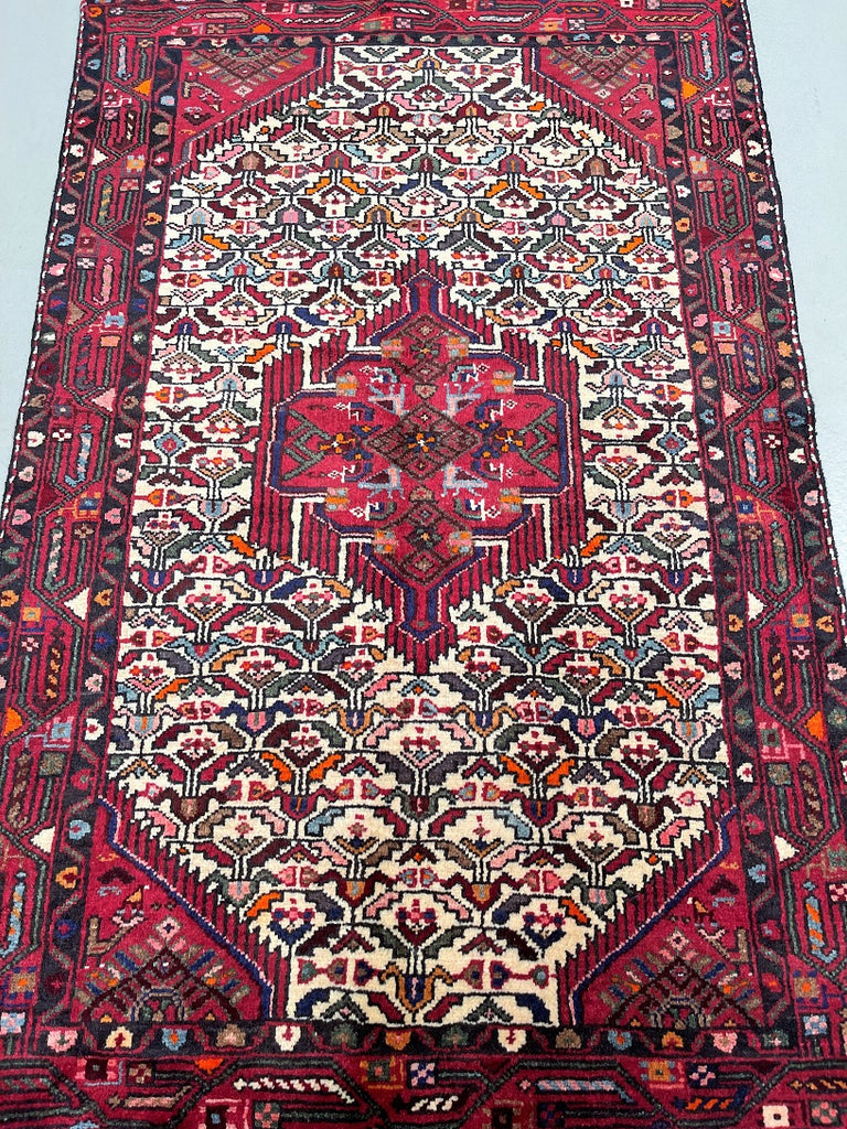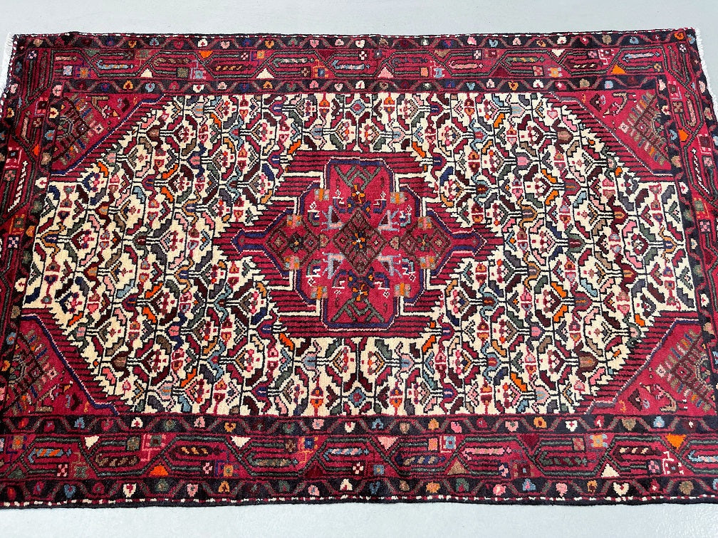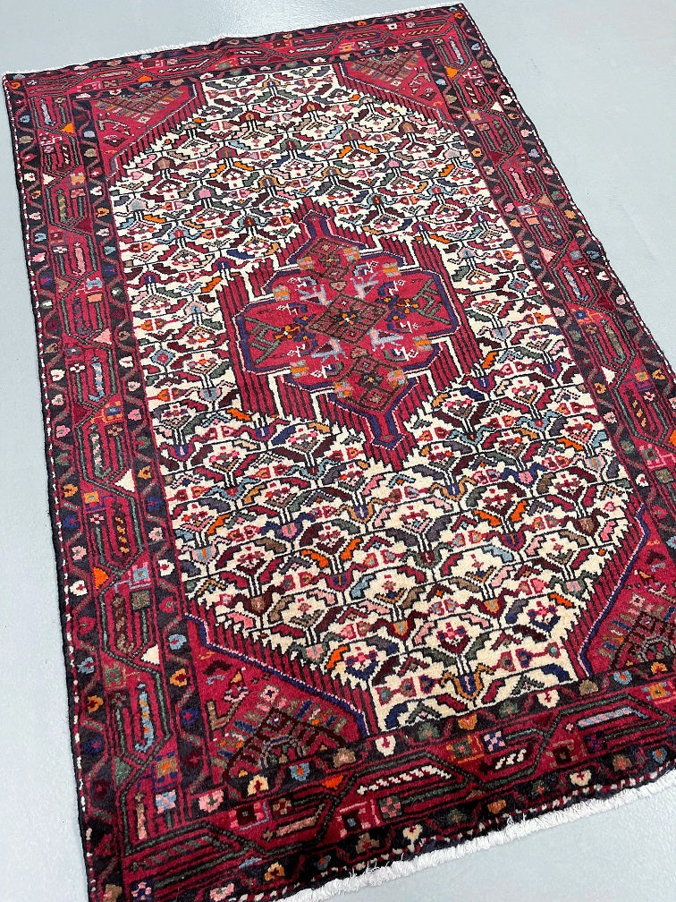 Coffee Table Size Authentic Handmade Persian Hamedan Rug. Above All It Is A Very Unique Nomadic Rug. Pure Hand Spun Wool Pile On Cotton Base. It Also Has a Beige, Orange, Maroon, Blue Orange, Pink And Green Tone Dyed Using Traditional Methods.