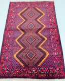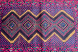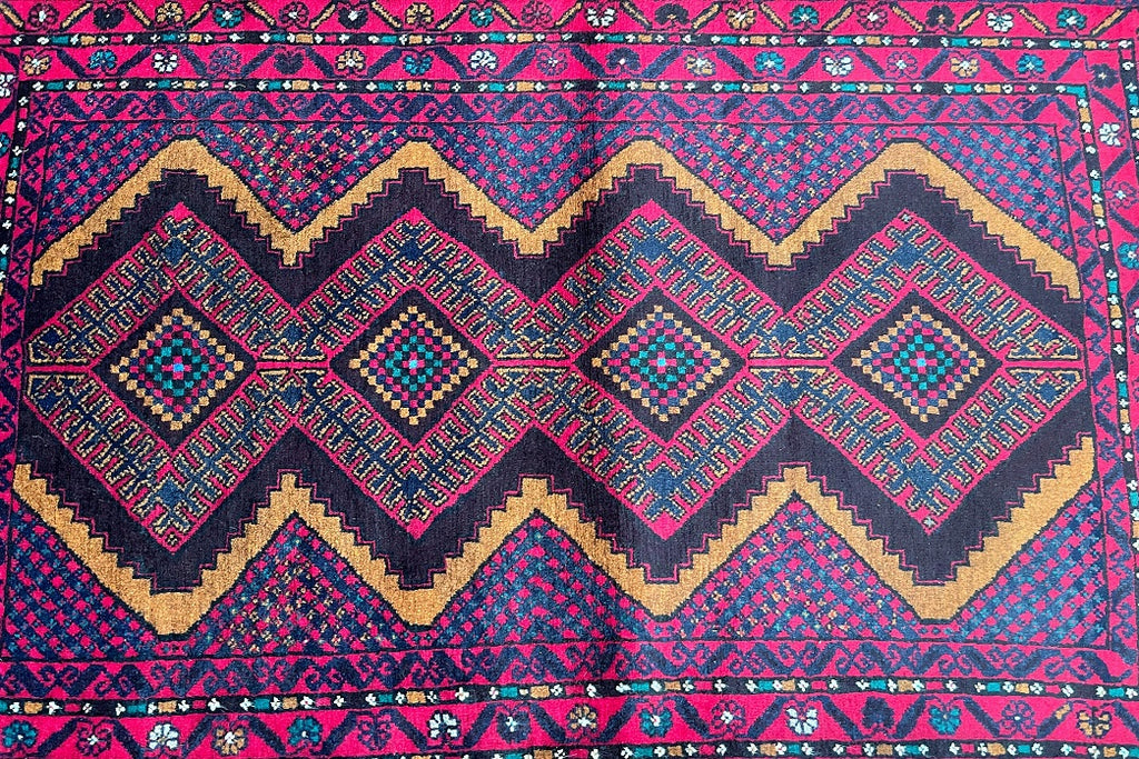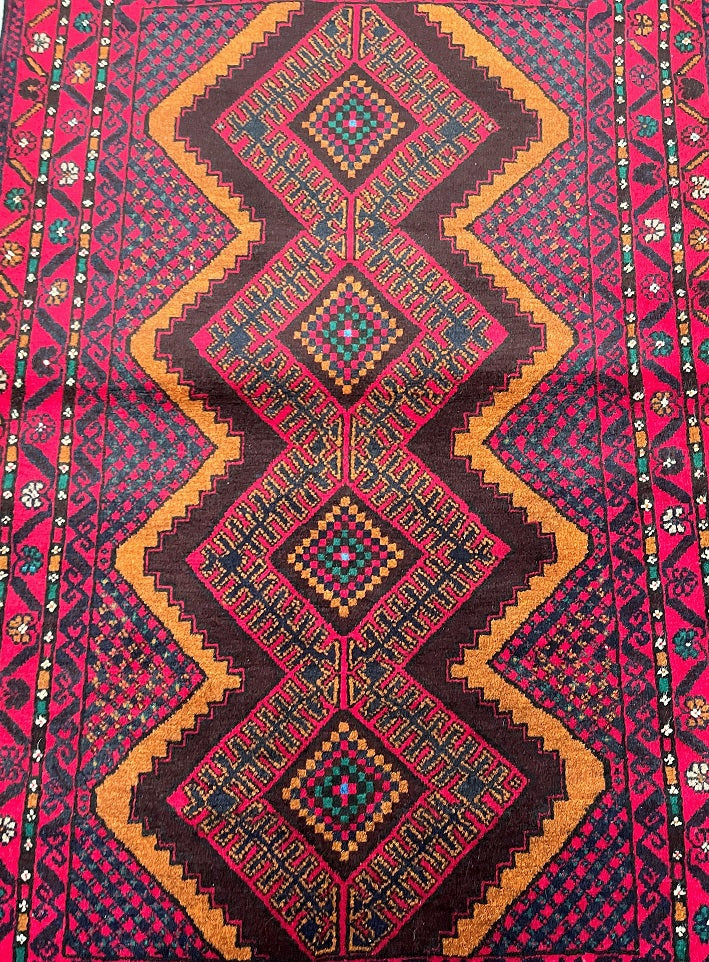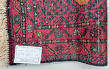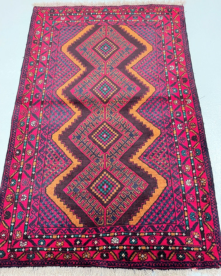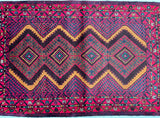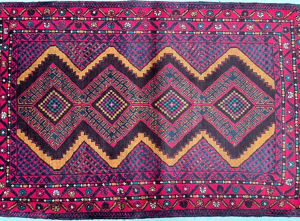 Vintage Afghan Balouchi Carpet, a versatile piece that can be used as both a carpet and a short runner. This carpet features a construction of pure hand-spun wool on wool, ensuring its quality and durability. The main colors of this carpet include red, black, mustard, brown, blue, and green, all achieved through traditional dyeing methods. It showcases a captivating geometric medallions tribal design. It is estimated that it would have taken a skilled weaver around 1-2 months to complete weaving this rug. Hand-woven in Afghanistan by a nomadic Balouchi weaver, this carpet measures 146 x 97 cm and holds a gallery replacement valuation of $995.