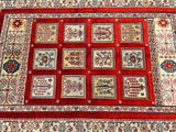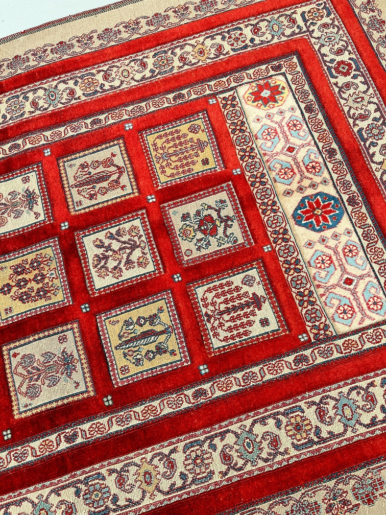 Rare Coffee Table Size Handmade Persian Afshari Sirjan Sumak Tapestry Rug. Three Weaving Technique Used To Make This Stunning Piece Of Art. It also Has A Pure Hand Spun Wool Pile On Wool Base. Red And Gold Tone Dyed Using Traditional Methods.