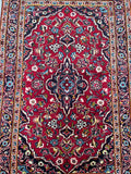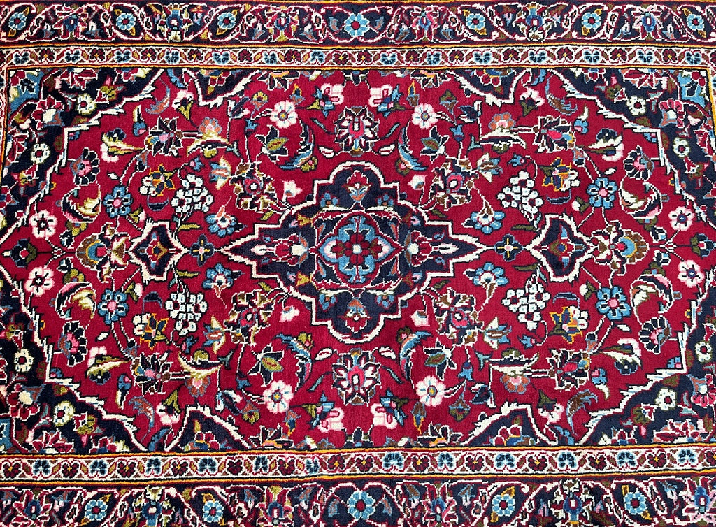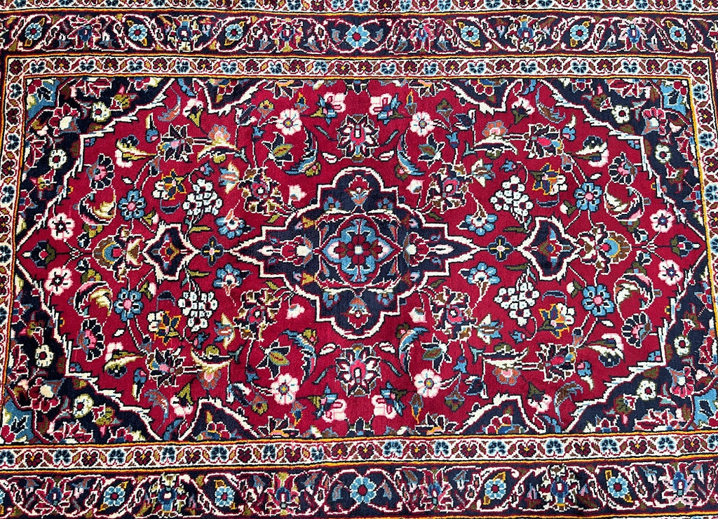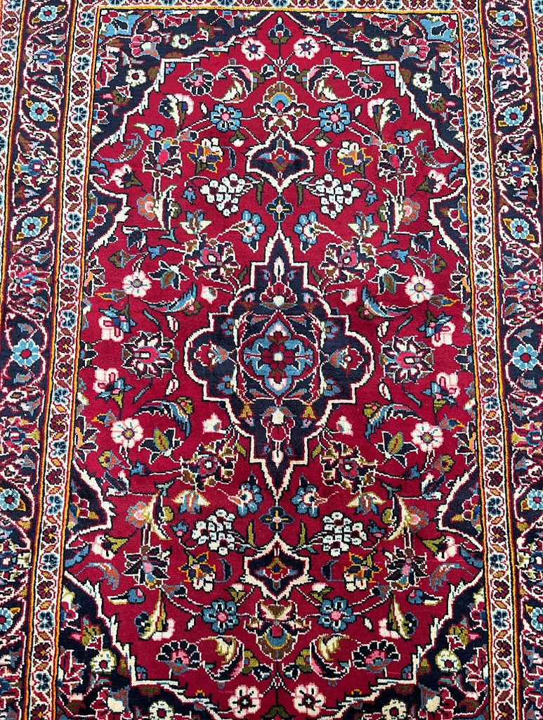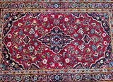 Fine Coffee Table Size Authentic Handmade Persian Kashan Rug. It Has a Pure Lamb’s Wool Pile on Cotton Base. Maroon Red, Beige, Orange, Green And Indigo Blue Tone Dyed Using Traditional Methods.