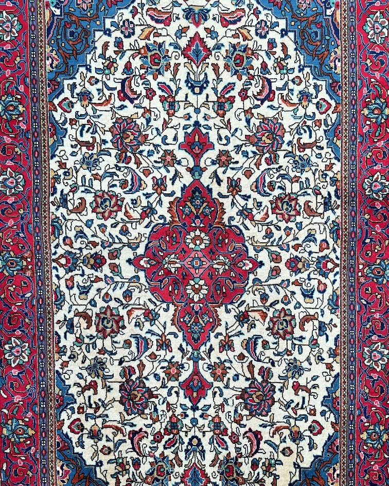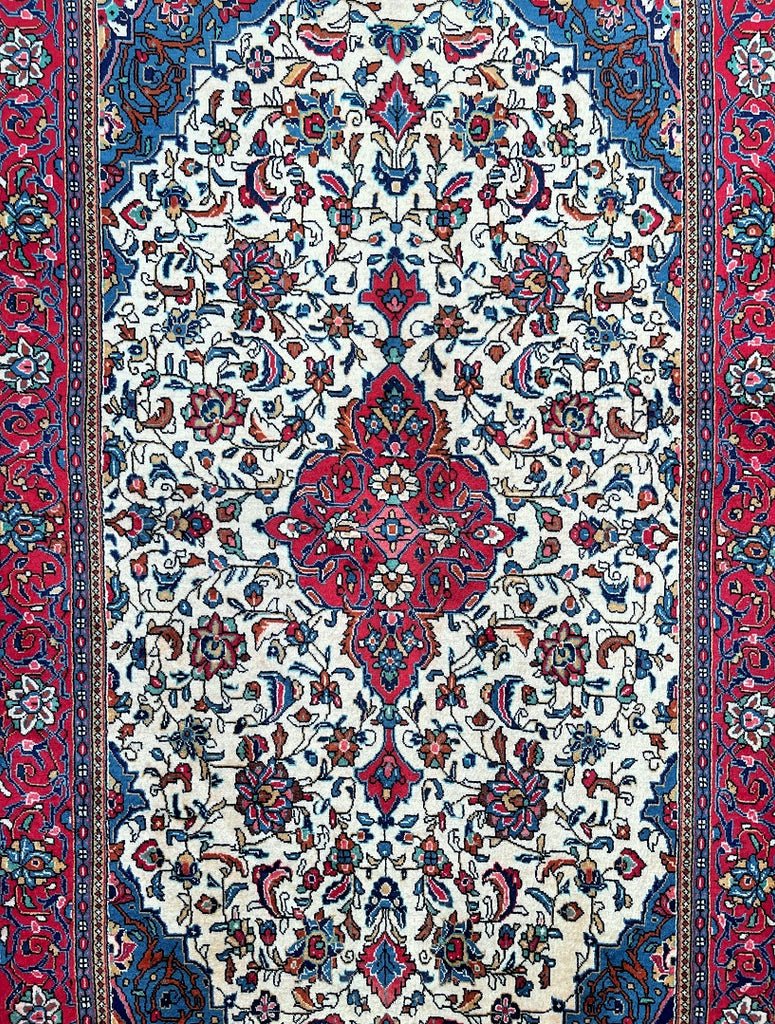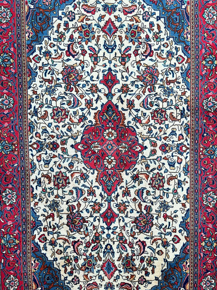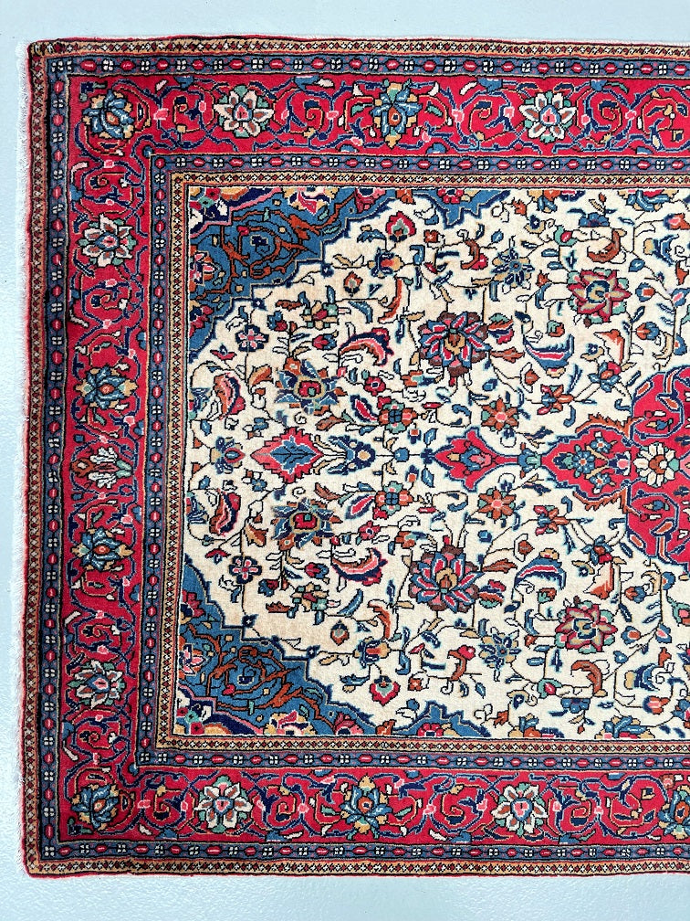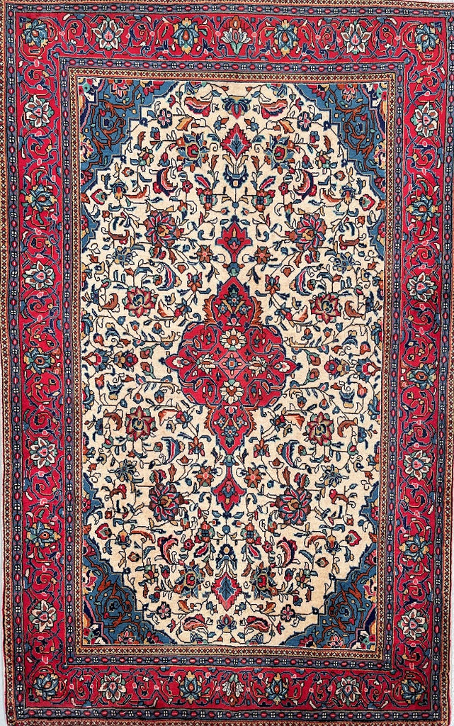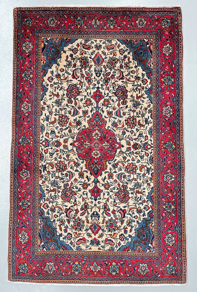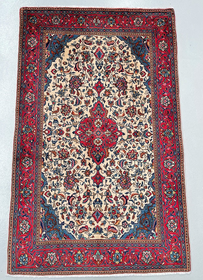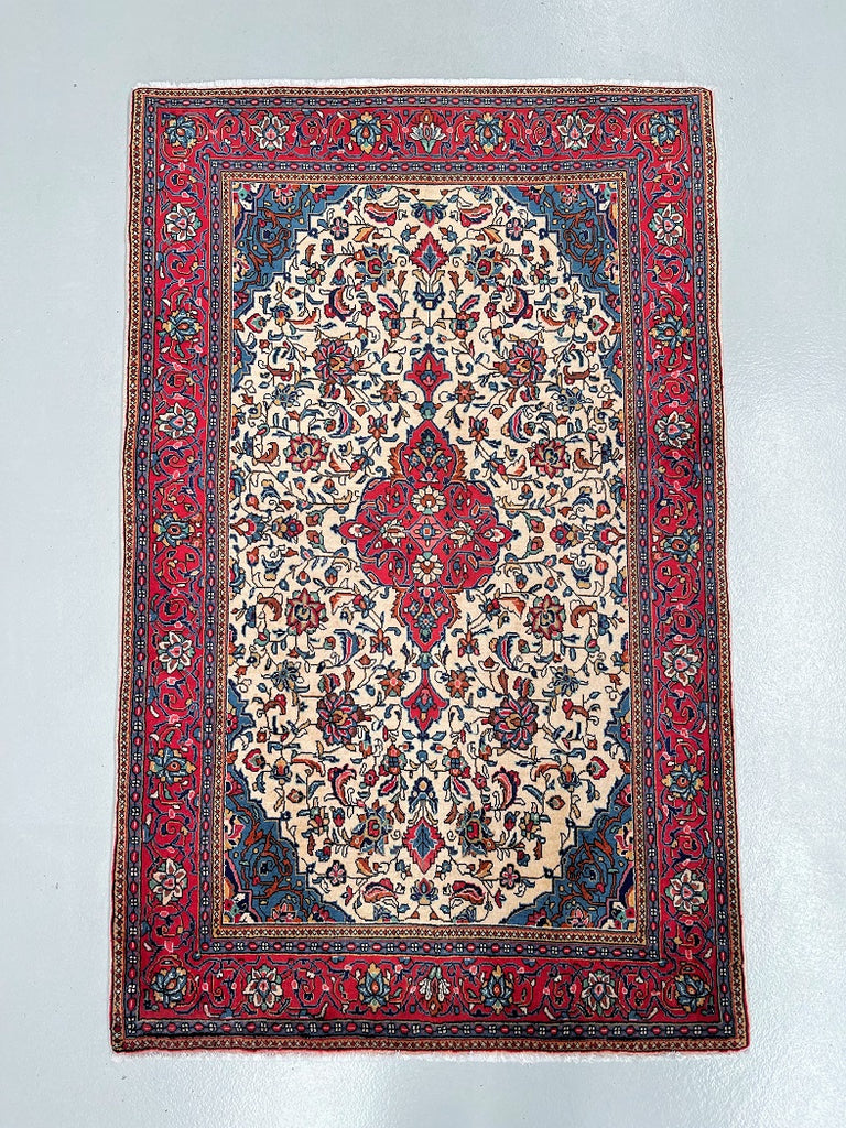 Superb Coffee Table Size Authentic Handmade Persian Sarough Rug. Above All It Has a Pure Lamb’s Wool Pile on Cotton Base. Beige, Blues, Red, Brown, Orange and Pink Tone Dyed Using Traditional Methods. Fine Quality Piece from City Of Arak.